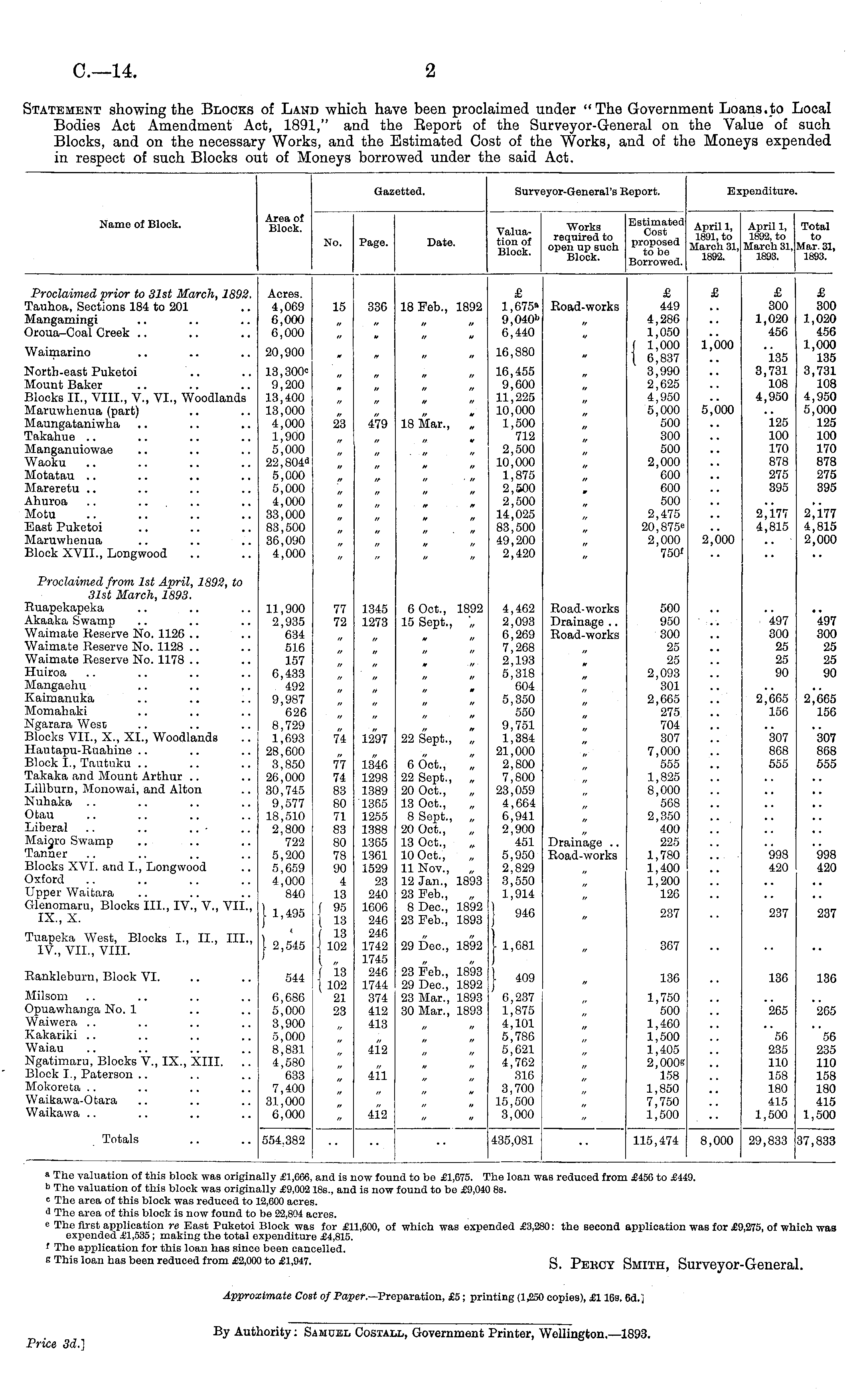Statement showing the Blocks of Land which have been proclaimed under "The Government Loans to Local Bodies Act Amendment Act, 1891," and the Report of the Surveyor-General on the Value of such Blocks, and on the necessary Works, and the Estimated Cost of the Works, and of the Moneys expended in respect of such Blocks out of Moneys borrowed under the said Act.