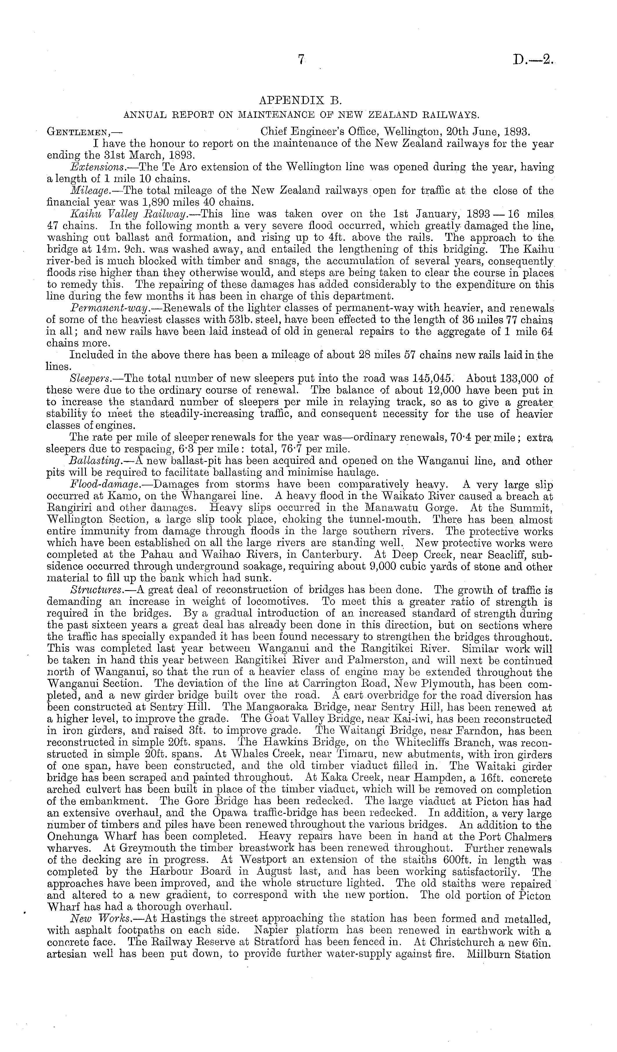 APPENDIX B. ANNUAL REPORT ON MAINTENANCE OP NEW ZEALAND RAILWAYS. Gentlemen, — Chief Engineer's Office, Wellington, 20th June, 1893. I have the honour to report on the maintenance of the New Zealand railways for the year ending the 31st March, 1893. Extensions. —The Te Aro extension of the Wellington line was opened during the year, having a length of 1 mile 10 chains. Mileage. —The total mileage of the New Zealand railways open for traffic at the close of the financial year was 1,890 miles 40 chains. Kaihu Valley Railway. —This line was taken over on the Ist January, 1893 —16 miles 47 chains. In the following month a very severe flood occurred, which greatly damaged the line, washing out ballast and formation, and rising up to 4ft. above the rails. The approach to the bridge at 14m. 9ch. was washed away, and entailed the lengthening of this bridging. The Kaihu river-bed is much blocked with timber and snags, the accumulation of several years, consequently floods rise higher than they otherwise would, and steps are being taken to clear the course in places to remedy this. The repairing of these damages has added considerably to the expenditure on this line during the few months it has been in charge of this department. Permanent-way. —Eenewals of the lighter classes of permanent-way with heavier, and renewals of some of the heaviest classes with 531b. steel, have been effected to the length of 36 miles 77 chains in all; and new rails have been laid instead of old in general repairs to the aggregate of 1 mile 64 chains more. Included in the above there has been a mileage of about 28 miles 57 chains new rails laid in the lines. Sleepers. —The total number of new sleepers put into the road was 145,045. About 133,000 of these were due to the ordinary course of renewal. The balance of about 12,000 have been put in to increase the standard number of sleepers per mile in relaying track, so as to give a greater stability to meet the steadily-increasing traffic, and consequent necessity for the use of heavier classes of engines. The rate per mile of sleeper renewals for the year was—ordinary renewals, 70-4 per mile ; extra sleepers due to respacing, 6-3 per mile : total, 76-7 per mile. Ballasting. —A new ballast-pit has been acquired and opened on the Wanganui line, and other pits will be required to facilitate ballasting and minimise haulage. Flood-damage. —Damages from storms have been comparatively heavy. A very large slip occurred at Kamo, on the Whangarei line. A heavy flood in the Waikato Biver caused a breach at Rangiriri and other damages. Heavy slips occurred in the Manawatu Gorge. At the Summit, Wellington Section, a large slip took place, choking the tunnel-mouth. There has been almost entire immunity from damage through floods in the large southern rivers. The protective works which have been established on all the large rivers are standing well. New protective works were completed at the Pahau and Waihao Bivers, in Canterbury. At Deep Creek, near Seacliff, subsidence occurred through underground soakage, requiring about 9,000 cubic yards of stone and other material to fill up the bank which had sunk. Structures. —A great deal of reconstruction of bridges has been done. The growth of traffic is demanding an increase in weight of locomotives. To meet this a greater ratio of strength is required in the bridges. By a gradual introduction of an increased standard of strength during the past sixteen years a great deal has already been done in this direction, but on sections where the traffic has specially expanded it has been found necessary to strengthen the bridges throughout. This was completed last year between Wanganui and the Bangitikei Biver. Similar work will be taken in hand this year between Bangitikei Biver and Palmerston, and will next be continued north of Wanganui, so that the run of a heavier class of engine may be extended throughout the Wanganui Section. The deviation of the line at Carrington Boad, New Plymouth, has been completed, and a new girder bridge built over the road. A cart overbridge for the road diversion has Been constructed at Sentry Hill. The Mangaoraka Bridge, near Sentry Hill, has been renewed at a higher level, to improve the grade. The Goat Valley Bridge, near Kai-iwi, has been reconstructed in iron girders, and raised 3ft. to improve grade. The Waitangi Bridge, near Earndon, has been reconstructed in simple 20ft. spans. The Hawkins Bridge, on the Whitecliffs Branch, was reconstructed in simple 20ft. spans. At Whales Creek, near Timaru, new abutments, with iron girders of one span, have been constructed, and the old timber viaduct filled in. The Wait aid girder bridge has been scraped and painted throughout. At Kaka Creek, near Hampden, a 16ft. concrete arched culvert has been built in place of the timber viaduct, which will be removed on completion of the embankment. The Gore Bridge has been redecked. The large viaduct at Picton has had an extensive overhaul, and the Opawa traffic-bridge has been redecked. In addition, a very large number of timbers and piles have been renewed throughout the various bridges. An addition to the Onehunga Wharf has been completed. Heavy repairs have been in hand at the Port Chalmers wharves. At Greymouth the timber breastwork has been renewed throughout. Further renewals of the decking are in progress. At W T estport an extension of the staiths 600 ft. in length was completed by the Harbour Board in August last, and has been working satisfactorily. The approaches have been improved, and the whole structure lighted. The old staiths were repaired and altered to a new gradient, to correspond with the new portion. The old portion of Picton Wharf has had a thorough overhaul. New Works. —At Hastings the street approaching the station has been formed and metalled, with asphalt footpaths on each side. Napier platform has been renewed in earthwork with a concrete face. The Bailway Beserve at Stratford has be