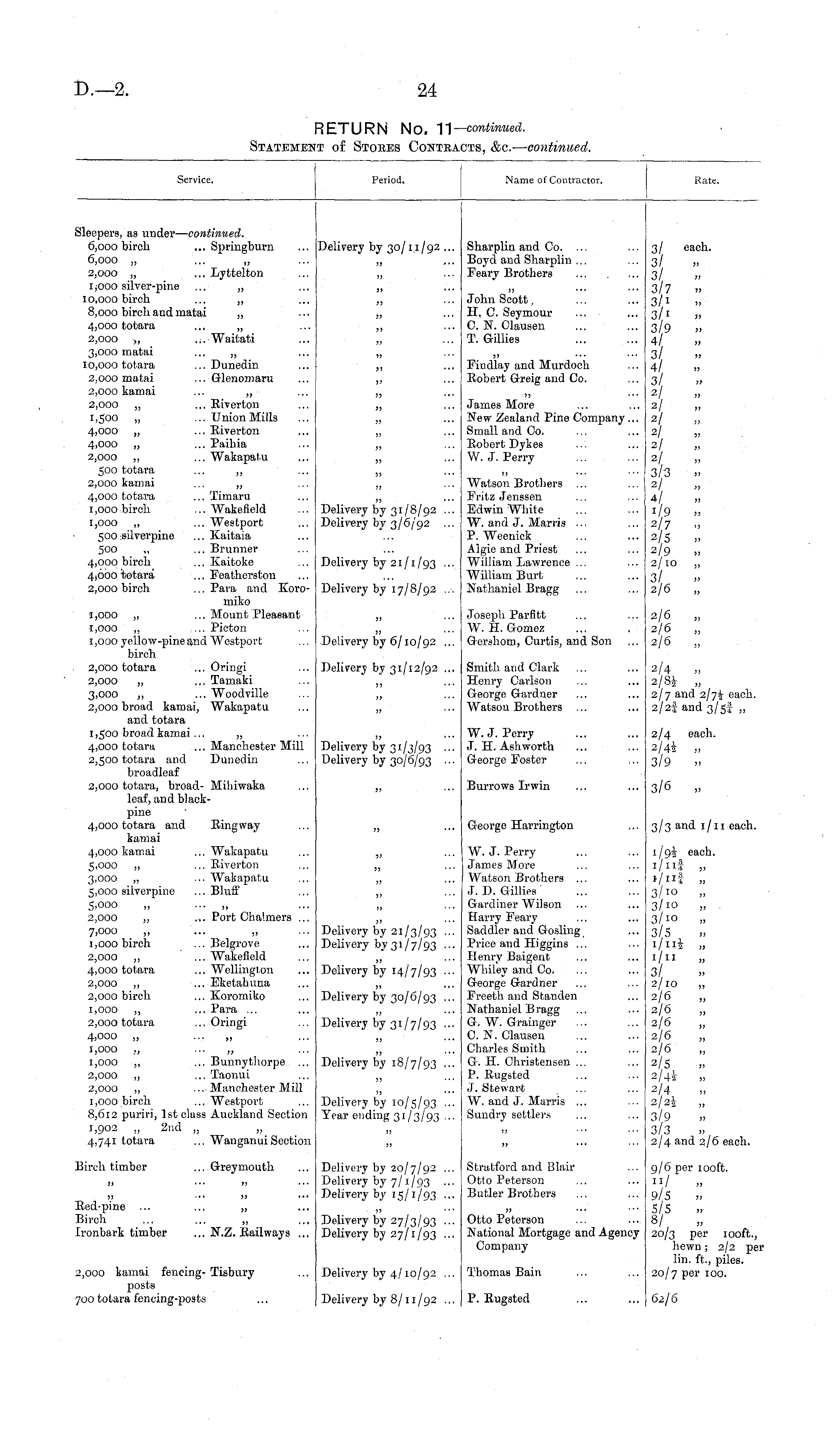 Service. Period. Name of Contractor. Rate. Sleepers, as under — continued. 6,000 birch ... Springburn 6,000 „ ... „ 2,000 „ ... Lyttelton 1 jOOO silver-pine ... „ 10,000 birch ... ,, 8,000 birch and matai ,, 4,000 totara ... „ 2,000 ,, ... Waitati 3,000 matai ... ,, 10,000 totara ... Dunedin 2,000 matai ... Glenomaru 2,000 kamai ... „ 2,000 „ ... Riverton 1,500 „ ... Union Mills 4,000 ,, ... Riverton 4,000 „ ... Paihia 2,000 ,, ... Wakapatu 500 totara ... ,, 2,000 kamai ... „ 4,000 totara ... Timaru 1,000 birch ... Wakefield 1,000 „ ... Westport 500 silverpine ... Kaitaia 500 ,, ... Brunner 4,000 birch ... Kaitoke 4,000 totara ... Featherston 2,000 birch ... Para and Koromiko 1,000 ,, ... Mount Pleasant 1,000 „ ... Pieton 1,000 yellow-pine and Westport birch 2,000 totara ... Oringi 2,000 ,, ... Tamaki 3,000 „ ... Woodville 2,000 broad kamai, Wakapatu and totara 1,500 broad kamai... ,, 4,000 totara ... Manchester Mill 2,500 totara and Dunedin broadleaf 2,000 totara, broad- Mihiwaka leaf, and blackpine 4,000 totara and Ring way kamai 4,000 kamai ... Wakapatu 5,000 „ ... Riverton 3,000 ,, ... Wakapatu 5,000 eilverpine ...Bluff 5.000 ,, ... ,, 2,000 ,, ... Port Chalmers ... 7,000 ,, ... ,, 1,000 birch ... Belgrove 2,000 „ ... Wakefield 4,000 totara ...Wellington 2,000 ,, ... Eketahuna 2,000 birch ... Koromiko 1,000 ,, ... Para ... 2,000 totara ... Oringi 4,000 „ ... „ 1,000 ,, ... „ 1,000 ,, ... Bunnythorpo ... 2,000 ,, ... Taonui 2,000 ,, ... Manchester Mill 1,000 birch ... Westport 8,612 puriri, 1st class Auckland Section 1,902 ,, 2nd ,, „ 4,741 totara ... WanganuiSection Delivery by 30/1.1/92 ... ,, *.. ,, ,, ,, ,, ,, ,, Delivery by 31/8/92 ... Delivery by 3/6/92 Delivery by 21 /1 /93 ... Delivery by 17/8/92 ... Delivery by 6/10/92 ... Delivery by 31/12/92 ... Sharplin and Co. ... Boyd and Sharplin ... Feary Brothers John Scott H. C. Seymour C. N. Clausen T. Gillies Findlay and Murdoch Robert G-reig and Co. James More New Zealand Pine Company ... Small and Co. Robert Dvkes W.J. Perry Watson Brothers Fritz Jenssen Edwin White W. and J. Marris ... P. Weenick Algie and Priest William Lawrence ... William Burt Nathaniel Bragg Joseph Parfitt W. H. Gomez Gershom, Curtis, and Son Smith and Clark Henry Carlson George Gardner Watson Brothers 3/ each. 3/ „ 3/ 3/7 3/1 „ 3/1 » 3/9 4/ ■ 3/ 4/ 3/ 2/ 2/ ;; 2/ 2/ ;; 2/ 2/ ;; 3/3 2/ 4/ l/9 w 2/7 2/5 ;; 2/9 2/10 „ 3/ 2/6 „ 2/6 „ 2/6 „ 2/6 2/4 „ 2/8i „ 2/7 and 2/7-i- each. 2/2jand3/5f „ ,, ,, Delivery by 31/3/93 ... Delivery by 30/6/93 ... W.J. Perry J. H. Ash worth George Foster 2/4 each. 2/44 „ 3/9 Burrows Irwin 3/6 „ George Harrington 3/3 and 1/11 each. ,, Delivery by 21/3/93 ■■■ Delivery by 31/7/93 ... Delivery by 14/7/93 ... Delivery by 30/6/93 ... W.J. Perry James More Watson Brothers ... J. D. Gillies Gardiner Wilson Harry Feary Saddler and Gosling Price and Higgins ... Henry Baigent Whiley and Co. George Gardner Freeth and Standen Nathaniel Bragg G. W. Grainger C. N. Clausen Charles Smith G. H. Christensen ... P. Rugsted J. Stewart W. and J. Marris ... Sundry settlers i/9i each. l/"T ,. */"J „ 3/'O 3/10 ,. 3/10 „ 3/S i/"i „ in „ 3 2/10 „ 2/6 2/6 2/6 2/6 „ 2/6 2/5 a/4* » 2/4 2/2-I „ 3/9 3/3 2/4 and 2/6 each. Delivery by 31/7/93 ... Delivery by 18/7/93 ■•■ Delivery by 10/5/93 ■■• Year ending 31/3/93 ... Birch timber ... Grey mouth ,, ... ,, Delivery by 20/7/92 ... Delivery by 7/1/93 Delivery by 15/1/93 ... Stratford and Blair Otto Peterson Butler Brothers 9/6 per 1 ooft. w ,. 9/5 5/5 8/ 20/3 per 1 ooft., hewn; 2/2 per lin. ft., piles. 20/7 per 100. 3) ■•■ J) •■• Red-pine ... ... „ Birch ... ... ,, Ironbark timber ... N.Z. Railways ... Delivery by 27/3/93 ... Delivery by 27/1/93 ... Otto Peterson National Mortgage and Agency Company 2,000 kamai fencing-Tisbury posts 700 totara fencing-posts Delivery by 4/10/92 ... Thomas Bain Delivery by 8/11/92 ... P. Rugsted 62/6