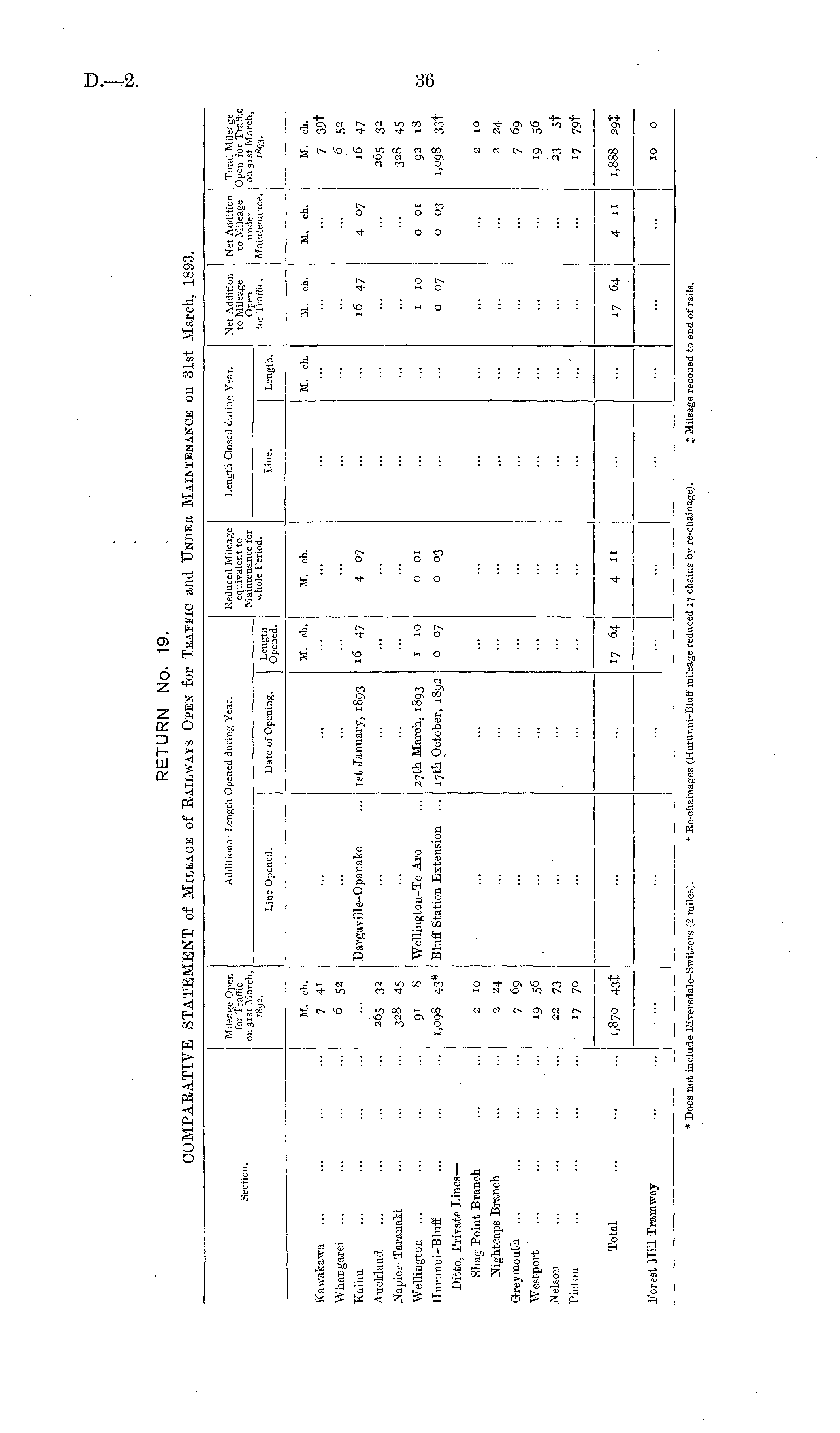 Section. Mileage Open for Traffic on 31st March, 1S92. Additional Length Opened during Year. Reduced Mileage equivalent to Length Closed during Year. Net Addition Net Addition to Mileage to Mileage Open under for Traffic. Maintenance. Total Mileage Open for Traffic on 31st March, 1893. whole Period. Line Opened. Date of Opening. Length Opened. Line. Length. M. eh. H. ch. M. ch. M. ch. M. ch. M. ch. M. ch. 7 39t Ivawahawa 7 4i ... Whangarei 6 52 6 52 16 47 Eaihu Dargayille-Opanake 1st January, 1893 16 47 4 07 16 47 4 07 Auckland 265 32 265 32 Napier-Taranalu 328 45 328 45 Wellington 91 8 Wellington-Te Aro 27th March, 1893 I 10 o 01 I 10 o 01 92 18 Hurunui-B luff 1,098 43* Bluff Station Extension 17th October, 1892 o 07 0 03 o 07 o 03 1.098 33+ Ditto, Private Lines — Shag Point Branch Nightcaps Branch 2 10 2 10 2 24 2 24 Greymouth 7 6 9 7 69 Westport 19 56 19 5<5 Nelson 22 73 23 5+ Picton 17 70 ... 17 79+ Total . 1.870 43+ 17 64 4 11 17 64 4 11 1,888 29! ... Forest Hill Tramway I ... 10 O * Does not include Eiversdale-£ Iwitzers (2 miles). t Ee-ch.abia.ges (Humnui-Bluff mileage reduced chains b; re-chama< ;e). J Mileage reeoned to end of rails.