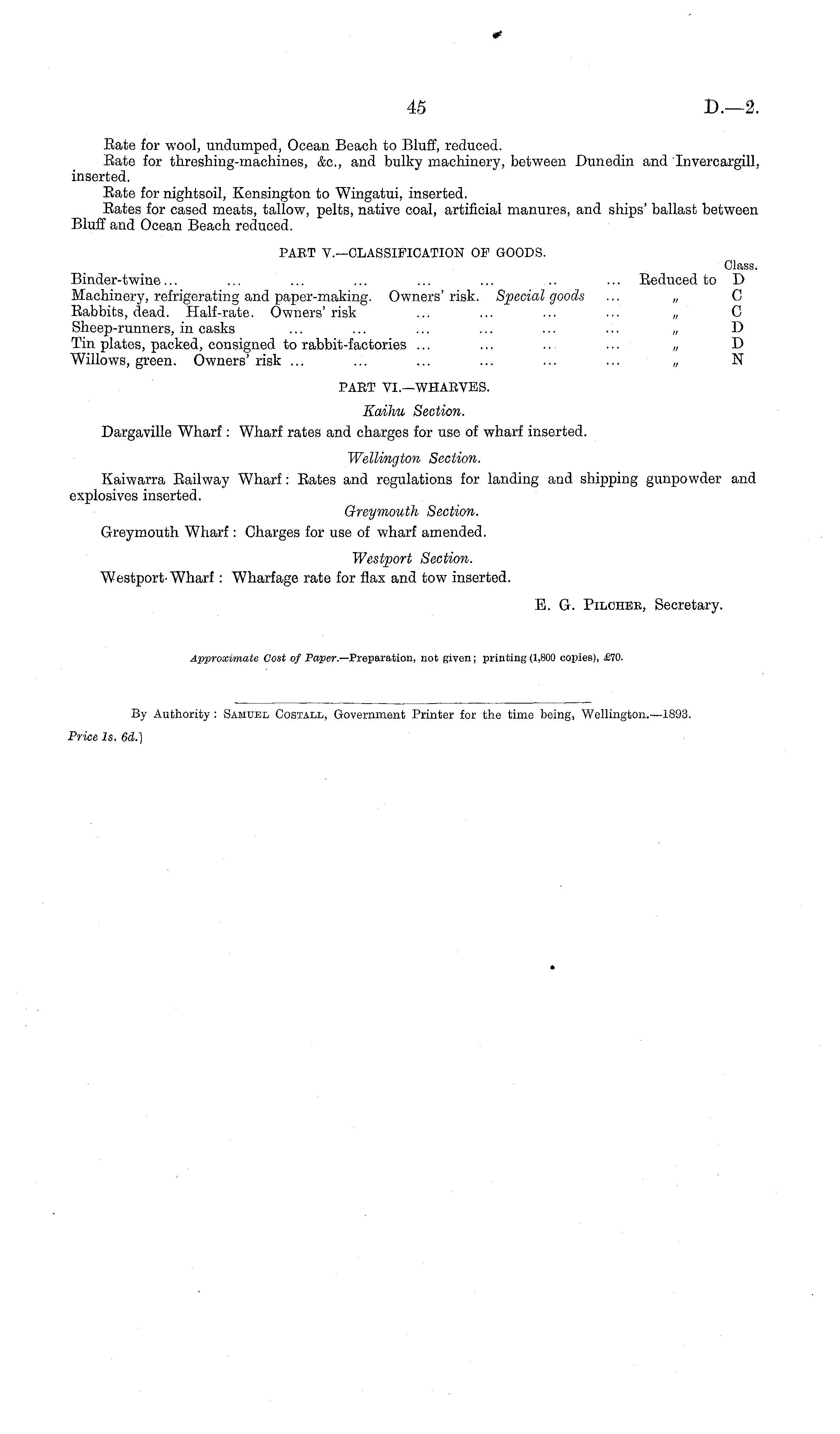 Rate for wool, undumped, Ocean Beach to Bluff, reduced. Rate for threshing-machines, &c, and bulky machinery, between Dunedin and Invercargill, inserted. Rate for nightsoil, Kensington to Wingatui, inserted. Rates for cased meats, tallow, pelts, native coal, artificial manures, and ships' ballast between Bluff and Ocean Beach reduced. PART V.—CLASSIFICATION OF GOODS. Class. Binder-twine... ... ... ... ... ... .. ... Reduced to D Machinery, refrigerating and paper-making. Owners'risk. Special goods ... „ C Rabbits, dead. Half-rate. Owners'risk ... ... ... ... „ C Sheep-runners, in casks ... ... ... ... ... ... „ D Tin plates, packed, consigned to rabbit-factories ... ... .. ... „ D Willows, green. Owners' risk ... ... ... ... ... ... „ N PART VI.—WHARVES. Kaihu Section. Dargaville Wharf : Wharf rates and charges for use of wharf inserted. Wellington Section. Kaiwarra Railway Wharf: Rates and regulations for landing and shipping gunpowder and explosives inserted. Greymouth Section. Greymouth Wharf: Charges for use of wharf amended. Westport Section. Westport-Wharf: Wharfage rate for flax and tow inserted. E. G. Pilcher, Secretary.