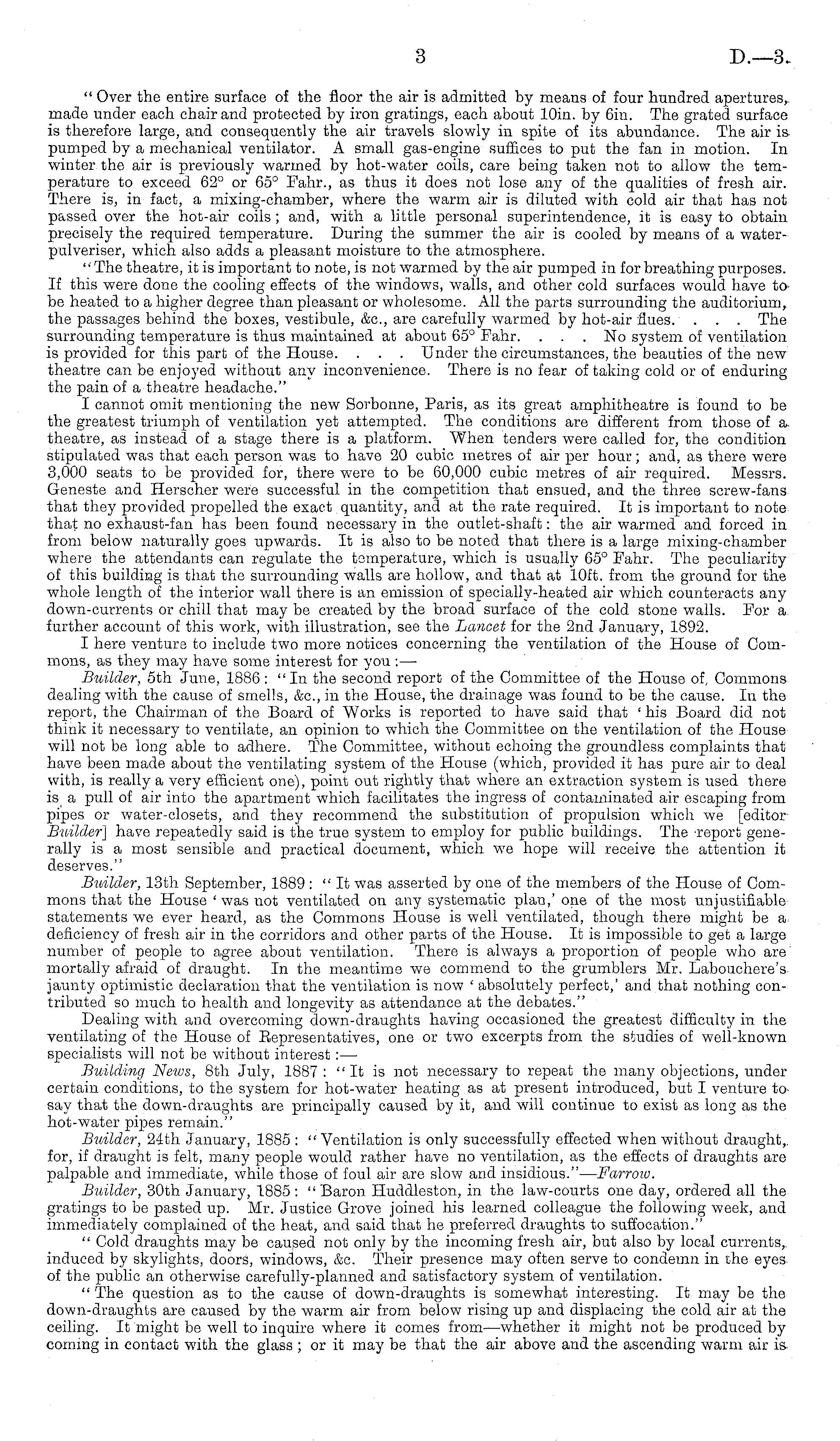 " Over the entire surface of the floor the air is admitted by means of four hundred apertures, made under each chair and protected by iron gratings, each about 10in. by 6in. The grated surface is therefore large, and consequently the air travels slowly in spite of its abundance. The air ia pumped by a mechanical ventilator. A small gas-engine suffices to put the fan in motion. In winter the air is previously warmed by hot-water coils, care being taken not to allow the temperature to exceed 62° or 65° Fahr., as thus it does not lose any of the qualities of fresh air. There is, in fact, a mixing-chamber, where the warm air is diluted with cold air that has not passed over the hot-air coils ; and, with a little personal superintendence, it is easy to obtain precisely the required temperature. During the summer the air is cooled by means of a waterpulveriser, which also adds a pleasant moisture to the atmosphere. "The theatre, it is important to note, is not warmed by the air pumped in for breathing purposes. If this were done the cooling effects of the windows, walls, and other cold surfaces would have to be heated to a higher degree than pleasant or wholesome. All the parts surrounding the auditorium, the passages behind the boxes, vestibule, &c, are carefully warmed by hot-air flues. . . . The surrounding temperature is thus maintained at about 65° Fahr. . . . No system of ventilation is provided for this part of the House. . . . Under the circumstances, the beauties of the new theatre can be enjoyed without any inconvenience. There is no fear of taking cold or of enduring the pain of a theatre headache." I cannot omit mentioning the new Sorbonne, Paris, as its great amphitheatre is found to be the greatest triumph of ventilation yet attempted. The conditions are different from those of a theatre, as instead of a stage there is a platform. When tenders were called for, the condition stipulated was that each person was to have 20 cubic metres of air per hour; and, as there were 3,000 seats to be provided for, there were to be 60,000 cubic metres of air required. Messrs. Geneste and Herscher were successful in the competition that ensued, and the three screw-fans that they provided propelled the exact quantity, and at the rate required. It is important to note that no exhaust-fan has been found necessary in the outlet-shaft: the air warmed and forced in from below naturally goes upwards. It is also to be noted that there is a large mixing-chamber where the attendants can regulate the temperature, which is usually 65° Fahr. The peculiarity of this building is that the surrounding walls are hollow, and that at 10ft. from the ground for the whole length of the interior wall there is an emission of specially-heated air which counteracts any down-currents or chill that may be created by the broad surface of the cold stone walls. For a further account of this work, with illustration, see the Lancet for the 2nd January, 1892. I here venture to include two more notices concerning the ventilation of the House of Commons, as they may have some interest for you : — Builder, sth June, 1886 : "In the second report of the Committee of the House of Commons dealing with the cause of smells, &c, in the House, the drainage was found to be the cause. In the report, the Chairman of the Board of Works is reported to have said that ' his Board did not think it necessary to ventilate, an opinion to which the Committee on the ventilation of the House will not be long able to adhere. The Committee, without echoing the groundless complaints that have been made about the ventilating system of the House (which, provided it has pure air to deal with, is really a very efficient one), point out rightly that where an extraction system is used there is a pull of air into the apartment which facilitates the ingress of contaminated air escaping from pipes or water-closets, and they recommend the substitution of propulsion which we [editor Builder] have repeatedly said is the true system to employ for public buildings. The report generally is a most sensible and practical document, which we hope will receive the attention it deserves." Builder, 13th September, 1889 : "It was asserted by one of the members of the House of Commons that the House ' was not ventilated on any systematic plan,' one of the most unjustifiable statements we ever heard, as the Commons House is well ventilated, though there might be a deficiency of fresh air in the corridors and other parts of the House. It is impossible to get a large number of people to agree about ventilation. There is always a proportion of people who are mortally afraid of draught. In the meantime we commend to the grumblers Mr. Labouchere's jaunty optimistic declaration that the ventilation is now ' absolutely perfect,' and that nothing contributed so much to health and longevity as attendance at the debates." Dealing with and overcoming down-draughts having occasioned the greatest difficulty in the ventilating of the House of Eepresentatives, one or two excerpts from the studies of well-known specialists will not be without interest: — Building Neivs, Bth July, 1887 : " It is not necessary to repeat the many objections, under certain conditions, to the system for hot-water heating as at present introduced, but I venture to say that the down-draughts are principally caused by it, and will continue to exist as long as the hot-water pipes remain." Builder, 24th January, 1885 : " Ventilation is only successfully effected when without draught,, for, if draught is felt, many people would rather have no ventilation, as the effects of draughts are palpable and immediate, while those of foul air are slow and insidious."— Farrow. Builder, 30th January, 1885 : " Baron Huddleston, in the law-courts one day, ordered all the gratings to be pasted up. Mr. Justice Grove joined his learned colleague the following week, and immediately complained of the heat, and said that he preferred d