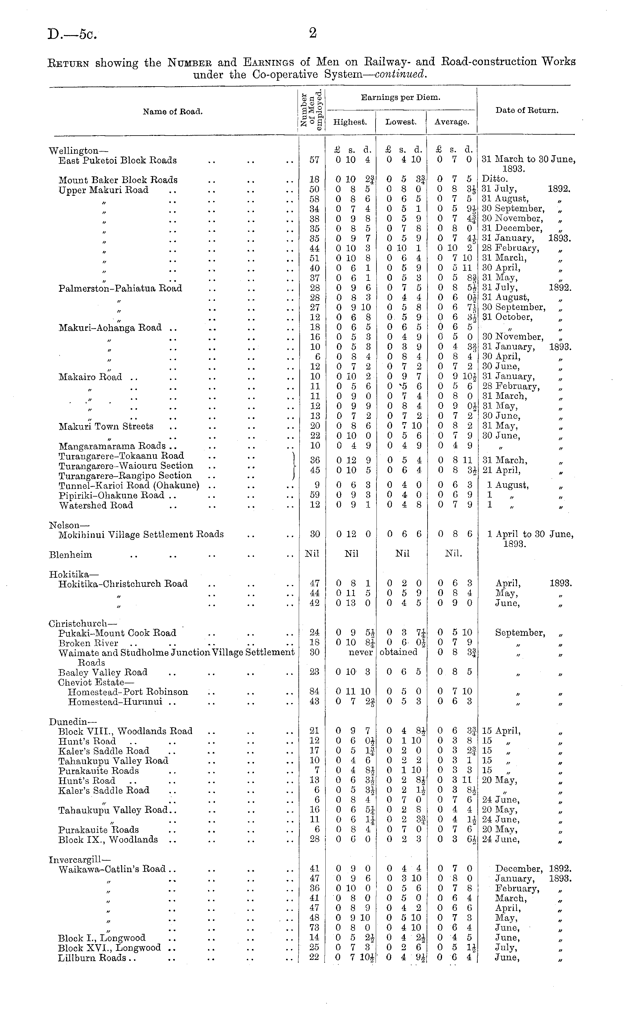 Name of Road. 3 a $ Earnings per Diem. Date of Return. Highest. Lowest. Average. ("Wellington— East Puketoi Block Roads 57 £ s. d. 0 10 4 £ s. d. 0 4 10 £ s. d. 0 7 0 31 March to 30 June, 1893. Ditto. 31 July, 1892. 31 August, „ 30 September, „ 30 November, „ 31 December, „ 31 January, 1893. 28 February, „ 31 March, 30 April, 31 May, 31 July, 1892. 31 August, „ 30 September, 31 October, Mount Baker Block Roads Upper Makuri Road Palmerston-Pahiatua Road 18 50 58 34 38 35 35 44 51 40 37 28 28 27 12 18 16 10 6 12 10 11 11 12 13 20 22 10 0 10 2f 0 8 5 0 8 6 0 7 4 0 9 8 0 8 5 0 9 7 0 10 3 0 10 8 0 6 1 0 6 1 0 9 6 0 8 3 0 9 10 0 6 8 0 6 5 0 5 3 0 5 3 0 8 4 0 7 2 0 10 2 0 5 6 0 9 0 0 9 9 0 7 2 0 8 6 0 10 0 0 4 9 0 5 8f 0 8 0 0 6 5 0 5 1 0 5 9 0 7 8 0 5 9 0 10 1 0 6 4 0 5 9 0 5 3 0 7 5 0 4 4 0 5 8 0 5 9 0 6 5 0 4 9 0 3 9 0 8 4 0 7 2 0 9 7 0-5 6 0 7 4 0 8 4 0 7 2 0 7 10 0 5 6 0 4 9 0 7 5 0 8 3* 0 7 5 0 5 94 0 7 4} 0 8 0 0 7 4} 0 10 2 0 7 10 0 5 11 0 5 8f 0 8 5* 0 6 0* 0 6 7* 0 6 3* 0 6 5 0 5 0 0 4 3§ 0 8 4' 0 7 2 0 9 10* 0 5 6 0 8 0 0 9 0* 0 7 2 0 8 2 0 7 9 0 4 9 Makuri-Aohanga Road .. 30 November, 31 January, 1893. 30 April, 30 June, 31 January, „ 28 February, 31 March, 31 May, 30 June, 31 May, 30 June, „ „ .. .. . • .. Makairo Road Makuri Town Streets Mangaramarama Roads Turangarere-Tokaanu Road .. .. j Turangarere-Waiouru Section .. .. \ Turangarere-Rangipo Section .. .. J Tunnel-Karioi Road (Ohakune) Pipiriki-Ohakune Road Watershed Road 36 45 0 12 9 0 10 5 0 5 4 0 6 4 0 8 11 0 8 3* 31 March, „ 21 April, 9 59 12 0 6 3 0 9 3 0 9 1 0 4 0 0 4 0 0 4 8 0 6 3 0 6 9 0 7 9 1 August, „ 1 1 STelson— Mokihinui Village Settlement Roads 30 0 12 0 0 6 6 0 8 6 1 April to 30 June, 1893. 31enheim Nil Nil Nil Nil. jlokitika— Hokitika-Christchurch Road 47 44 42 0 8 1 0 11 5 0 13 0 0 2 0 0 5 9 0 4 5 0 6 3 0 8 4 0 9 0 April, 1893. May, June, „ Jhristchurch— Pukaki-Mount Cook Road Broken River Waimate and Studholme Junction Village Settlement Roads Bealey Valley Road Cheviot Estate — Homestead-Port Robinson Homestead-Hurunui .. 24 18 30 23 0 9 5* 0 10 81 never 0 10 3 0 3 71 0 0 0* obtained 0 6 5 0 5 10 0 7 9 0 8 3J September, 0 8 5 84 43 0 11 10 0 7 2| 0 5 0 0 5 3 0 7 10 0 6 3 Dunedin— Block VIII., Woodlands Road Hunt's Road Kaler's Saddle Road Tahaukupu Valley Road Purakauite Roads Hunt's Road Kaler's Saddle Road 21 12 17 10 7 13 6 6 16 11 6 28 0 9 7 0 6 0* 0 5 If 0 4 6 0 4 8* 0 6 3* 0 5 3* 0 8 4 0 6 51 0 6 11 0 8 4 0 6 0 0 4 8* 0 1 10 0 2 0 0 2 2 0 1 10 0 2 8* 0 2 1* 0 7 0 0 2 8 0 2 3| 0 7 0 0 2 3 0 6 3J 0 3 8 0 3 2| 0 3 1 0 3 3 0 3 11 0 3 8* 0 7 6 0 4 4 0 4 1* 0 7 6* 0 3 6* 15 April, 15 „ 15 „ 15 „ 15 „ 20 May, Tahaukupu Valley Road.. Purakauite Roads Block IX., Woodlands .. 24 June, „ 20 May, 24 June, 20 May, 24 June, „ — Waikawa-Catlin's Road 41 47 36 41 47 48 73 14 25 22 0 9 0 0 9 6 0 10 0 0 8 0 0 8 9 0 9 10 0 8 0 0 5 2* 0 7 3 0 7 10* 0 4 4 0 3 10 0 5 6 0 5 0 0 4 2 0 5 10 0 4 10 0 4 2* 0 2 6 0 4 9* 0 7 0 0 8 0 0 7 8 0 6 4 0 6 6 0 7 3 0 6 4 0 4 5 0 5 1* 0 6 4 December, 1892. January, 1893. February, „ March, April, „ May, June, „ June, „ July, June, „ Block I., Longwood Block XVI., Longwood .. Lillburn Roads