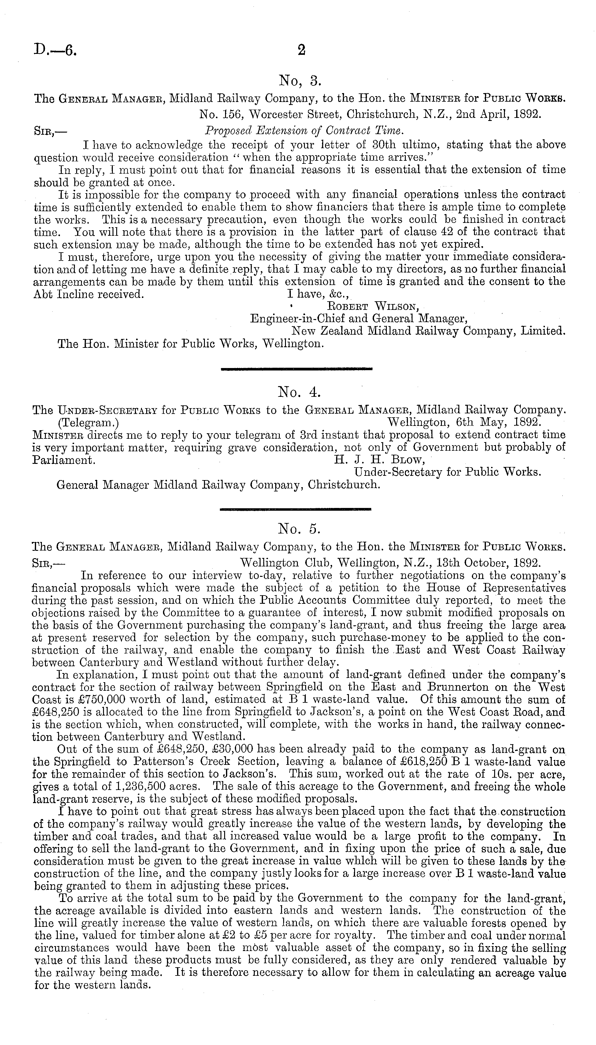 No. 5. The General Manager, Midland Eailway Company, to the Hon. the Minister for Public Works. Sir,— Wellington Club, Wellington, N.Z., 13th October, 1892. In reference to our interview to-day, relative to further negotiations on the company's financial proposals which were made the subject of a petition to the House of Eepresentatives during the past session, and on which the Public Accounts Committee duly reported, to meet the objections raised by the Committee to a guarantee of interest, I now submit modified proposals on the basis of the Government purchasing the company's land-grant, and thus freeing the large area at present reserved for selection by the company, such purchase-money to be applied to the construction of the railway, and enable the company to finish the East and West Coast Eailway between Canterbury and Westland without further delay. In explanation, I must point out that the amount of land-grant defined under the company's contract for the section of railway between Springfield on the East and Brunnerton on the West Coast is £750,000 worth of land, estimated at B 1 waste-land value. Of this amount the sum of £648,250 is allocated to the line from Springfield to Jackson's, a point on the West Coast Eoad, and is the section which, when constructed, will complete, with the works in hand, the railway connection between Canterbury and Westland. Out of the sum of £648,250, £30,000 has been already paid to the company as land-grant on the Springfield to Patterson's Creek Section, leaving a balance of £618,250 B 1 waste-land value for the remainder of this section to Jackson's. This sum, worked out at the rate of 10s. per acre, gives a total of 1,236,500 acres. The sale of this acreage to the Government, and freeing the whole land-grant reserve, is the subject of these modified proposals. I have to point out that great stress has always been placed upon the fact that the.construction of the company's railway would greatly increase the value of the western lands, by developing the timber and coal trades, and that all increased value would be a large profit to the company. In offering to sell the land-grant to the Government, and in fixing upon the price of such a sale, due consideration must be given to the great increase in value which will be given to these lands by the construction of the line, and the company justly looks for a large increase over B 1 waste-land value being granted to them in adjusting these prices. To arrive at the total sum to be paid by the Government to the company for the land-grant, the acreage available is divided into eastern lands and western lands. The construction of the line will greatly increase the value of western lands, on which there are valuable forests opened by the line, valued for timber alone at £2 to £5 per acre for royalty. The timber and coal under normal circumstances would have been the most valuable asset of the company, so in fixing the selling value of this land these products must be fully considered, as they are only rendered valuable by the railway being made. It is therefore necessary to allow for them in calculating an acreage value for the western lands.