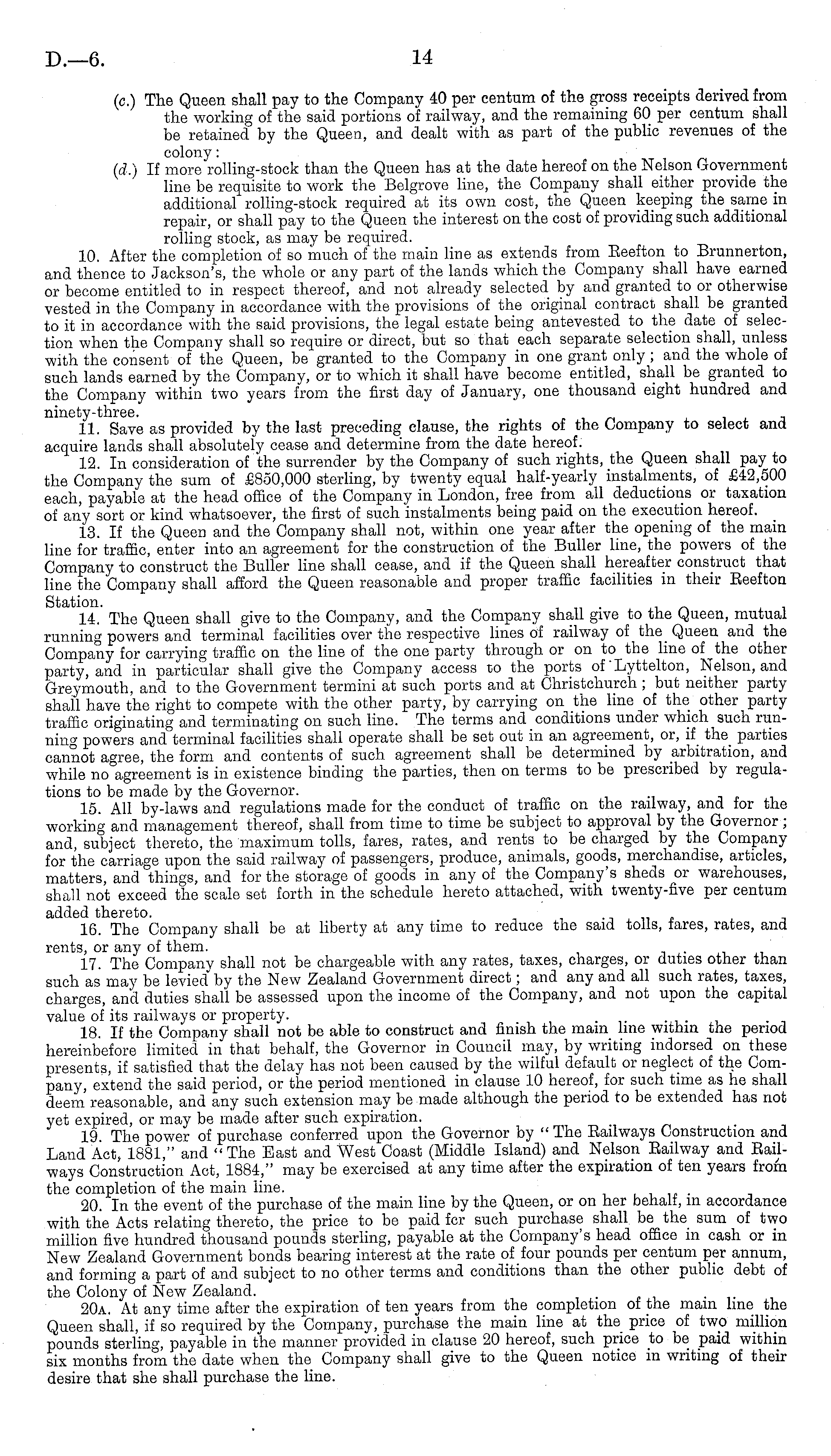 (c.) The Queen shall pay to the Company 40 per centum of the gross receipts derived from the working of the said portions of railway, and the remaining 60 per centum shall be retained by the Queen, and dealt with as part of the public revenues of the colony: (d.) If more rolling-stock than the Queen has at the date hereof on the Nelson Government line be requisite to work the Belgrove line, the Company shall either provide the additional rolling-stock required at its own cost, the Queen keeping the same in repair, or shall pay to the Queen the interest on the cost of providing such additional rolling stock, as may be required. 10. After the completion of so much of the main line as extends from Eeefton to Brunnerton, and thence to Jackson's, the whole or any part of the lands which the Company shall have earned or become entitled to in respect thereof, and not already selected by and granted to or otherwise vested in the Company in accordance with the provisions of the original contract shall be granted to it in accordance with the said provisions, the legal estate being antevested to the date of selection when the Company shall so require or direct, but so that each separate selection shall, unless with the consent of the Queen, be granted to the Company in one grant only ; and the whole of such lands earned by the Company, or to which it shall have become entitled, shall be granted to the Company within two years from the first day of January, one thousand eight hundred and ninety-three. 11. Save as provided by the last preceding clause, the rights of the Company to select and acquire lands shall absolutely cease and determine from the date hereof. 12. In consideration of the surrender by the Company of such rights, the Queen shall pay to the Company the sum of £850,000 sterling, by twenty equal half-yearly instalments, of £42,500 each, payable at the head office of the Company in London, free from all deductions or taxation of any sort or kind whatsoever, the first of such instalments being paid on the execution hereof. 13. If the Queen and the Company shall not, within one year after the opening of the mam line for traffic, enter into an agreement for the construction of the Buller line, the powers of the Company to construct the Buller line shall cease, and if the Queen shall hereafter construct that line the Company shall afford the Queen reasonable and proper traffic facilities in their Eeefton Station. , 14. The Queen shall give to the Company, and the Company shall give to the Queen, mutual running powers and terminal facilities over the respective lines of railway of the Queen and the Company for carrying traffic on the line of the one party through or on to the line of the other party, and in particular shall give the Company access to the ports of "Lyttelton, Nelson, and Greymouth, and to the Government termini at such ports and at Christchurch ; but neither party shall have the right to compete with the other party, by carrying on the line of the other party traffic originating and terminating on such line. The terms and conditions under which such running powers and terminal facilities shall operate shall be set out in an agreement, or, if the parties cannot agree, the form and contents of such agreement shall be determined by arbitration, and while no agreement is in existence binding the parties, then on terms to be prescribed by regulations to be made by the Governor. 15. All by-laws and regulations made for the conduct of traffic on the railway, and for the working and management thereof, shall from time to time be subject to approval by the Governor ; and, subject thereto, the maximum tolls, fares, rates, and rents to be charged by the Company for the carriage upon the said railway of passengers, produce, animals, goods, merchandise, articles, matters, and things, and for the storage of goods in any of the Company's sheds or warehouses, shall not exceed the scale set forth in the schedule hereto attached, with twenty-five per centum added thereto. . 16. The Company shall be at liberty at any time to reduce tne said tolls, tares, rates, and rents, or any of them. 17. The Company shall not be chargeable with any rates, taxes, charges, or duties other than such as may be levied" by the New Zealand Government direct; and any and all such rates, taxes, charges, and duties shall be assessed upon the income of the Company, and not upon the capital value of its railways or property. . . 18. If the Company shall not be able to construct and finish the mam line withm the period hereinbefore limited in that behalf, the Governor in Council may, by writing indorsed on these presents, if satisfied that the delay has not been caused by the wilful default or neglect of the Company, extend the said period, or the period mentioned in clause 10 hereof, for such time as he shall deem reasonable, and any such extension may be made although the period to be extended has not yet expired, or may be made after such expiration. 19. The power of purchase conferred upon the Governor by " The Eailways Construction and Land Act, 1881," and "The East and West Coast (Middle Island) and Nelson Eailway and Eailways Construction Act, 1884," may be exercised at any time after the expiration of ten years from the completion of the main line. , 20. In the event of the purchase of the main line by the Queen, or on her behalf, in accordance with the Acts relating thereto, the price to be paid for such purchase shall be the sum of two million five hundred thousand pounds sterling, payable at the Company's head office in cash or in New Zealand Government bonds bearing interest at the rate of four pounds per centum per annum, and forming a part of and subject to no other terms and conditions than the other public debt of the Colony of New Zealand. 20a. At any time after the expiration of ten years from the completion of the mam line the Queen shall, if so required by the Company, purchase the main line at the