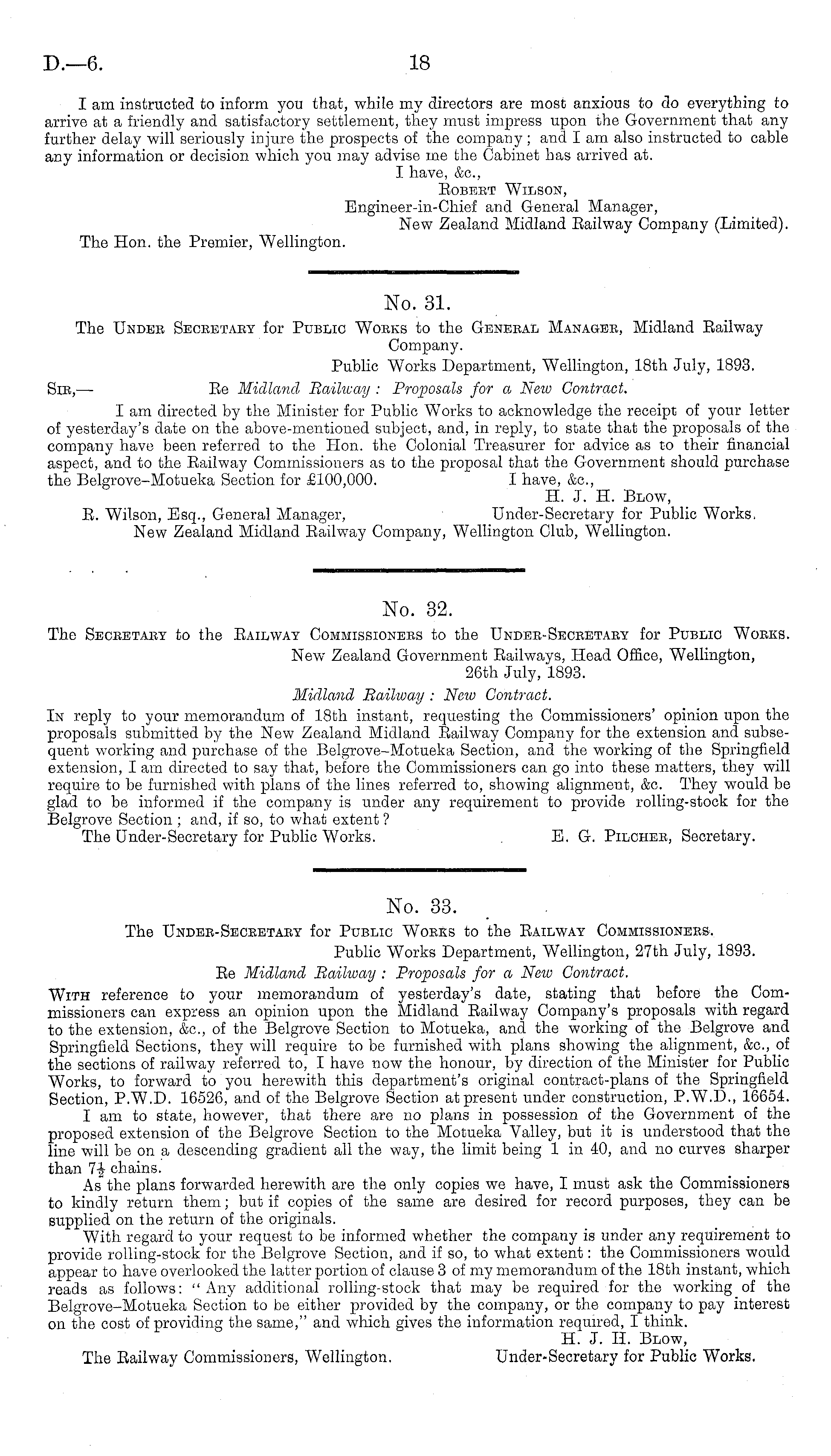 No. 31. The Under Secretary for Public Works to the General Manager, Midland Eailway Company. Public Works Department, Wellington, 18th July, 1893. Sir, — Ec Midland Bailway : Proposals for a Neiu Contract. I am directed by the Minister for Public Works to acknowledge the receipt of your letter of yesterday's date on the above-mentioned subject, and, in reply, to state that the proposals of the company have been referred to the Hon. the Colonial Treasurer for advice as to their financial aspect, and to the Eailway Commissioners as to the proposal that the Government should purchase the Belgrove-Motueka Section for £100,000. I have, &c, H. J. H. Blow, E. Wilson, Esq., General Manager, Under-Secretary for Public Works, New Zealand Midland Eailway Company, Wellington Club, Wellington.