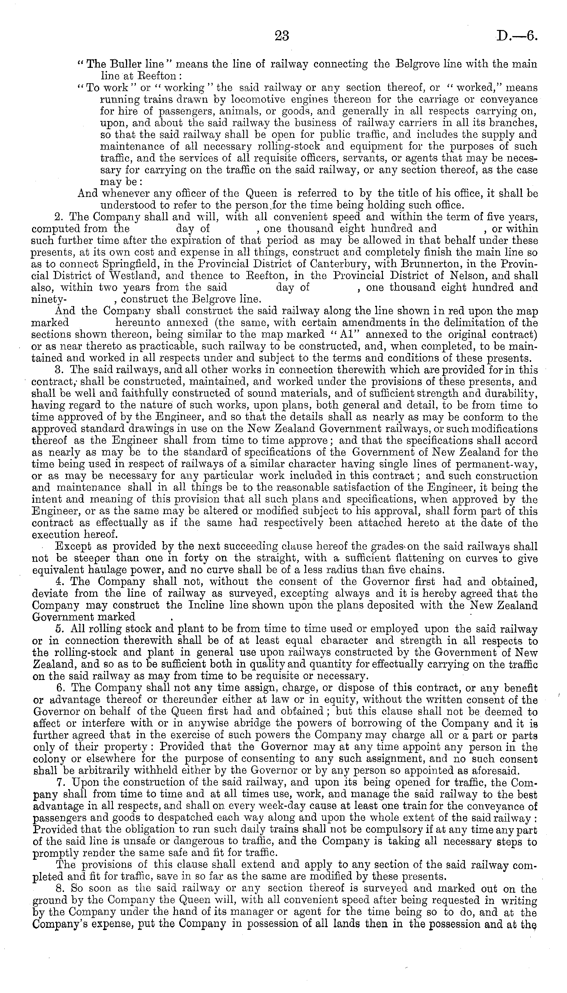 " The Buller line" means the line of railway connecting the Belgrove line with the main line at Eeefton: "To work " or " working " the said railway or any section thereof, or " worked," means running trains drawn by locomotive engines thereon for the carriage or conveyance for hire of passengers, animals, or goods, and generally in all respects carrying on, upon, and about the said railway the business of railway carriers in all its branches, so that the said railway shall be open for public traffic, and includes the supply and maintenance of all necessary rolling-stock and equipment for the purposes of such . traffic, and the services of all requisite officers, servants, or agents that may be necessary for carrying on the traffic on the said railway, or any section thereof, as the case may be: And whenever any officer of the Queen is referred to by the title of his office, it shall be understood to refer to the person,for the time being holding such office. 2. The Company shall and will, with all convenient speed and within the term of five years, computed from the day of , one thousand eight hundred and , or within such further time after the expiration of that period as may be allowed in that behalf under these presents, at its own cost and expense in all things, construct and completely finish the main line so as to connect Springfield, in the Provincial District of Canterbury, with Brunnerton, in the Provincial District of Westland, and thence to Eeefton, in the Provincial District of Nelson, and shall also, within two years from the said day of , one thousand eight hundred and ninety- , construct the Belgrove line. And the Company shall construct the said railway along the line shown in red upon the map marked hereunto annexed (the same, with certain amendments in the delimitation of the sections shown thereon, being similar to the map marked " Al" annexed to the original contract) or as near thereto as practicable, such railway to be constructed, and, when completed, to be maintained and worked in all respects under and subject to the terms and conditions of these presents. 3. The said railways, and all other w r orks in connection therewith which are provided for in this contract,- shall be constructed, maintained, and worked under the provisions of these presents, and shall be well and faithfully constructed of sound materials, and of sufficient strength and durability, having regard to the nature of such works, upon plans, both general and detail, to be from time to time approved of by the Engineer, and so that the details shall as nearly as may be conform to the approved standard drawings in use on the New Zealand Government railways, or such modifications thereof as the Engineer shall from time to time approve; and that the specifications shall accord as nearly as may be to the standard of specifications of the Government of New Zealand for the time being used in respect of railways of a similar character having single lines of permanent-way, or as may be necessary for any particular work included in this contract; and such construction and maintenance shall in all things be to the reasonable satisfaction of the Engineer, it being the intent and meaning of this provision that all such plans and specifications, when approved by the Engineer, or as the same may be altered or modified subject to his approval, shall form part of this contract as effectually as if the same had respectively been attached hereto at the date of the execution hereof. Except as provided by the next succeeding clause hereof the grades-on the said railways shall not be steeper than one in forty on the straight, with a sufficient flattening on curves to give equivalent haulage power, and no curve shall be of a less radius than five chains. 4. The Company shall not, without the consent of the Governor first had and obtained, deviate from the line of railway as surveyed, excepting always and it is hereby agreed that the Company may construct the Incline line shown upon the plans deposited with the New Zealand Government marked 5. All rolling stock and plant to be from time to time used or employed upon the said railway or in connection therewith shall be of at least equal character and strength in all respects to the rolling-stock and plant in general use upon railways constructed by the Government of New Zealand, and so as to be sufficient both in quality and quantity for effectually carrying on the traffic on the said railway as may from time to be requisite or necessary. 6. The Company shall not any time assign, charge, or dispose of this contract, or any benefit or advantage thereof or thereunder either at law or in equity, without the written consent of the Governor on behalf of the Queen first had and obtained; but this clause shall not be deemed to affect or interfere with or in anywise abridge the powers of borrowing of the Company and it is further agreed that in the exercise of such powers the Company may charge all or a part or parts only of their property : Provided that the Governor may at any time appoint any person in the colony or elsewhere for the purpose of consenting to any such assignment, and no such consent shall be arbitrarily withheld either by the Governor or by any person so appointed as aforesaid. 7. Upon the construction of the said railway, and upon its being opened for traffic, the Company shall from time to time and at all times use, work, and manage the said railway to the best advantage in all respects, and shall on every week-day cause at least one train for the conveyance of passengers and goods to despatched each way along and upon the whole extent of the said railway : Provided that the obligation to run such daily trains shall not be compulsory if at any time any part of the said line is unsafe or dangerous to traffic, and the Company is taking all necessary steps to promptly render the same safe and fit for traffic. The provisions of this clause shall extend and apply 