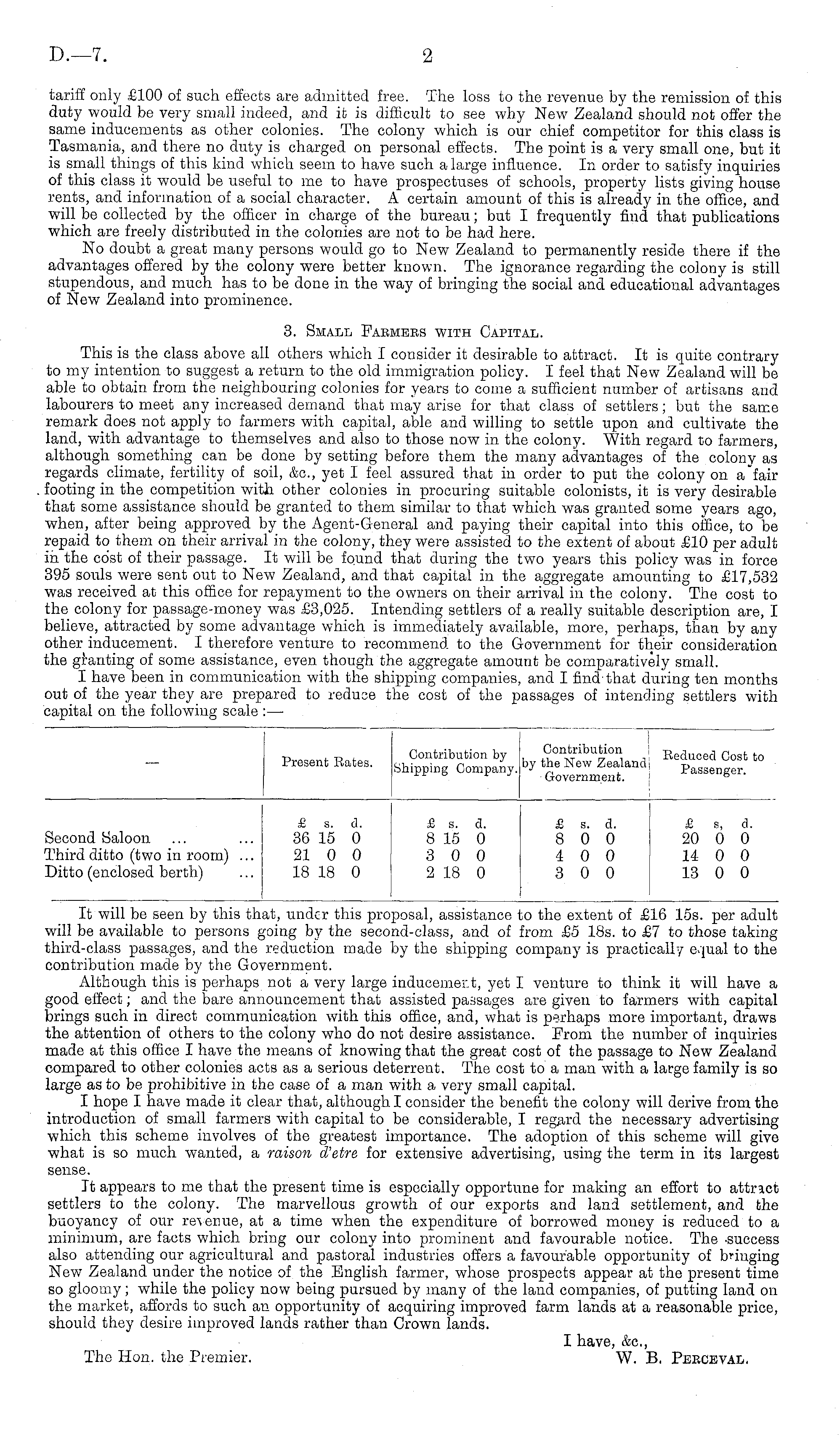 It will be seen by this that, under this proposal, assistance to the extent of £16 15s. per adult will be available to persons going by the second-class, and of from £5 18s. to £7 to those taking third-class passages, and the reduction made by the shipping company is practically equal to the contribution made by the Government. Although this is perhaps not a very large inducement, yet I venture to think it will have a good effect; and the bare announcement that assisted passages are given to farmers with capital brings such in direct communication with this office, and, what is perhaps more important, draws the attention of others to the colony who do not desire assistance. From the number of inquiries made at this office I have the means of knowing that the great cost of the passage to New Zealand compared to other colonies acts as a serious deterrent. The cost to a man with a large family is so large as to be prohibitive in the case of a man with a very small capital. I hope I have made it clear that, although I consider the benefit the colony will derive from the introduction of small farmers with capital to be considerable, I regard the necessary advertising which this scheme involves of the greatest importance. The adoption of this scheme will give what is so much wanted, a raison d'etre for extensive advertising, using the term in its largest sense. It appears to me that the present time is especially opportune for making an effort to attract settlers to the colony. The marvellous growth of our exports and land settlement, and the buoyancy of our revenue, at a time when the expenditure of borrowed money is reduced to a minimum, are facts which bring our colony into prominent and favourable notice. The -success also attending our agricultural and pastoral industries offers a favourable opportunity of bringing New Zealand under the notice of the English farmer, whose prospects appear at the present time so gloomy; while the policy now being pursued by many of the land companies, of putting land on the market, affords to such an opportunity of acquiring improved farm lands at a reasonable price, should they desire improved lands rather than Crown lands. I have, &c, The Hon. the Premier. W. B. Perceval.