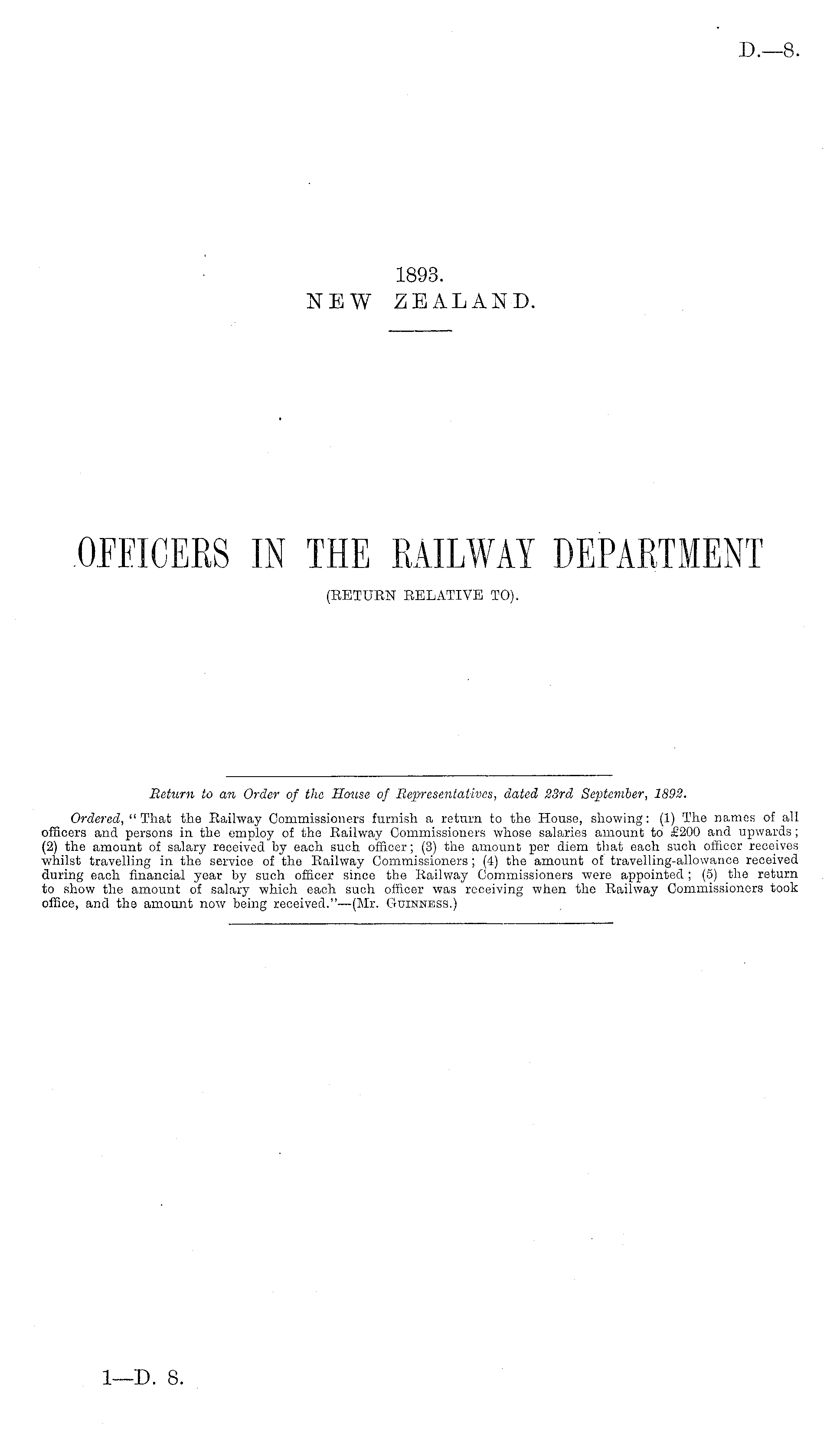 Return to an Order of the House of Representatives, dated 23rd September, 1892. Ordered, "That the Railway Commissioners furnish a return to the House, showing: (1) The names of all officers and persons in the employ of the Railway Commissioners whose salaries amount to £200 and upwards ; (2) the amount of salary received by each such officer; (3) the amount per diem that each such officer receives whilst travelling in the service of the Railway Commissioners; (4) the amount of travelling-allowance received during each financial year by such officer since the Railway Commissioners were appointed; (5) the return to show the amount of salary which each such officer was receiving when the Railway Commissioners took office, and the amount now being received."—(Mr. Guinness.)