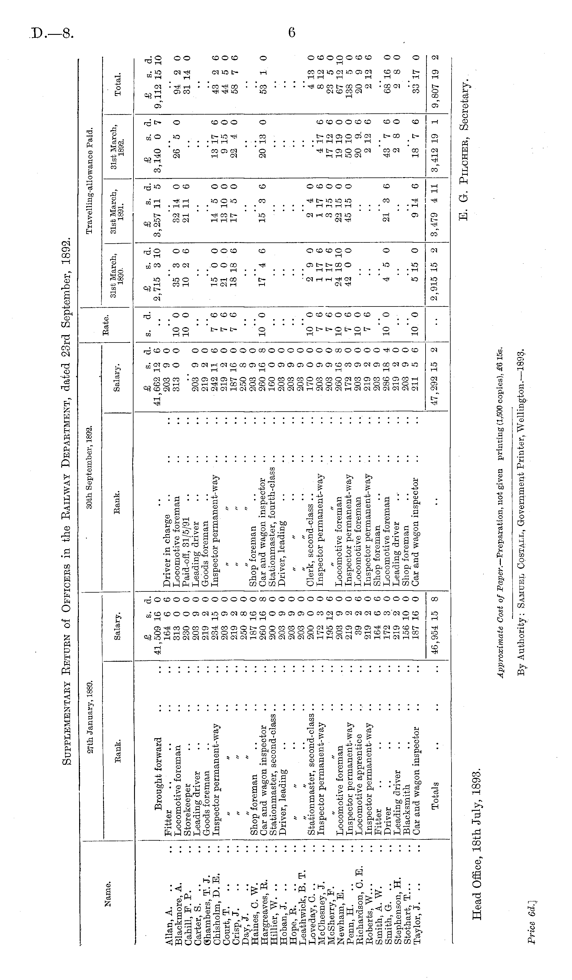 27th January, 1889. 30th September, 1892. Travelling-allowance Paid. Name. Bate. Bank. Salary. Bank. Salary. 31st March, 1890. 31st March, 1891. 31st March, 1892. Total. Allan, A. Blackmore, A. Cahill, F. P. Carter, S. Ghambers, T. J. Chisholm, D. E. Court, T. .. Crisp, J. Day, J. Haines, C. W. Hargreaves, R. Hillier, W. .. Hoban, J. .. Hope, R. Leathwick, B. T. Loveday, C. .. McChesney, J. McSherry, F. Newham, E. Penn, H. .. Richardson, C. E. Roberts, W... Smith, A. W. Smith, G. .. Stephenson, H. Stothart, T... Taylor, J. .. Brought forward Fitter Locomotive foreman Storekeeper Leading driver Goods foreman Inspector permanent-way Shop foreman Car and wagon inspector Stationmaster, second-class .. Driver, leading £ s. a. 41,509 16 0 164 6 6 313 0 0 230 0 0 203 9 0 219 2 0 234 15 0 203 9 0 219 2 0 250 8 0 187 16 0 260 16 8 200 0 0 203 9 0 203 9 0 203 9 0 200 0 0 172 3 0 195 12 6 203 9 0 219 2 0 39 2 6 219 2 0 164 6 6 172 3 0 219 2 0 156 10 0 187 16 0 Driver in charge Locomotive foreman Paid-off, 31/5/91 Leading driver Goods foreman Inspector permanent-way Shop foreman Car and wagon inspector Stationmaster, fourth-class .. Driver, leading £ s. a. 41,662 12 6 203 9 0 313 0 0 203 9 0 219 2 0 242 11 6 219 2 0 187 16 0 250 8 0 203 9 0 260 16 8 160 0 0 203 9 0 203 9 0 203 9 0 170 0 0 203 9 0 203 9 0 260 16 8 172 3 0 203 9 0 219 2 0 203 9 0 286 18 4 219 2 0 203 9 0 211 5 6 s. d. 10" 0 10 0 7 6 7 6 7 6 10 0 £ s. d. 2,715 3 10 35"3 0 10 2 6 15 0 0 21 0 0 18 18 6 17**4 6 £ s. a. 3,257 11 5 32*14 0 21 11 6 14 5 0 13 10 0 17 5 0 15"3 6 £ s. a. 3,140 0 7 26"5 0 13 17 6 9 15 0 22 4 0 20'l3 0 £ s. d. 9,112 15 10 94 2 0 31 14 0 43 2 6 44 5 0 58 7 6 53' 1 0 Stationmaster, second-class .. Inspector permanent-way Locomotive foreman Inspector permanent-way Locomotive apprentice Inspector permanent-way .. Fitter Driver Leading driver Blacksmith Car and wagon inspector Clerk, second-class Inspector permanent-way Locomotive foreman Inspector permanent-way Locomotive foreman Inspector permanent-way Shop foreman Locomotive foreman Leading driver Shop foreman Car and wagon inspector 10 0 7 6 7 6 10 0 7 6 10 0 7 6 2 9 0 1 17 6 1 17 6 24 18 10 42 0 0 2 4 0 1 17 6 3 35 0 22 15 0 45 15 0 4 17 6 17 12 6 19 19 0 50 10 0 20 9, 6 2 12 6 4 13 0 8 12 6 23 5 0 67 12 10 138 5 0 20 9 6 2 12 6 io"o i'.'ji 0 21 '3 6 43 7 6 2 8 0 6816 0 2 8 0 io"o 515 0 914 6 18"7 6 33' 17 0 Totals 46,954 15 8 47,292 15 2 3,412 19 1 9,807 19 2 2,915 15 2 3,479 4 11