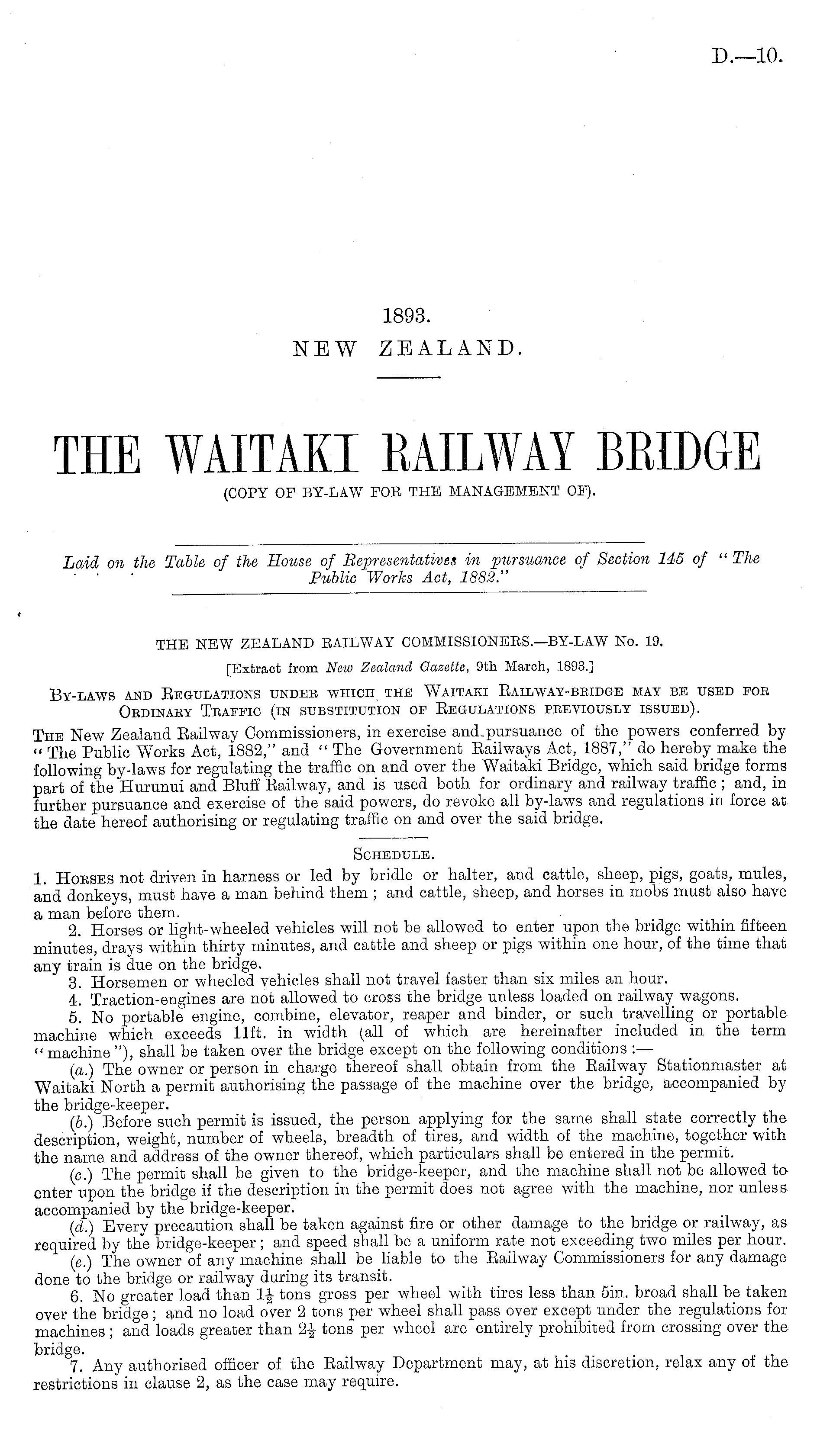 THE NEW ZEALAND EAILWAY COMMISSIONERS.—BY-LAW No. 19. [Extract from New Zealand Gazette, 9th March, 1893.] By-laws and Eegulations undeb which the Waitaki Bailway-bbidge may be used foe Oedinaey Tbaffic (in substitution of Begulations previously issued). The New Zealand Eailway Commissioners, in exercise and. pursuance of the powers conferred by " The Public Works Act, 1882," and " The Government Eailways Act, 1887," do hereby make the following by-laws for regulating the traffic on and over the Waitaki Bridge, which said bridge forms part of the Hurunui and Bluff Eailway, and is used both for ordinary and railway traffic ; and, in further pursuance and exercise of the said powers, do revoke all by-laws and regulations in force at the date hereof authorising or regulating traffic on and over the said bridge.