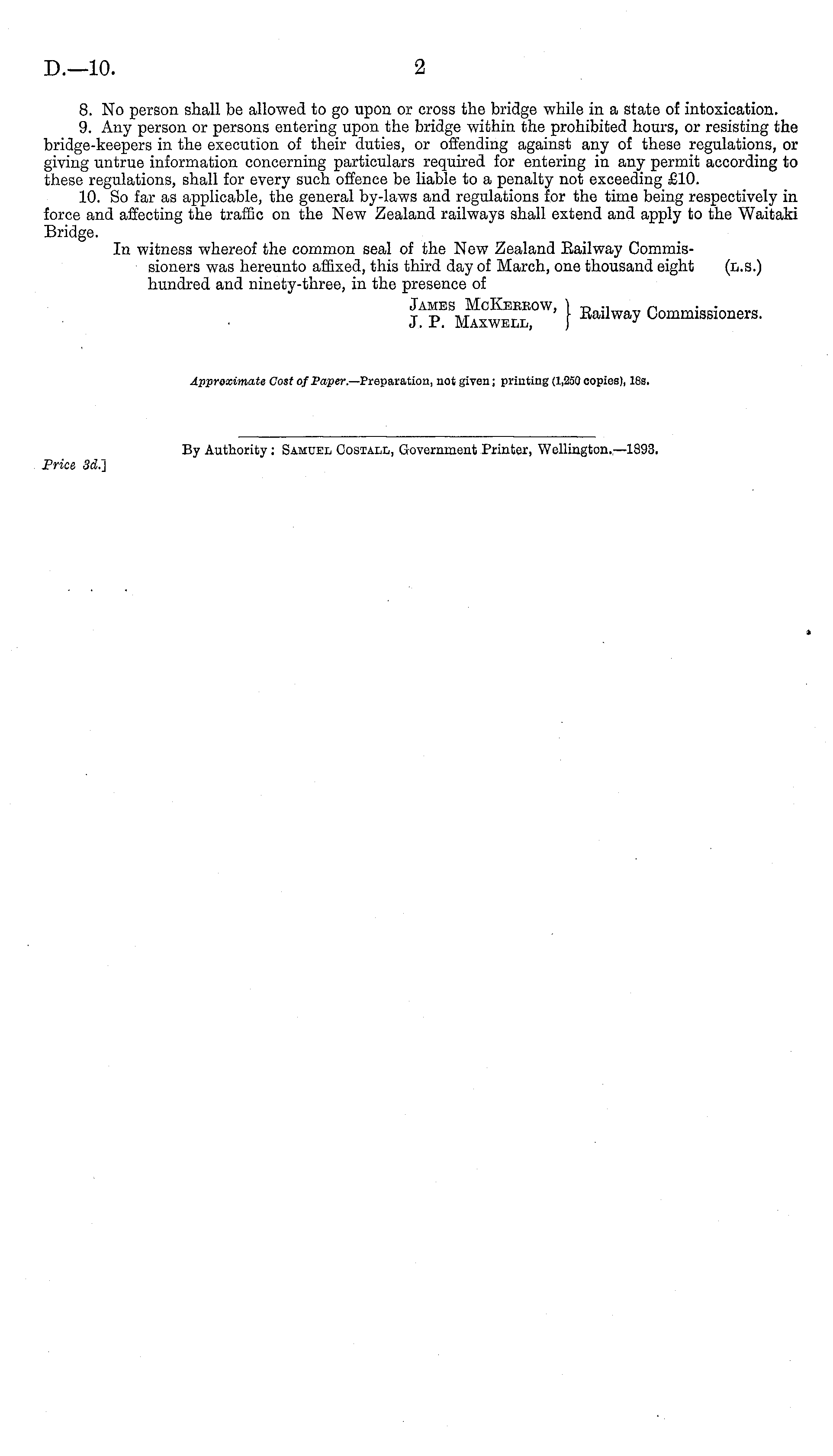 8. No person shall be allowed to go upon or cross the bridge while in a state of intoxication. 9. Any person or persons entering upon the bridge within the prohibited hours, or resisting the bridge-keepers in the execution of their duties, or offending against any of these regulations, or giving untrue information concerning particulars required for entering in any permit according to these regulations, shall for every such offence be liable to a penalty not exceeding £10. 10. So far as applicable, the general by-laws and regulations for the time being respectively in force and affecting the traffic on the New Zealand railways shall extend and apply to the Waitaki Bridge. In witness whereof the common seal of the New Zealand Eailway Commissioners was hereunto affixed, this third day of March, one thousand eight (t.s.) hundred and ninety-three, in the presence of Approximate Cost of Paper.—Preparation, not given; printing (1,250 copies), 18s.