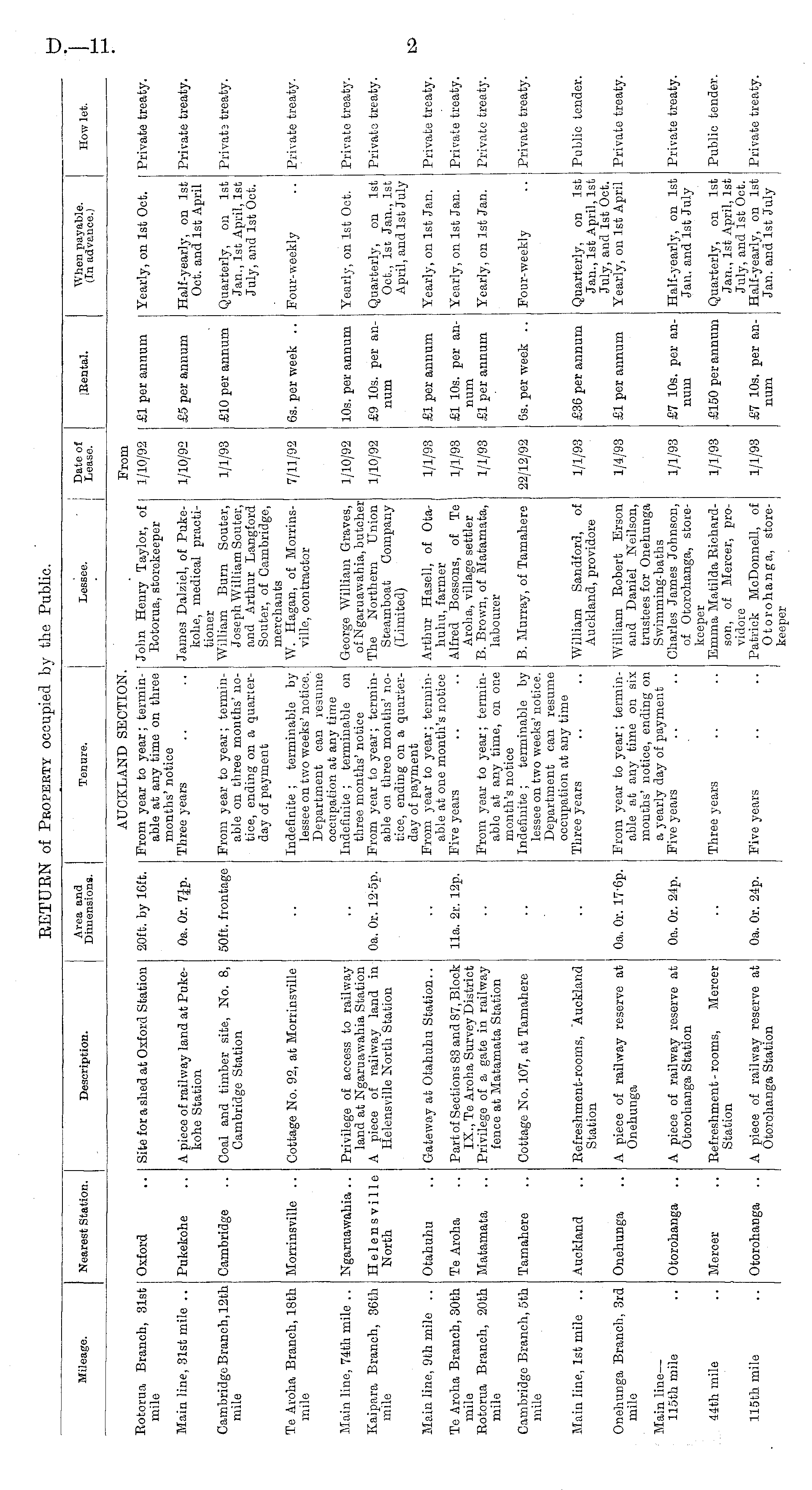 Mileage. Nearest Station. Description. Area and Dimensions. Tennre. I Lessee. ! Date of Lease. [Eental. "When payable. (In advance.) How let. AUCKLAND SECTION. From Rotorua Branch, 31st mile Oxford Pukekohe Site for a shed at Oxford Station A piece of railway land at Pukekohe Station 20ft. by 16ft. 0a. Or. 7|p. From year to year; terminable at any time on three months' notice Three years John Henry Taylor, of Rotorua, storekeeper 1/10/92 1/10/92 £1 per annum £5 per annum Yearly, on 1st Oct. Half-yearly, on 1st Oct. and 1st April Private treaty. Private treaty. Main line, 31st mile .. James Dalziel, of Pukekohe, medical practitioner William Burn Souter, Joseph William Souter, and Arthur Langford Souter, of Cambridge, merchants W. Hagan, of Morrinsville, contractor Cambridge Branch, 12th mile Cambridge Coal and timber site, No. 8, Cambridge Station 50ft. frontage From year to year; terminable on three months' notice, ending on a quarterday of payment 1/1/93 £10 per annum Quarterly, on 1st Jan., 1st April, 1st July, and 1st Oct. Private treaty. Te Aroha Branch, 18th mile Morrinsville .. Cottage No. 92, at Morrinsville Indefinite ; terminable by lessee on two weeks' notice. Department can resume occupation at any time Indefinite ; terminable on three months' notice From year to year; terminable on three months' notice, ending on a quarterday of payment From year to year; terminable at one month's notice Five years 7/11/92 6s. per week .. Four-weekly Private treaty. Main line, 74th mile .. Ngaruawahia .. Privilege of access to railway land at Ngaruawahia Station A piece of railway land in Helensville North Station George William Graves, of Ngaruawaliia, butcher The Northern Union Steamboat Company (Limited) 1/10/92 10s. per annum Yearly, on 1st Oct. Private treaty. Kaipara Branch, 36th mile Helens vi lie North 0a. Or. 12-5p. 1/10/92 £9 10s. per annum Quarterly, on 1st Oct., 1st Jan., 1st April, and 1st July Private treaty. Main line, 9th mile .. Otahuhu Gateway at Otahuhu Station.. Arthur Hasell, of Otahuhu, farmer Alfred Bossons, of Te Aroha, village settler B. Brown, of Matamata, labourer 1/1/93 £1 per annum Yearly, on 1st Jan. Private treaty. Te Aroha Branch, 30th mile Rotorua Branch, 20th mile Te Arolia Part of Sections 83 and 87, Block IX., Te Aroha Survey District Privilege of a gate in railway fence at Matamata Station lla. 2r. 12p. 1/1/93 £1 10s. per annum £1 per annum Yearly, on 1st Jan. Private treaty. Matarnata From year to year; terminable at any time, on one month's notice Indefinite ; terminable by lessee on two weeks' notice. Department can resume occupation at any time Three years 1/1/93 Yearly, on 1st Jan. Private treaty. Cambridge Branch, 5th mile Tamahere Cottage No. 107, at Tamahere B. Murray, of Tamahere 22/12/92 6s. per week .. Four-weekly Private treaty. Main line, 1st mile Auckland Refreshment-rooms, Auckland Station William Sandford, of Auckland, providore 1/1/93 £36 per annum Quarterly, on 1st Jan., 1st April, 1st July, and 1st Oct. Yearly, on 1st April Public tender. Onehunga Branch, 3rd mile Onehunga A piece of railway reserve at Onehunga 0a. Or. 17-6p. From year to year; terminable at any time on six months' notice, ending on a yearly day of payment Five years William Robert Erson and Daniel Neilson, trustees for Onehunga Swimming-baths Charles James Johnson, of Otorohanga, storekeeper Emma Matilda Richardson, of Mercer, providore Patrick McDonnell, of Otorohanga, storekeeper 1/4/93 £1 per annum Private treaty. Main line — 115th mile Otorohanga .. A piece of railway reserve at Otorohanga Station 0a. Or. 24p. 1/1/93 £7 10s. per annum Half-yearly, on 1st Jan. and 1st July Private treaty. 44th mile Mercer Refreshment - rooms, Mercer Station Three years 1/1/93 £150 per annum Quarterly, on 1st Jan., 1st April, 1st July, and 1st Oct. Half-yearly, on 1st Jan. and 1st July Public tender. 115th mile Otorohanga A piece of railway reserve at Otorohanga Station 0a. Or. 24p. Five years 1/1/93 £7 10s. per annum Private treaty.