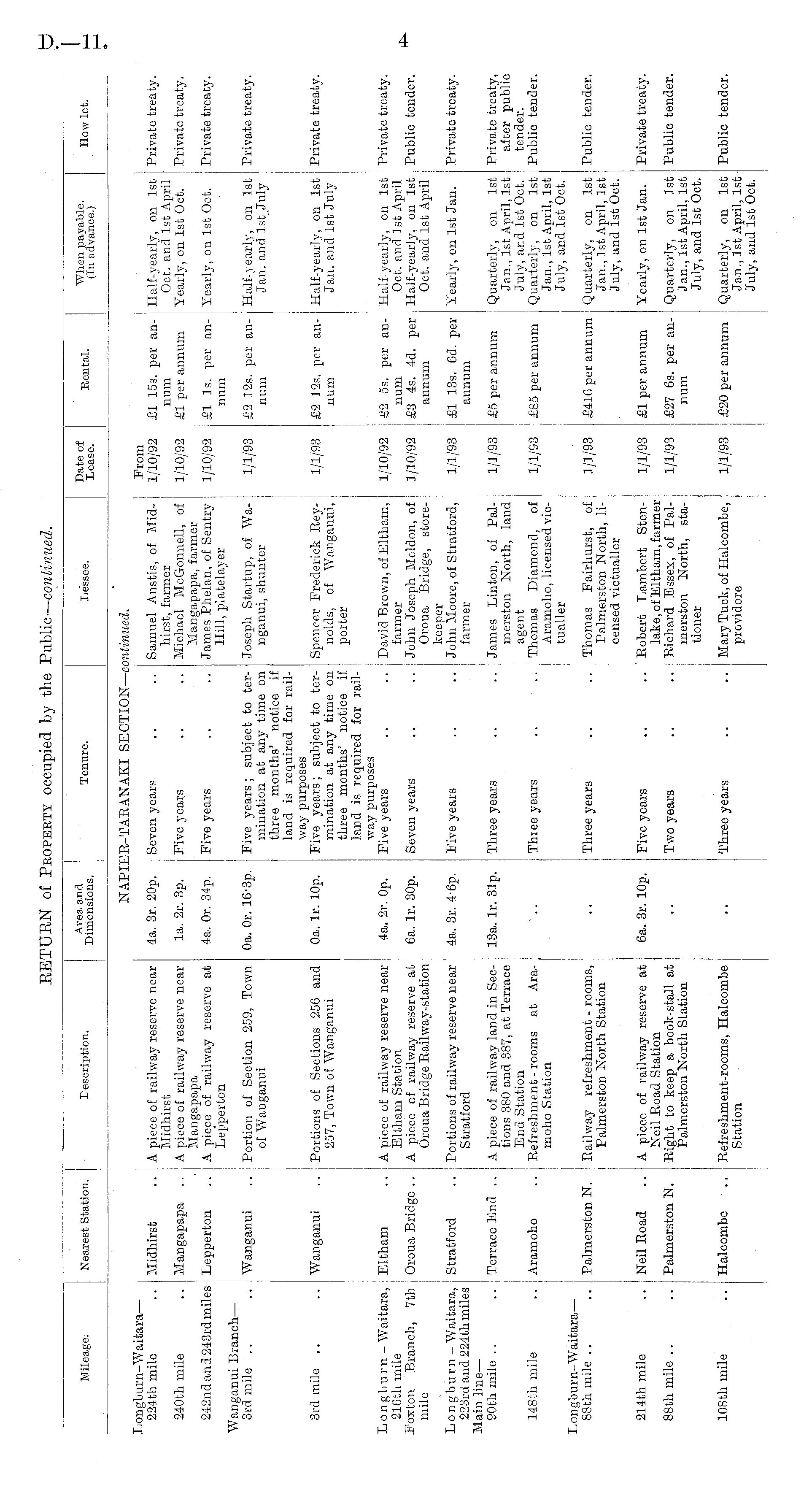 Mileage. Nearest Station. description. Area and Dimensions. Tenure. Lessee. Date oi Lease. Rental. When (In advance.) How let. napi: 1R-TARANAKI SECTION— continued. Lon gburn-Waitara — 224th mile .. Midhirst .. A piece oE railway reserve near Midhirst 240th mile .. Mangapapa .. A piece of railway reserve near Mangapapa 242nd and 243rd miles Lepperton .. A piece of railway reserve at Lepperton Wanganui Branch — 3rd mile .. .. Wanganui .. ! Portion of Section 259, Town of Wanganui 4a. 3r. 20p. la. 2r. 3p. 4a. Or. 34p. Prom Seven years .. .. Samuel Anstis, of Mid- j 1/10/92 £1 15s. per anhirst, farmer num Five years .. .. Michael McGonnell, of 1/10/92 £1 per annum Mangapapa, farmer Five years .. .. James Phelan, of Sentry 1/10/92 £1 Is. per anHill, platelayer num Half-yearly, on 1st Private treaty. Oct. and 1st April Yearly, on 1st Oct. Private treaty. Yearly, on 1st Oct. ! Private treaty. Oa. Or. 16-3p. Five years ; subject to ter- Joseph Startup, of Wa- 1/1/93 £2 12s. per anmination at any time on nganui, shunter num three months' notice if land is required for railway purposes Five years; subject to ter- Spencer Frederick Rey- 1/1/93 £2 12s. per anmination at any time on nolds, of Wanganui, num three months' notice if porter land is required for railway purposes Five years .. .. \ David Brown, of Eltham, 1/10/92 £2 5s. per anfarmer num Seven years .. .. j John Joseph Meldon, of 1/10/92 £3 4s. 4d. per Oroua Bridge, store- annum keeper Five years .. .. John Moore, of Stratford, 1/1/93 £1 13s. 63. per farmer annum Half-yearly, on 1st i Private treaty. Jan. and lst^July 3rd mile .. .. Wanganui .. Portions of Sections 256 and 257, Town of Wanganui Oa. lr. 10p. Half-yearly, on 1st Private treaty. Jan. and 1st July Longburn - Waitara, , Eltham .. A piece of railwav reserve near 216th mile Eltham Station Foxton Branch, 7th i Oroua Bridge .. A piece of railway reserve at mile Oroua Bridge Railway-station Longburn - Waitara, i Stratford .. Portions of railway reserve near 223rd and 224th miles | Stratford Main line — 00th mile .. .. Terrace End .. A piece of railway land in Sections 380 and 387, at Terrace End Station 148th mile .. Ararnoho .. | Refreshment - rooms at Aramoho Station 4a. 2r. Op. Half-yearly, on 1st Private treaty. Oct. and 1st April Half-yearly, on 1st Public tender. Oct. and 1st April Yearly, on 1st Jan. I Private treaty. 6a. lr. 30p. 4a. 3r. 4-6p. 13a. lr. 31p. Three years .. .. James Linton, of Pal- 1/1/93 £5 per annum merston North, land agent Three years .. • ■ Thomas Diamond, of 1/1/93 £85 per annum Aramoho, licensed vie- I tualler Quarterly, on 1st ! Private treaty, Jan., 1st April, 1st I after public July, and 1st Oct. j tender. Quarterly, on 1st | Public tender. Jan., 1st April, 1st July, and 1st Oct. i Longburn-Waitara — 88th mile .. .. I Palmerston N. ' Railway refreshment - rooms, Palmerston North Station Three years .. .. I Thomas Fairhurst, of 1/1/93 £41G per annum Palmerston North, licensed victualler Quarterly, on 1st i Public tender. Jan., 1st April, 1st July, and 1st Oct. 214th mile .. Neil Road .. A piece of railway reserve at Neil Road Station 88th mile .. .. Palmerston N. Right to keep a book-stall at Palmerston North Station 6a. 3r. 10p. Five years .. .. Robert Lambert Sten- 1/1/93 £1 per annum lake, of Eltham, farmer Two years .. .. Richard Essex, of Pal- 1/1/93 £27 6s. per anmerston North, sta- num tioner Three years .. .. Mary Tuck, of Halcombe, 1/1/93 £20 per annum providore Yearly, on 1st Jan. Private treaty. Quarterly, on 1st ] Public tender. Jan., 1st April, 1st July, and 1st Oct. ! 108th mile .. Halcombe .. Refreshment-rooms, Halcombe Station Quarterly, on 1st Public tender. Jan., 1st April, 1st July, and 1st Oct.