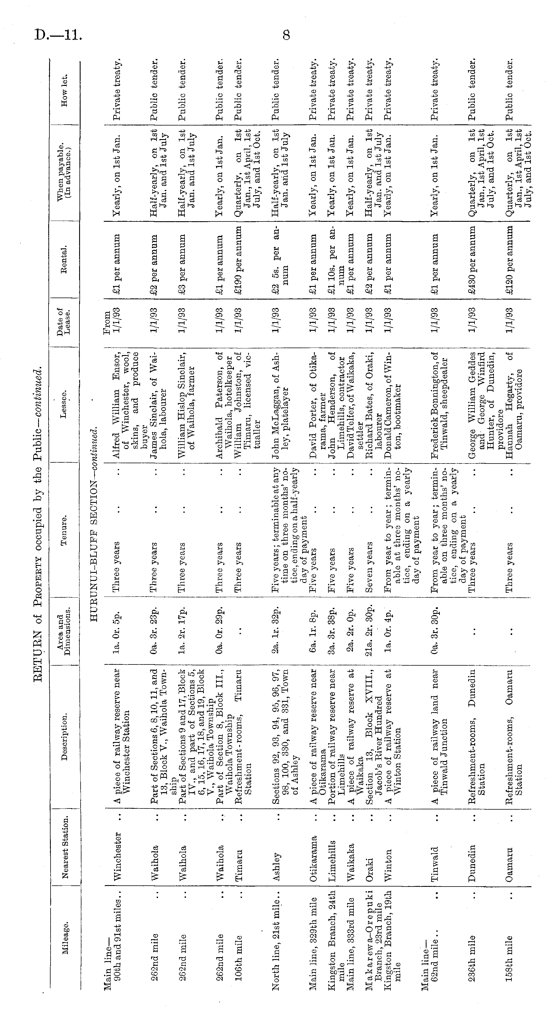 Mileage. Nearest Station. Description. Area and Dimensions. Tenure. Lessee. Date of Lease. Rental. "When payable. (In advance.) How let. HUE" JNUI-BLUFF SECTION— ci >ntiiiued. Main line — 90th and 91st miles.. Winchester A piece of railway reserve near Winchester Station la. Or. 5p. Three years Alfred William Ensor, of Winchester, wool, skins, and produce buyer James Sinclair, of Waihola, labourer From 1/1/93 £1 per annum Yearly, on 1st Jan. Private treaty. 262nd mile Waihola Part of Sections 6, 8,10, 11, and 13, Block V., Waihola Township Part of Sections 9 and 17, Block IV., and part of Sections 5, 6, 15,16, 17,18, and 19, Block V., Waihola Township Part of Section 8, Block III., Waihola Township Refreshment- rooms, Timaru Station 0a. 3r. 23p. Three years 1/1/93 £2 per annum Half-yearly, on 1st Jan. and 1st July Public tender. 2G2nd mile Waihola la. 2r. 17p. Three years William Hislop Sinclair, of Waihola, farmer 1/1/93 £3 per annum Half-yearly, on 1st Jan. and 1st July Public tender. 262nd mile Waihola Oa. Or. 29p. Three years Archibald Paterson, of Waihola, hotelkeeper William Johnston, of Timaru, licensed victualler 1/1/93 £1 per annum Yearly, on 1st Jan. Public tender. 106th mile Timaru Three years 1/1/93 £190 per annum Quarterly, on 1st Jan., 1st April, 1st July, and 1st Oct. Public tender. North line, 21st mile.. Ashley Sections 92, 93, 94, 95, 96, 97, 98, 100, 330, and 331, Town of Ashley 2a. lr. 32p. Five years; terminable at any time on three months' notice, ending on a half-yearly day of payment Five years John McLaggan, of Ashley, platelayer 1/1/93 £2 5s. per annum Half-yearly, on 1st Jan. arid 1st July Public tender. Main line, 329th mile Otikarama A piece of railway reserve near Otikarama Portion of railway reserve near Limehills A piece of railway reserve at Waikaka Section 13, Block XVIII., Jacob's Eiver Hundred A piece of railway reserve at Winton Station 6a. lr. 8p. David Porter, of Otikarama, farmer John Henderson, of Limehills, contractor David Telfer, of Waikaka, settler Richard Bates, of Oraki, labourer Donald Cameron, of Winton, bootmaker 1/1/93 £1 per annum Yearly, on 1st Jan. Private treaty. Kingston Branch, 24th mile Main line, 333rd mile Limehills Waikaka 3a. 3r. 38p. j 2a. 2r. Op. Five years Five years 1/1/93 1/1/93 £1 10s. per annum £1 per annum Yearly, on 1st Jan. Yearly, on 1st Jan. Private treaty. Private treaty. Makarewa-Orepuki Branch, 23rd mile Kingston Branch, 19th mile Oraki Winton 21a. 2r. 30p. la. Or. 4p. Seven years From year to year; terminable at three months' notice, ending on a yearly day of payment 1/1/93 1/1/93 £2 per annum £1 per annum Half-yearly, on 1st Jan. and 1st July Yearly, on 1st Jan. Private treaty. Private treaty. Main line — 62nd mile .. Tinwald A piece of railway land near Tinwald Junction 0a. 3r. 30p. From year to year; terminable on three months' notice, ending on a yearly day of payment Three years Frederick Bonnington, of Tinwald, sheepdealer 1/1/93 £1 per annum Yearly, on 1st Jan. Private treaty. 23Cth mile Dunedin Refreshment-rooms, Dunedin Station George William Geddes and George Winfird Hunter, of Dunedin, providore Hannah Hegarty, of Oamaru, providore 1/1/93 £430 per annum Quarterly, on 1st Jan., 1st April, 1st July, and 1st Oct. Public tender. 158th mile Oamaru Refreshment-rooms, Oamaru Station Three years 1/1/93 £120 per annum Quarterly, on 1st Jan., 1st April, 1st July, and 1st Oct. Public tender.