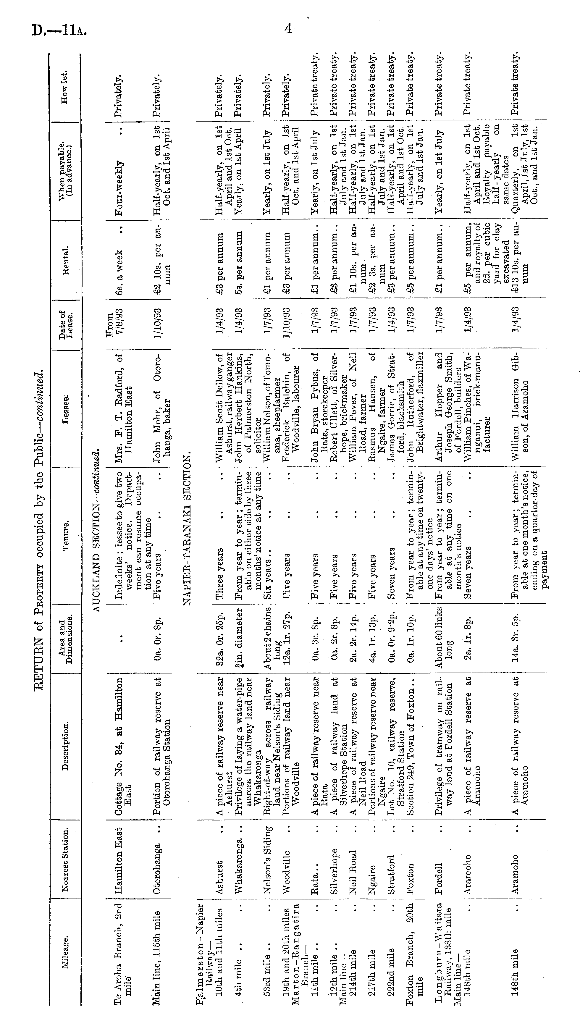 Mileage. Nearest Station. Description. Area and Dimensions. Tenure. Lessee; Date of Lease. Rental. When payable. (In advance.) How let. JCKLAND SECTION— contin led. Te Aroha Branch, 2nd mile Hamilton East Cottage No. 84, at Hamilton East Indefinite ; lessee to give two weeks' notice. Department can resume occupation at any time Five years Mrs. F. T. Radford, of Hamilton East From 7/8/93 6s. a week .. Four-weekly Privately. Main line, 115th mile Otorohanga Portion of railway reserve at Otorohanga Station 0a. Or. 8p. John Mohr, of Otorohanga, baker 1/10/93 £2 10s. per annum Half-yearly, on 1st Oct. and 1st April Privately. Pjalmerston- Napier Railway — 10th. and 11th miles TAPIER-TARANAKI SECTH )N. Ashurst A piece of railway reserve near Ashurst Privilege of laying a water-pipe across the railway land near Whakaronga Right-of-way across railway land near Nelson's Siding Portions of railway land near Woodville 32a. Or. 25p. Three years William Scott Dellow, of Ashurst, railway ganger John Herbert Hankins, of Palmerston North, solicitor William Nelson, of Tonioana, sheepfarnier Frederick Balchin, of Woodville, labourer £3 per annum Half-yearly, on 1st April and 1st Oct. Yearly, on 1st April Privately. 1/4/93 4th mile Whakaronga .. fin. diameter From year to year; terminable on either side by three months' notice at any time Six years 1/4/93 5s. per annum Privately. 53rd mile Nelson's Siding About 2 chains long 12a. lr. 27p. 1/7/93 £1 per annum Yearly, on 1st July Privately. 19th and 20th miles Marton-Rangatira Branch — 11th mile Woodville Five years 1/10/93 £3 per annum Half-yearly, on 1st Oct. and 1st April Privately. Rata A piece of railway reserve near Rata A piece of railway land at Silverhope Station A piece of railway reserve at Neil Road Portions of railway reserve near Ngaire Lot No. 10, railway reserve, Stratford Station Section 249, Town of Foxton .. 0a. 3r. 8p. Five years John Bryan Pybus, of Rata, storekeeper Robert Ullett, of Silverhope, brickmaker William Fever, of Neil Road, farmer Rasmus Hansen, of Ngaire, farmer James Gorrie, of Stratford, blacksmith John Rutherford, of Brightwater, flaxmiller 1/7/93 £1 per annum.. Yearly, on 1st July Private treaty. 12th mile Main Hue — 214th mile Silverhope 0a. 2r. 8p. Five years 1/7/93 £3 per annum.. Half-yearly, on 1st July and 1st Jan. Half-yearly, on 1st July and 1st Jan. Half-yearly, on 1st July and 1st Jan. Half-yearly, on 1st April and 1st Oct. Half-yearly, on 1st July and 1st Jan. Private treaty. Neil Roacl 2a. 2r. 14p. Five years 1/7/93 £1 10s. per annum £2 3s. per anPrivate treaty. 217th mile Ngaire 4a. lr. 13p. Five years 1/7/93 Private treaty. 222nd mile Stratford Oa. Or. 9-2p. Seven years 1/4/93 num £3 per annum.. Private treaty. Foxton Branch, 20th mile Foxton 0a. lr. 10p. From year to year; terminable at any time on twentyone days' notice From year to year; terminable at any time on one month's notice Seven years 1/7/93 £5 per annum.. Private treaty. Longburn-W a itara Railway, 138th mile Main line — 148th mile Fordcll Privilege of tramway on railway land at Fordell Station About 60 links long Arthur Hopper and Joseph George Smith, of Fordell, builders William Pinches, of Wanganui, brick-manu-facturer 1/7/93 £1 per annum.. Yearly, on 1st July Private treaty. Aramoho A piece of railway reserve at Aramoho 2a. lr. 8p. 1/4/93 £5 per annum, and royalty of 2d. per cubic yard for clay excavated £13 10s. per annum Half-yearly, on 1st April and 1st Oct. Royalty payable half - yearly on same dates Quarterly, on 1st April, 1st July, 1st Oct., and 1st Jan. Private treaty. 148th mile Aramoho A piece of railway reserve at Aramoho 14a. 3r. 5p. From year to year; terminable at one month's notice, ending on a quarter-day of payment William Harrison Gibson, of Aramoho 1/4/93 Private treaty.