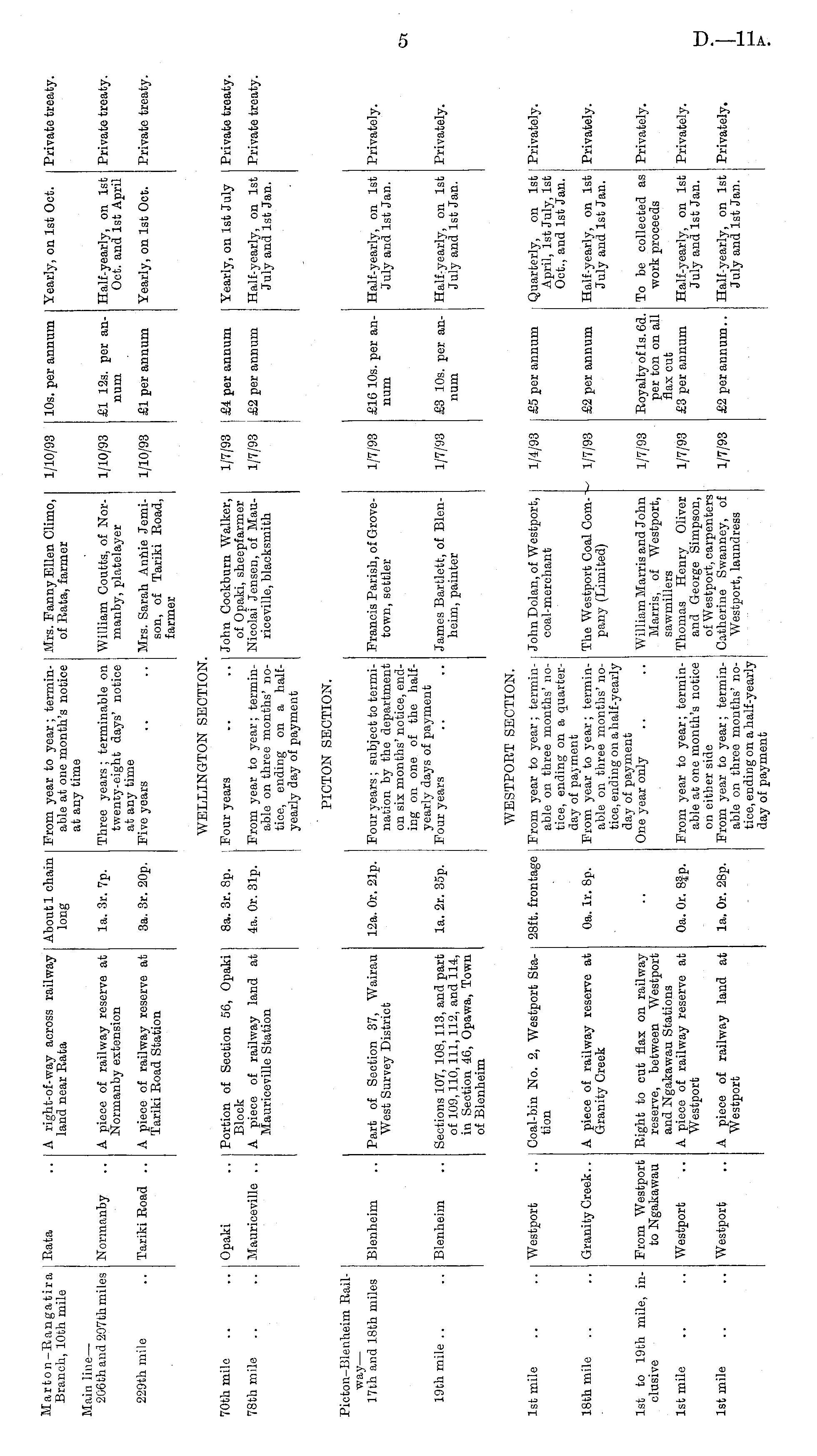 M&rfcon — Eangatira Rata .. A right-of-way across railway Aboutl chain From year to year; terminBranch, lOfch mile laud near Rata long able at one month's notice at any time Main line — 206th and207thmiles Normanby .. A piece of railway reserve at la. 3r. 7p. Three years; terminable on Normanby extension twenty-eight days' notice at any time 229th mile .. Tariki Road .. A piece of railway reserve at 3a. 3r. 20p. Five years Tariki Road Station Mrs. Fanny Ellen Climo, of Rata, farmer William Coutts, of Normanby, platelayer 1/10/93 10s. per annum 1/10/93 £1 12s. per annum 1/10/93 1/10/93 Yearly, on 1st Oct. Private treat; Half-yearly, on 1st Private treat; Oct. and 1st April Mrs. Sarah Annie Jemison, of Tariki Eoad, farmer 1/10/93 £1 per annum 1/10/93 Yearly, on 1st Oct. Private treat; WELLINGTON SECTION. 70th mile .. .. Opaki .. Portion of Section 56, Opaki 8a. 3r. 8p. Four years Block 78th mile .. .. Mauriceville .. A piece of railway land at 4a. Or. 31p. From year to year; terminMauriceville Station able on three months' notice, ending on a halfyearly day of payment John Cockburn Walker, of Opaki, sheepfarmer Nicolai Jensen, of Mauriceville, blacksmith 1/7/93 i £4 per annum 1/7/93 £2 per annum Yearly, on 1st July Private treat; Half-yearly, on 1st Private treat; July and 1st Jan. PIGTON SECTION. Picton—Blenheim Railway — 17th and 18th miles Blenheim .. Part of Section 37, Wairau 12a. Or. 21p. Four years; subject to termiWest Survey District nation by the department on six months' notice, ending on one of the halfyearly days of payment 19th mile .. .. Blenheim .. Sections 107, 108,113, and part la. 2r. 3op. Four years of 109,110, 111, 112, and 114, in Section 46, Opawa, Town of Blenheim Blenheim Blenheim Francis Parish, of Grovetown, settler James Bartlett, of Blenheim, painter 1/7/93 £16 10s. per annum 1/7/93 £3 10s. per annum 1/7/93 1/7/93 Half-yearly, on 1st Privately. July and 1st Jan. Half-yearly, on 1st Privately. July and 1st Jan. Privately. Privately. WESTPORT SECTION. 1st mile .. .. Westport .. Coal-bin No. 2, Westport Sta- 28ft. frontage From year to year; termiution able on three months' notice, ending on a quarterday of payment 18th mile .. .. Granity Creek.. A piece of railway reserve at 0a.lr.8p. From year to year; terminGranity Creek able on three months' notice, ending on a half-yearly day of payment 1st to 19th mile, in- From Westport Right to cut flax on railway .. One year only elusive to Ngakawau reserve, between Westport and Ngakawau Stations 1st mile .. .. Westport .. A piece of railway reserve at 0a. Or. 8fp. From year to year; terminWestport able at one month's notice on either side 1st mile .. .. Westport .. A piece of railway land at la. Or. 28p. From year to year; terminWestport able on three months' notice, ending on a half-yearly day of payment Westport John Dolan, of Westport, coal-merchant 1/4/93 £5 per annum Quarterly, on 1st Privately. April, 1st July, 1st Oct., and 1st Jan. 1/4/93 Privately. Granity Creek.. The Westport Coal Com- - - pany (Limited) 1/7/93 £2 per annum 1/7/93 Half-yearly, on 1st Privately. July and 1st Jan. Privately. From Westport to Ngakawau William Marris and John Harris, of Westport, sawmillers Thomas Henry Oliver and George Simpson, of Westport, carpenters Catherine Swanney, of Westport, laundress 1/7/93 Royalty of Is. 6d. per ton on all flax cut 1/7/93 £3 per annum 1/7/93 £2 per annum.. 1/7/93 , To be collected as Privately, work proceeds Half-yearly, on 1st Privately. July and 1st Jan. Half-yearly, on 1st Privately. July and 1st Jan. Privately. Westport 1/7/93 Privately. Westport 1/7/93 Privately.