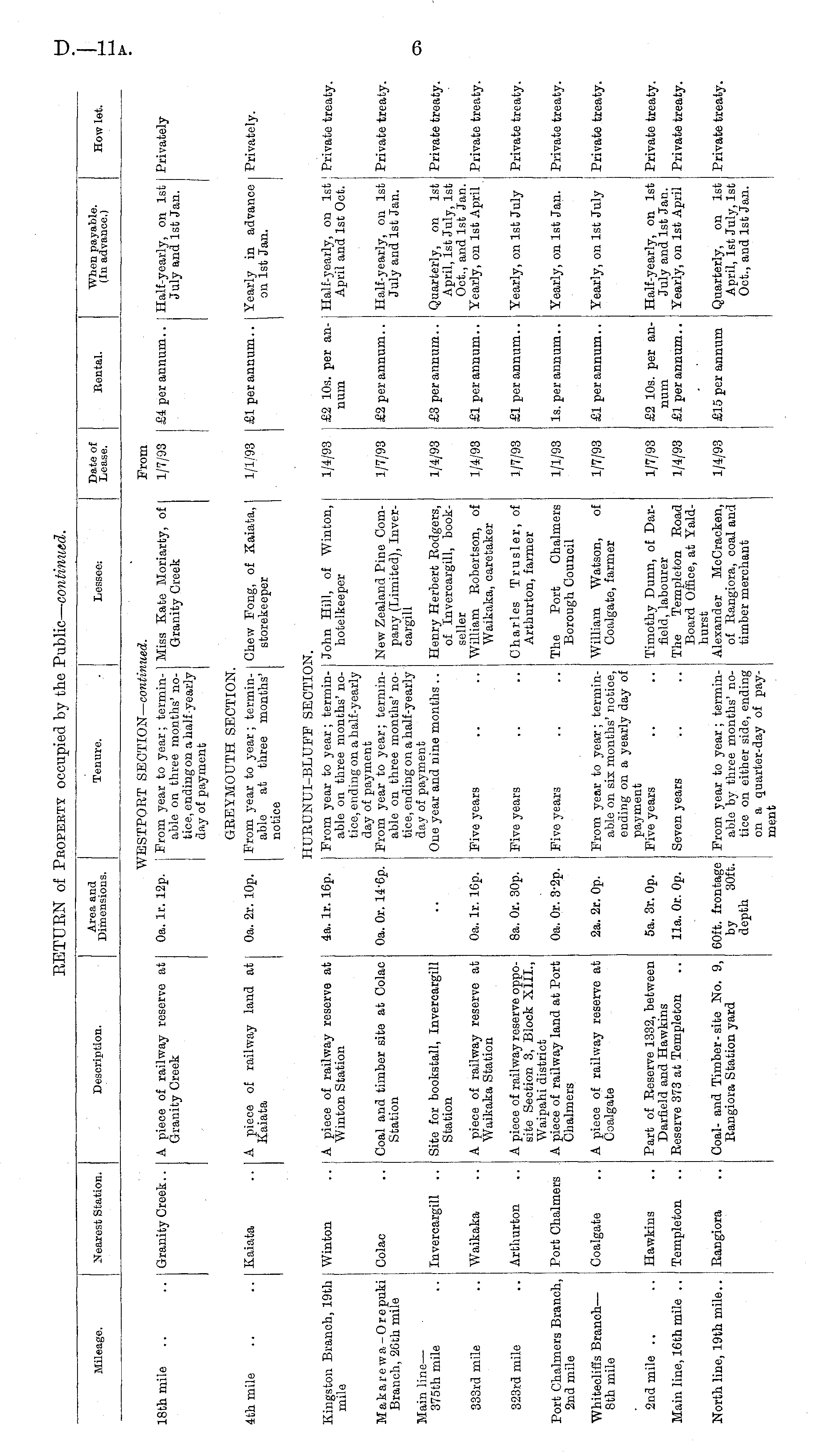 Mileage. Nearest Station. Description. Area and Dimensions. Tenure. Lessee: Date oi Lease. Eental. When payable. (In advance.) How let. ESTPORT SECTION— contim ued. From 18th mile .. .. Granity Creek.. A piece of railway reserve at Granity Creek Oa. lr. 12p. Prom year to year; terminable on three months' notice, ending on a half-yearly day of payment Miss Kate Moriarty, of Granity Creek 1/7/93 £4 per annum.. Half-yearly, on 1st Privately July and 1st Jan. 4th mile .. .. Kaiata A piece of railway land at Kaiata Oa. 2r. 10p. GREYMOUTH SECTION. Chew Fong, of Kaiata, storekeeper 1/1/93 £1 per annum.. Yearly in advance Privately. on 1st Jan. From year to year ; terminable at three months' notice Kingston Branch, 19th ' Winton .. I mile A piece of railway reserve at Winton Station ] 4a. lr. 16p. I HURUNUI-BLUFF SECTIO] N. 1/4/93 I £2 10s. per an- : Half-yearly, on 1st Private treaty. April and 1st Oct. M a k a r e w a - 0 r epuki , Colac Branch, 20th mile Coal and timber site at Colac Station Oa. Or. 14-6p. From year to year; terminable on three months' notice, ending on a half-yearly day of payment Froin year to year; terminable on three months' notice, ending on a half-yearly day of payment One year and nine months .. John Hill, of Winton, I hotelkeeper New Zealand Pine Company (Limited), Invercargill 1/7/93 nnrn £2 per annum.. Half-yearly, on 1st Private treaty. July and 1st Jan. Main line — 375th mile .. Inveroargill .. Site for bookstall, Invercargill Station Henry Herbert Rodgers, of Invercargill, bookseller William Robertson, of Waikaka, caretaker 1/4/93 £3 per annum.. Quarterly, on 1st Private treaty. April, 1st July, 1st Oct., and 1st Jan. Yearly, on 1st April Private treaty. 333rd mile .. Waikaka A piece of railway reserve at Waikaka Station Oa. lr. 16p. I Five years 1/4/93 £1 per annum.. 323rd mile .. Artlmrfcon A piece of railway reserve opposite Section 3, Block XIII., Waipahi district A piece of railway land at Port Chalmers 8a. Or. 30p. Five years Charles Trusler, of Arthurton, farmer 1/7/93 £1 per annum.. Yearly, on 1st July Private treaty. Port Chalmers Branch, Port Chalmers 2nd mile Oa. Or. 3'2p. Five years The Port Chalmers Borough Council 1/1/93 Is. per annum.. Yearly, on 1st Jan. Private treaty. Whiteclifis Branch— Coalgate 8th mile A piece of railway reserve at Coalgate 2a. 2r. Op. From year to year; terminable on six months' notice, ending on a yearly day of payment Five years William Watson, of Coalgate, farmer 1/7/93 £1 per annum.. Yearly, on 1st July ! Private treaty. 2nd mile .. .. Hawkins Part of Reserve 1332, between Darfield and Hawkins Reserve 373 at Templeton 5a. 3r. Op. Timothy Dunn, of Darfield, labourer The Templeton Road Board Office, at Yaldhurst Alexander McCracken, of Rangiora, coal and timber merchant 1/7/93 £2 10s. per annuni £1 per annum.. Half-yearly, on 1st Private treaty. July and 1st Jan. Yearly, on 1st April Private treaty. Main line, 16th mile .. Templeton lla. Or. Op. Seven years .. .. 1/4/93 I North line, 19th mile.. Rangiora Coal- and Timber -site No. 9, Rangiora Station yard 60ft. frontage by 30ft. depth 1 I From year to year ; terminable by three months' notice on either side, ending on a quarter-day of payment 1/4/93 £15 per annum Quarterly, on 1st Private treaty. April, 1st July, 1st Oct., and 1st Jan.