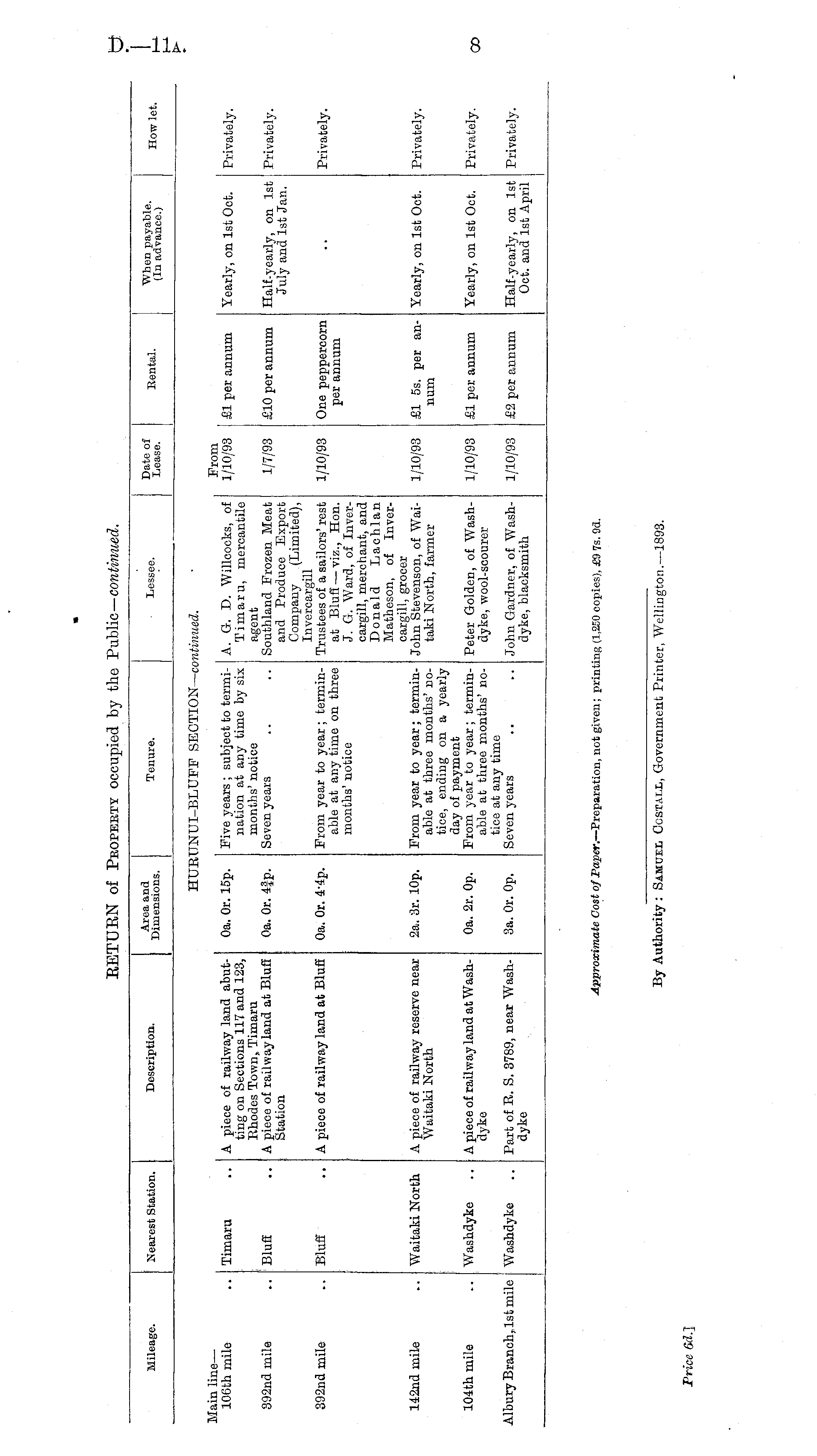 Mileage. Nearest Station. Description. Area and Dimensions. Tenure. Lessee. Date of Lease. Rental. When payable. (In advance.) How let. HUBUNUI-BLTJFF SECTION— c< •ntinued. Main line — 106th mile Timaru A piece of railway land abutting on Sections 117 and 123, Bhodes Town, Timaru A piece of railway land at Blufi Station 0a. Or. 15p. Five years ; subject to termination at any time by six months' notice 0a. Or. 4|p. Seven years A. G. D. Willcocks, of Timaru, mercantile agent Southland Frozen Meat and Produce Export Company (Limited), Invercargill Trustees of a sailors' rest at Bluff — viz., Hon. J. G. Ward, of Invercargill, merchant, and Donald Lachlan Matheson, of Invercargill, grocer John Stevenson, of Waitaki North, farmer From 1/10/93 £1 per annum Yearly, on 1st Oct. Privately. 392nd mile Blufi 1/7/93 £10 per annum Half-yearly, on 1st July and 1st Jan. Privately. 392nd mile Bluff A piece of railway land at Bluff 0a. Or. 4'4p. Prom year to year; terminable at any time on three months' notice 1/10/93 One peppercorn per annum Privately. 142nd mile Waitaki North A piece of railway reserve near Waitaki North 2a. 3r. lOp. Prom year to year; terminable at three months' notice, ending on a yearly day of payment 0a. 2r. Op. From year to year; terminable at three months' notice at any time 3a. Or. Op. Seven years £1 5s. per annum Yearly, on 1st Oct. 1/10/93 Privately. 104th mile Washdyke A piece of railway land at Washdyke Peter Golden, of Washdyke, wool-scourer 1/10/93 £1 per annum Yearly, on 1st Oct. Privately. Albury Branch, 1st mile Washdyke Part of E. S. 3789, near Washdyke John Gardner, of Washdyke, blacksmith 1/10/93 £2 per annum Half-yearly, on 1st Oct. and 1st April Privately.
