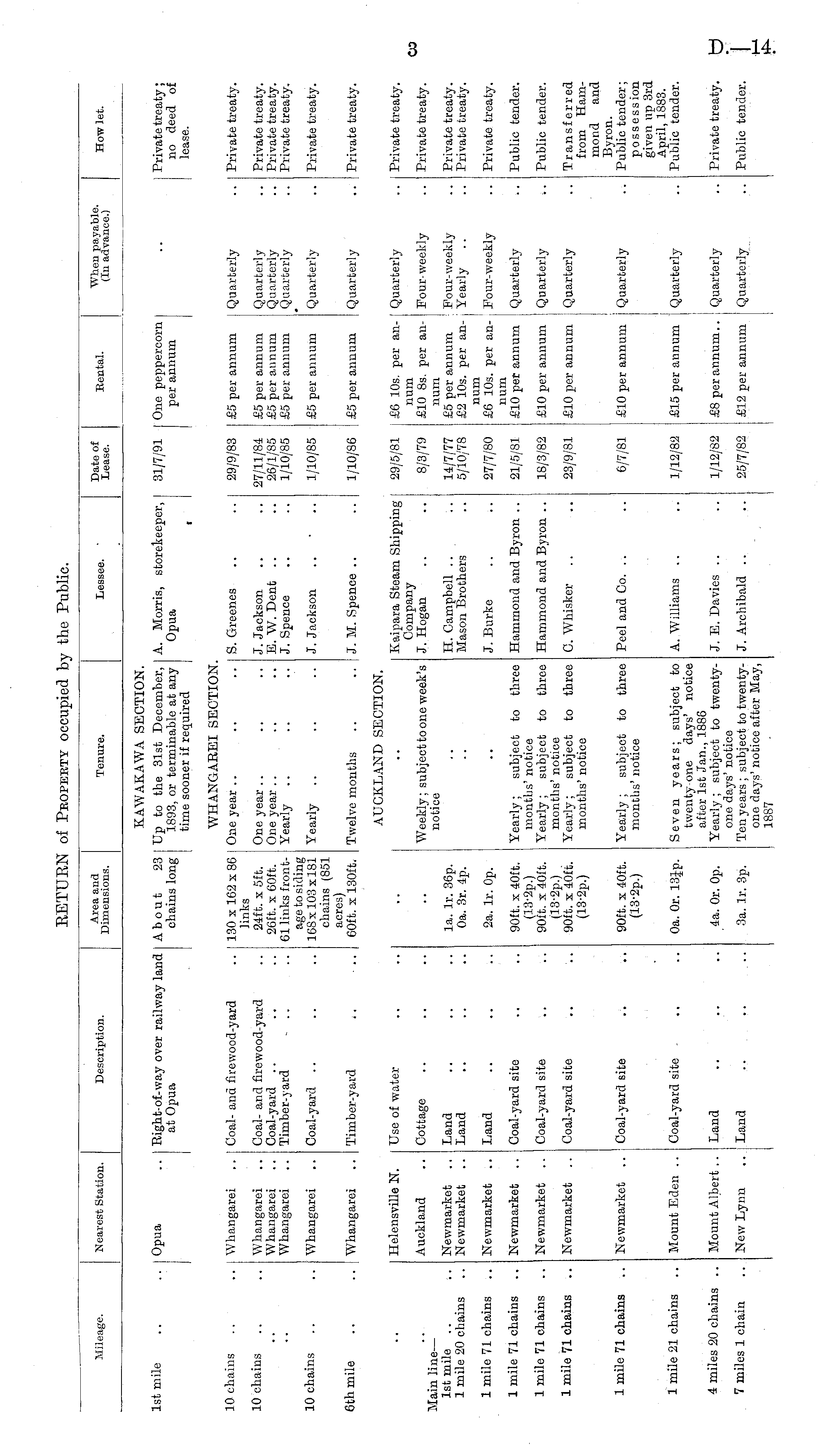 Mileage. Nearest Station. Description. Area and Dimensions. Tenure. Lessee. ' Date of Lease. Bental. When payable. (In advance.) How let. 1st mile .. .. Opua .. Right-of-way over railway land at Opua KAWAKAWA SECTION. About 23 Up to the 31st December, A. Morris, storekeeper, chains long 1893, or terminable at any Opua time sooner if required , 31/7/91 One peppercorn per annum Private treaty; no deed of lease. 10 chains .. .. 1 Whangarei .. I Coal- and firewood-yard WHANGAREI SECTION. 29/9/83 I £5 per annum j Quarterly Private treaty. 10 chains .. .. Whangarei .. Coal- and firewood-yard Whangarei .. Coal-yard Whangarei .. Timber-yard - .. 130 x 162 x 86 One year .. .. .. S. Greenes links 24ft. x 5ft. One year .. .. .. J. Jackson 26ft. x 60ft. One year .. .. .. E. W. Dent 61 links front- Yearly .. .. .. J. Spence age to siding 168x103x181 Yearly .. .. .. J.Jackson chains (851 acres) 60ft. x 130ft. Twelve months .. .. J. M. Spence 27/11/84 26/1/85 1/10/85 £5 per annum Quarterly £5 per annum Quarterly £5 per annum Quarterly Private treaty. Private treaty. Private treaty. 10 chains .. .. Whangarei .. Coal-yard 1/10/85 £5 per annum Quarterly Private treaty. 6th mile .. .. [ Whangarei .. j Timber-yard 1/10/86 I £5 per annum ! Quarterly Private treaty. ] Helensville N. I Use of water AUCKLAND SECTION. 29/5/81 | £6 10s. per an- I Quarterly ram £10 8s. per an- j Four-weekly num £5 per annum Four-weekly £2 10s. per an- , Yearly num £6 10s. per an- j Four-weekly num £10 per annum Quarterly £10 per annum ; Quarterly Private treaty. Auokland .. Cottage Main line — 1st mile .. .. Newmarket .. Land 1 mile 20 chains .. Newmarket .. Land Kaipara Steam Shipping Company Weekly; subject to one week's J. Hogan notice 8/3/79 Private treaty. la. lr. 36p. .. H. Campbell 0a. 3r. 4p. .. Mason Brothers 14/7/77 5/10/78 Private treaty. Private treaty. 1 mile 71 chains .. Newmarket .. Land 2a. lr. Op. .. J. Burke 27/7/80 Private treaty. 1 mile 71 chains .. Newmarket .. Coal-yard site 90ft. x 40ft. Yearly ; subject to three Hammond and Byron .. (13 - 2p.) months' notice 90ft. x 40ft. Yearly; subject to three Hammond and Byron .. (13'2p.) months' notice 90ft. x 40ft. Yearly; subject to three C. Whisker .. (13-2p.) months' notice 21/5/81 J Publio tender. 1 mile 71 chains .. Newmarket .. Coal-yard site 18/3/82 Public tender. 1 mile 71 chains .. Newmarket .. Coal-yard site 23/9/81 £10 per annum Quarterly Transferred from Hammond and Byron. Public tender; possession given up 3rd April, 1883. Public tender. 1 mile 71 chains .. Newmarket .. : Coal-yard site 90ft. x 40ft. Yearly ; subject to three Peel and Co. .. (13'2p.) months' notice 6/7/81 j £10 per annum Quarterly 1 mile 21 chains .. Mount Eden .. Coal-yard site - 0a. Or. 13Jp. Seven years; subject to A.Williams .. twenty-one days' notice after 1st Jan., 1886 4a. Or. Op. Yearly ; subject to twenty- J. E. Davies one days' notice 3a. lr. 3p. Ten years ; subject to twenty- J.Archibald .. one days' notice after May, 1887 1/12/82 £15 per annum ; Quarterly 4 miles 20 chains .. Mount Albert .. Land 1/12/82 £8 per annum.. Quarterly Private treaty. 7 miles 1 chain .. New Lynn .. I Land 25/7/82 £12 per annum Quarterly Public tender.