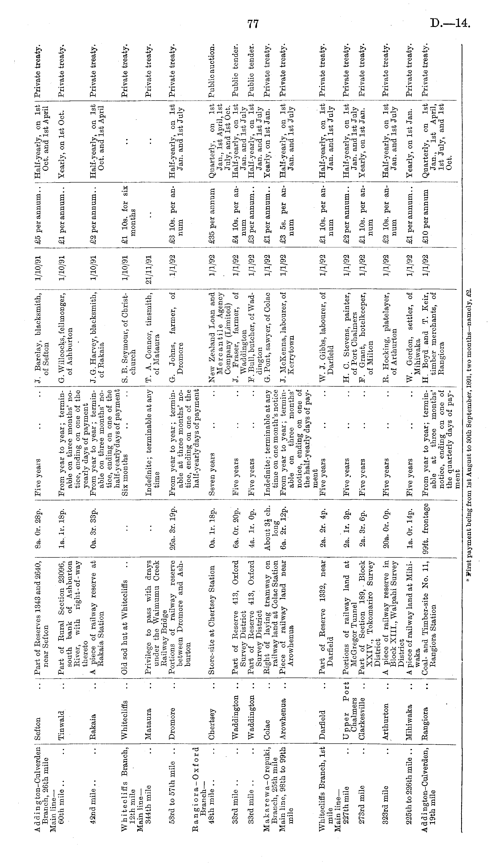 Adding ton-Culverden Branch, 26th mile Main line — 60th mile Sefton Tinwald Part of Reserves 1343 and 2640, near Sefton Part of Rural Section 23096, south bank of Ashburton River, with right-of-way thereto A piece of railway reserve at Rakaia Station 8a. Or. 28p. la. lr. 18p. Five years From year to year; terminable on three months' notice, ending on one of the yearly days of payment From year to year ; terminable on three months' notice, ending on one of the half-yearly days of payment Six months J. Barclay, blacksmith, of Sefton G. Willcocks, fellmonger, of Ashburton £5 per annum.. £1 per annum.. Half-yearly, on 1st Oct. and 1st April Yearly, on 1st Oct. Private treaty. Private treaty. 1/10/91 42nd mile Rakaia Oa. 3r. 33p. J. G. Harvey, blacksmith, of Rakaia 1/10/91 £2 per annum.. Half-yearly, on 1st Oct. and 1st April Private treaty. Whitecliffs Branch, 12 th mile Main line — 344th mile Whitecliffs .. Old sod hut at Whitecliffs .. S. B. Seymour, of Christchurch 1/10/91 £1 10s. for six months Private treaty. Mataura Privilege to pass with drays under the Waimumu Creek Railway Bridge Portions of railway reserve between Dromore and Ashburton Indefinite; terminable at any time T. A. Connor, tinsmith, of Mataura 21/11/91 Private treaty. 53rd to 57th mile .. Dromore 26a. 3r. 19p. From year to year ; terminable at three months' notice, ending on one of the half-yearly days of payment G. Johns, farmer, of Dromore 1/1/92 £3 10s. per annum Half-yearly, on 1st Jan. and 1st July Private treaty. Rangiora-Oxford Branch — 48th mile Chertsey Store-site at Chertsey Station Oa. lr. 18p. New Zealand Loan and Mercantile Agency Company (Limited) J. Fraser, farmer, of Waddington F. Bull, butcher, of Waddington G. Pont, sawyer, of Colac £35 per annum Quarterly, on 1st Jan., 1st April, 1st July, and 1st Oct. Half-yearly, on 1st Jan. and 1st July Half-yearly, on 1st Jan. and 1st July Yearly, on 1st Jan. Publicauction. Seven years 1/1/92 33rd mile Waddington .. Part of Reserve 413, Oxford Survey District Part of Reserve 413, Oxford Survey District Right of laying tramway on railway land at Colac Station Piece of railway land near Arowhenua 6a. Or. 20p. Five years 1/1/92 £4 10s. per anPublic tender. 33rd mile .. Waddington .. 4a. lr. Op. Five years 1/1/92 num £3 per annum.. Public tender. Makarew a- Orepuki, Branch, 25th mile Main line, 98th to 99th mile Colac Arowhenua About 3J ch. long 6a. 2r. 12p. Indefinite; terminable at any time on one month's notice From year to year; terminable on three months' notice, ending on one of the half-yearly days of payment Five years J. McKenna, labourer, of Kerrytown 1/1/92 1/1/92 £1 per annum.. £3 5s. per annum Half-yearly, on 1st Jan. and 1st July Private treaty. Private treaty. Whitecliffs Branch, 1st mile Main line — 227th mile Darfield Part of Reserve 1332, near Darfield 2a. 2r. 4p. W. J. Gibbs, labourer, of Darfield 1/1/92 £1 10s. per annum Half-yearly, on 1st Jan. and 1st July Private treaty. 273rd mile Upper Port Chalmers Clarkesville Portions of railway land at McGregor Tunnel Part of Section 189, . Block XXIV., Tokomariro Survey District A piece of railway reserve in Block XIII., Waipahi Survey District A piece of railway land at Mihiwaka Coal- and Timber-site No. 11, Rangiora Station 2a. lr. 3p. Five years H. C. Stevens, painter, of Port Chalmers F. Grant, hotelkeeper, of Milton 1/1/92 £2 per annum.. Half-yearly, on 1st Jan. and 1st July Yearly, on 1st Jan. Private treaty. 2a. 3r. 6p. Five years 1/1/92 £1 10s. per annum Private treaty. 323rd mile Arthurton 20a. Or. Op. Five years R. Hocking, platelayer, of Arthurton 1/1/92 £2 10s. per an-Half-yearly, on 1st Jan. and 1st July Private treaty. num 225th to 226th mile .. Mihiwaka la. Or. 14p. Five years W. Gordon, settler, of Mihiwaka H. Boyd, and T. Keir, timber merchants, of Rangiora 1/1/92 £1 per annum.. Yearly, on 1st Jan. Private treaty. A d d i ng ton-Culverden, 19th mile Rangiora 99ft. frontage From year to year; terminable at three months' notice, ending on one of the quarterly days of payment 1/1/92 £10 per annum Quarterly, on 1st Jan., 1st April, 1st July, and 1st Oct. Private treaty. * First payment being from 1st August to 30th September, 1891, two months —namely, £2.