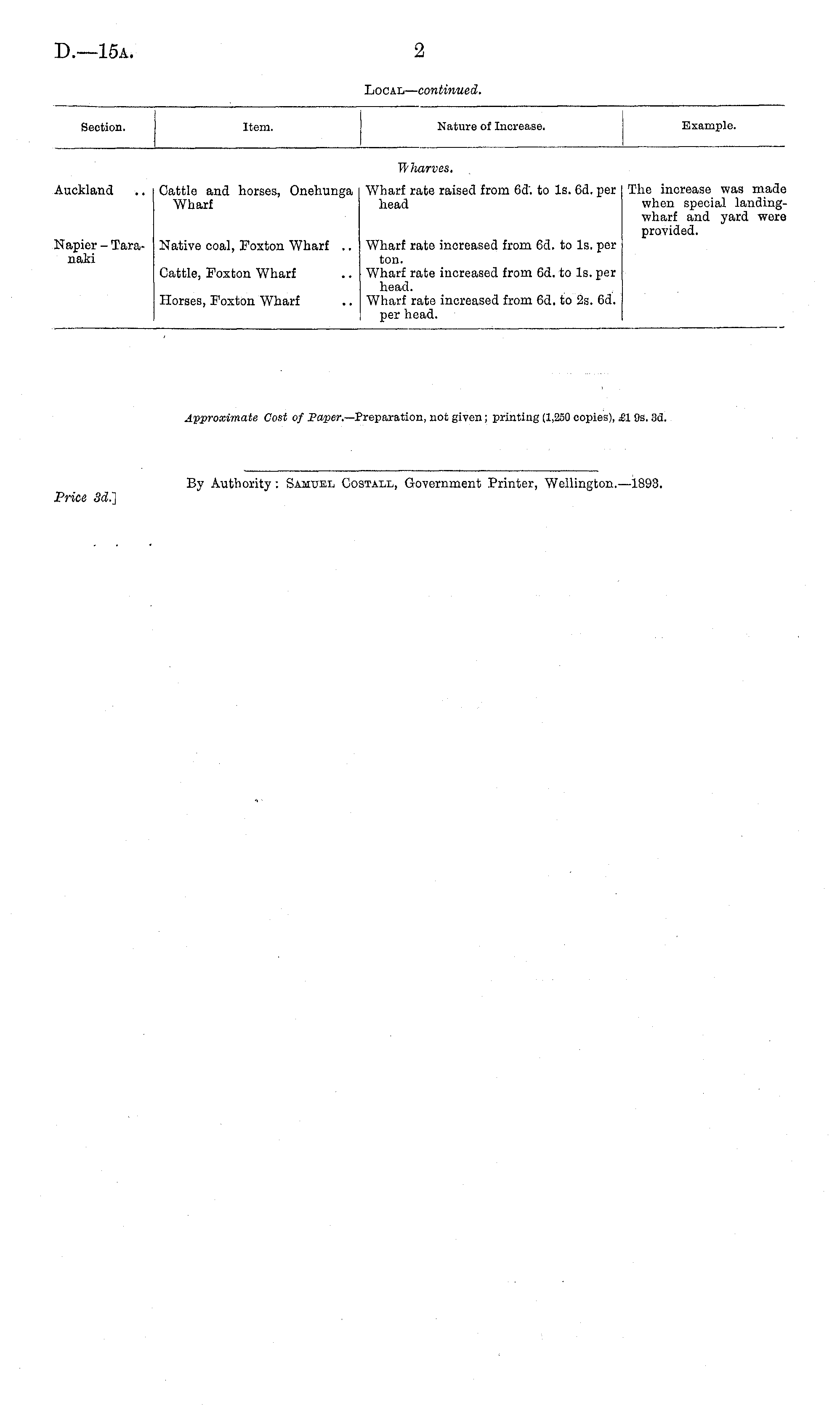Section. Item. Nature of Increase. Example. Wharves. .uckland Cattle and horses, Onehunga Wharf Wharf rate raised from 6d. to Is. 63. per hea3 The increase was made when special landingwharf and yard were provided. lapier - Taranaki Native coal, Foxton Wharf .. Wharf rate increased from 63. to Is. per ton. Wharf rate increase3 from 63. to Is. per bead. Wharf rate increased from 6d. to 2s. 63. per hea3. Cattle, Foxton Wharf Horses, Foxton Wharf
