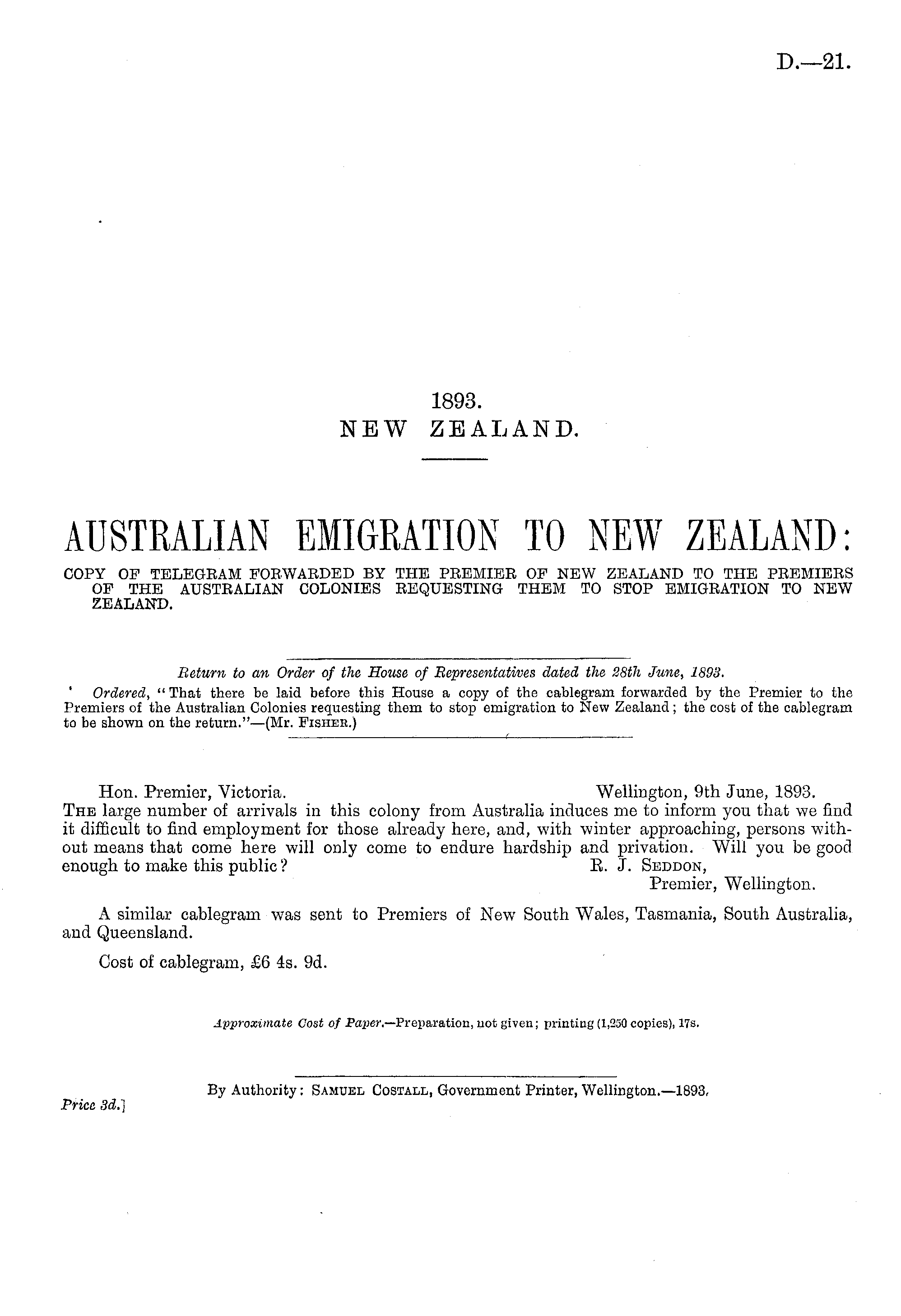 Hon. Premier, Victoria. Wellington, 9th June, 1893. The large number of arrivals in this colony from Australia induces me to inform you that we find it difficult to find employment for those already here, and, with winter approaching, persons without means that come here will only come to endure hardship and privation. Will you be good enough to make this public ? E. J. Seddon, Premier, Wellington. A similar cablegram was sent to Premiers of New South Wales, Tasmania, South Australia, and Queensland. Cost of cablegram, £6 4s. 9d.