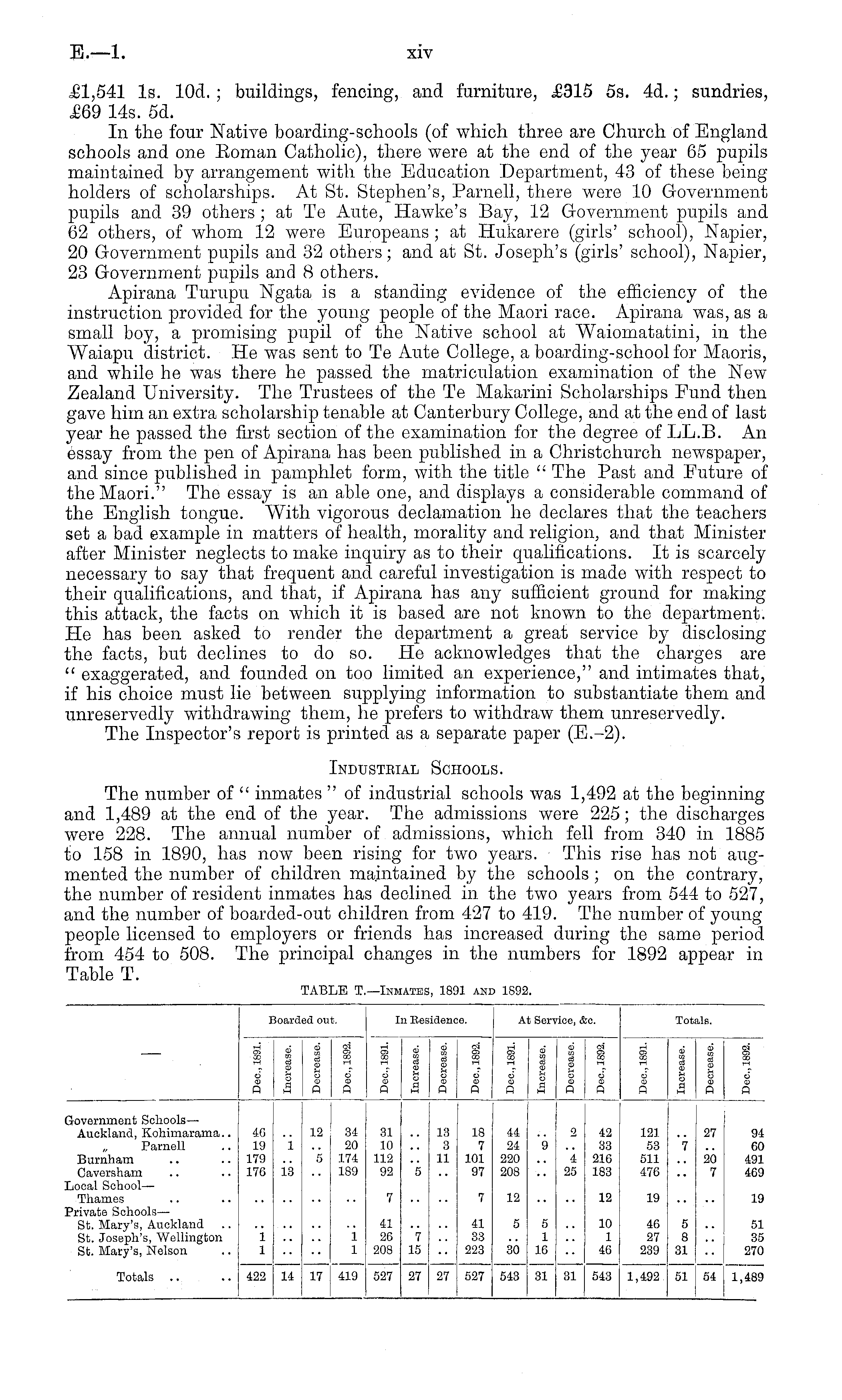 £1,541 Is. lOd. ; buildings, fencing, and furniture, £315 ss. 4d.; sundries, £69 14s. sd. In the four Native boarding-schools (of which three are Church of England schools and one Boman Catholic), there were at the end of the year 65 pupils maintained by arrangement with the Education Department, 43 of these being holders of scholarships. At St. Stephen's, Parnell, there were 10 Government pupils and 39 others ; at Te Aute, Hawke's Bay, 12 Government pupils and 62 others, of whom 12 were Europeans ; at Hukarere (girls' school), Napier, 20 Government pupils and 32 others; and at St. Joseph's (girls' school), Napier, 23 Government pupils and 8 others. Apirana Turupu Ngata is a standing evidence of the efficiency of the instruction provided for the young people of the Maori race. Apirana was, as a small boy, a promising pupil of the Native school at Waiomatatini, in the Waiapu district. He was sent to Te Aute College, a boarding-school for Maoris, and while he was there he passed the matriculation examination of the New Zealand University. The Trustees of the Te Makarini Scholarships Fund then gave him an extra scholarship tenable at Canterbury College, and at the end of last year he passed the first section of the examination for the degree of LL.B. An essay from the pen of Apirana has been published in a Christchurch newspaper, and since published in pamphlet form, with the title " The Past and Future of the Maori." The essay is an able one, and displays a considerable command of the English tongue. With vigorous declamation he declares that the teachers set a bad example in matters of health, morality and religion, and that Minister after Minister neglects to make inquiry as to their qualifications. It is scarcely necessary to say that frequent and careful investigation is made with respect to their qualifications, and that, if Apirana has any sufficient ground for making this attack, the facts on which it is based are not known to the department. He has been asked to render the department a great service by disclosing the facts, but declines to do so. He acknowledges that the charges are " exaggerated, and founded on too limited an experience," and intimates that, if his choice must lie between supplying information to substantiate them and unreservedly withdrawing them, he prefers to withdraw them unreservedly. The Inspector's report is printed as a separate paper (E.-2). Industrial Schools. The number of " inmates " of industrial schools was 1,492 at the beginning and 1,489 at the end of the year. The admissions were 225; the discharges were 228. The annual number of admissions, which fell from 340 in 1885 to 158 in 1890, has now been rising for two years. This rise has not augmented the number of children maintained by the schools ; on the contrary, the number of resident inmates has declined in the two years from 544 to 527, and the number of boarded-out children from 427 to 419. The number of young people licensed to employers or friends has increased during the same period from 454 to 508. The principal changes in the numbers for 1892 appear in Table T.