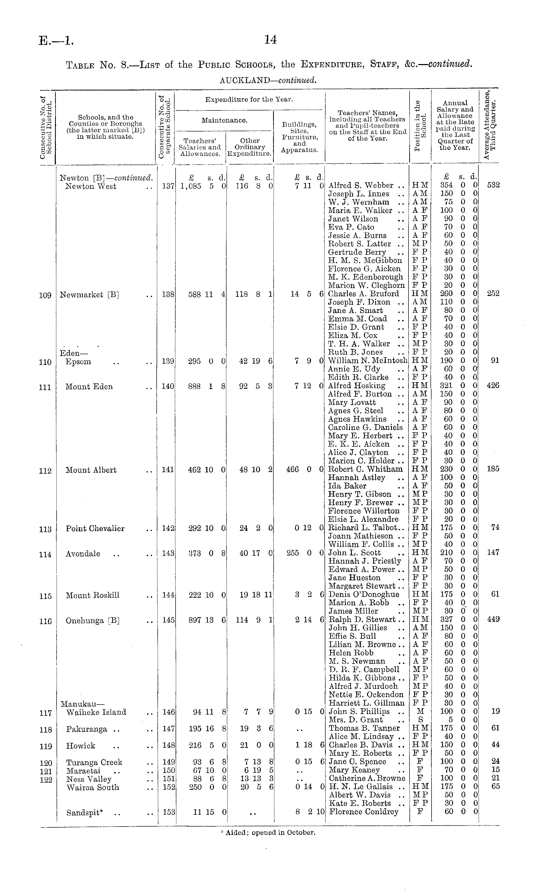 Table No. 8. —List of the Public Schools, the Expenditure, Staff, &c. — continued. AUCKLAND — continued.