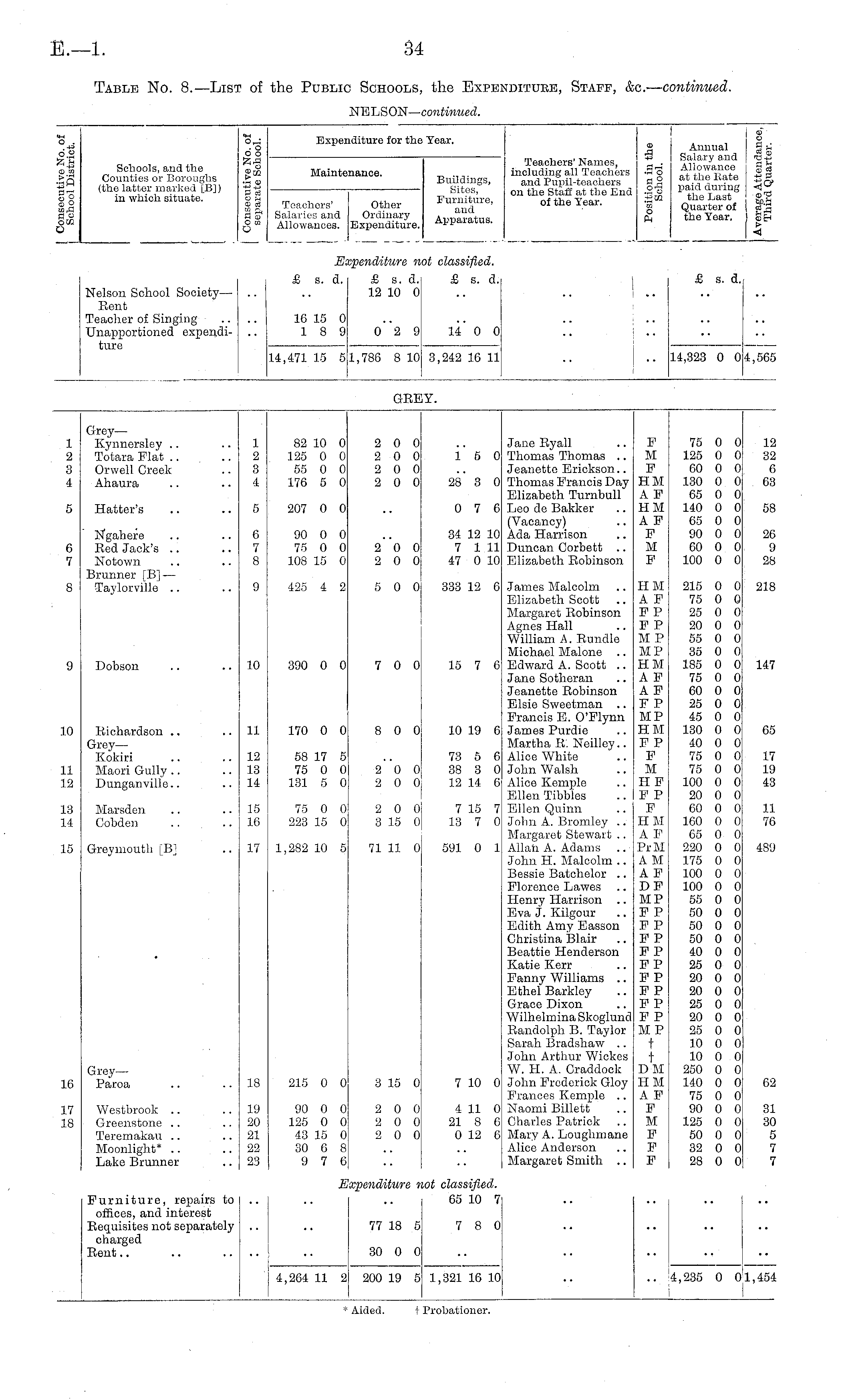 Table No. 8.—List of the Public Schools, the Expenditure, Staff, &c. — continued. NELSON— continued.