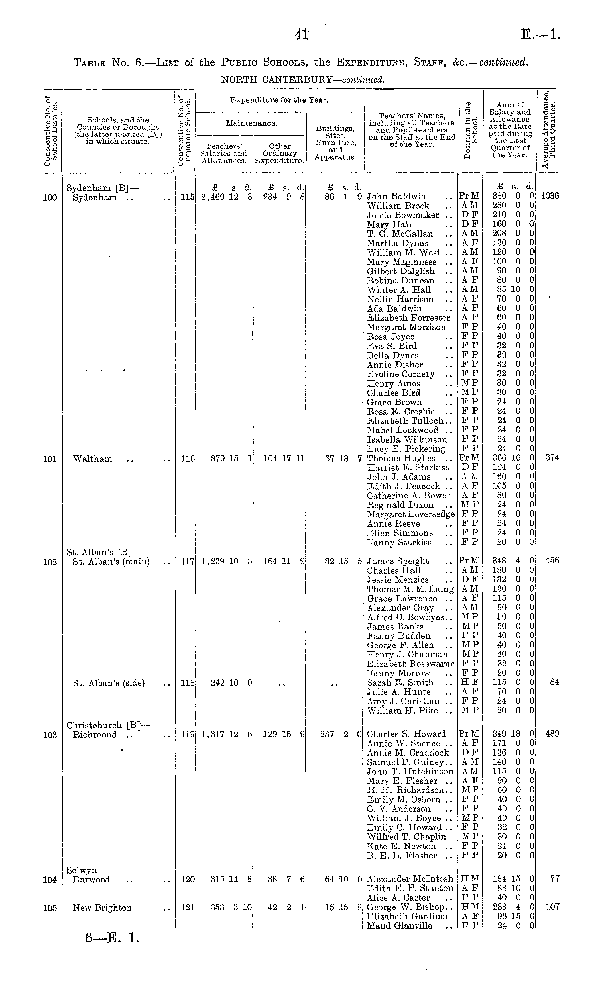 o . 8.2 A* Q 03 ■|« go o 2 3 © oai Schools, and the Counties or Boroughs (the latter marked [B]) in which situate. Oh d8 £■3 gco •£ o 3d © -H © c8 3 © I .9 » Maintenance. Expenditure for the Year. Teachers' Names, . . including all Teachers Buildings, ani i Pupil-teachers Sites, 011 t he Staff at the End Furniture, 0 f the Year. and Apparatus. © HH .S-S a S ° o £co o to I • Annual A Salary and *& S Allowance § a at the Kate £ 3 paid during <i^ the Last S^'H Quarter of ec^ the Year. © Eh p» Teachers' ] Other Salaries and i Ordinary Allowances. Expenditure. .00 Syaenham [B] — Syaenham .. 11: £ s. a., 2,469 12 3 £ s. a. 234 9 8 £ s. a. 86 1 9 John BaWwin William Brock Jessie Bowmaker .. Mary Hall T. G. McGallan .. Martha Dynes William M. West .. Mary Maginness .. Gilbert Dalglish .. Robina Duncan Winter A. Hall .. Nellie Harrison Ada Baldwin Elizabeth Forrester Margaret Morrison Rosa Joyce Eva S. Bira Bella Dynes Annie Disher Eveline Coraery .. Henry Amos Charles Bira Grace Brown Rosa E. Crosbie .. Elizabeth Tulloch.. Mabel Lookwooa .. Isabella Wilkinson Lucy E. Pickering 67 18 7 Thomas Hughes .. Harriet E. Starkiss John J. Adams Edith J. Peacock .. Catherine A. Bower Reginald Dixon Margaret Leversedge Annie Reeve Ellen Simmons Fanny Starkiss PrM AM DF DF AM A F AM A F AM A F AM A F A F A F F P F P F P F P F P F P MP MP F P F P F P F P F P F P PrM DF AM A F A F MP F P F P F P F P £ s. a. 380 0 0 1036 280 0 0 210 0 0 160 0 0 208 0 0 130 0 0 120 0 0 100 0 0 90 0 0 80 0 0 85 10 0 70 0 0 • 60 0 0 60 0 0 40 0 0 40 0 0 32 0 0 32 0 0 32 0 0 32 0 0 30 0 0 30 0 0 24 0 0 24 0 0 24 0 0 24 0 0 24 0 0 24 0 0 366 16 0 374 124 0 0 160 0 0 105 0 0 80 0 0 24 0 0 24 0 0 24 0 0 24 0 0 20 0 0 .01 Waltham 116 879 15 1 104 17 111 67 18 7 St. Alban's [BJ — St. Alban's (main) .02 117 1,239 10 3 164 11 9 82 15 5 James Speight Charles Hall Jessie Menzies Thomas M.M.Laing Grace Lawrence .. Alexander Gray Alfred C. Bowbyes.. James Banks Fanny Budden George F. Allen Henry J. Chapman Elizabeth Rosewarne Fanny Morrow Sarah E. Smith .. Julie A. Hunte Amy J. Christian .. William H. Pike .. 82 15 5 PrM AM DF AM A F AM MP MP F P MP MP F P F P HF A F F P MP 348 4 0 456 180 0 0 132 0 0 130 0 0 115 0 0 90 0 0 50 0 0 50 0 0 40 0 0 40 0 0 40 0 0 32 0 0 20 0 0 115 0 0 84 70 0 0 24 0 0 20 0 0 St. Alban's (side) 118 242 10 0 Christchurch [B] — Richmond .. 1,317 12 6 129 16 9 237 2 0 Charles S. Howard Annie W. Spence .. Annie M. Craddock Samuel P. Guiney.. John T. Hutchinson Mary E. Flesher .. H. H. Richardson.. Emily M. Osborn .. C. V. Anderson William J. Boyce .. Emily C. Howard .. Wilfred T. Chaplin Kate E. Newton .. B. E. L. Flesher .. 237 2 0 PrM A F DF AM AM A F MP F P F P MP F P MP F P F P 349 18 0 489 171 0 0 136 0 0 140 0 0 115 0 0 90 0 0 50 0 0 40 0 0 40 0 0 40 0 0 32 0 0 30 0 0 24 0 0 20 0 0 .03 119 .04 Selwyn— Burwood 120, 315 14 8 38 7 6: 64 10 0 Alexander Mcintosh Edith E. F. Stanton Alice A. Carter 15 15 8 George W. Bishop.. Elizabeth Gardiner Maud Glanville 64 10 0 HM A F F P HM A F F P 184 15 0 77 88 10 0 40 0 0 233 4 0 107 96 15 0 24 0 0 77 .05 New Brighton 121 353 3 10 42 2 1 15 15 8 107 6—E. 1.