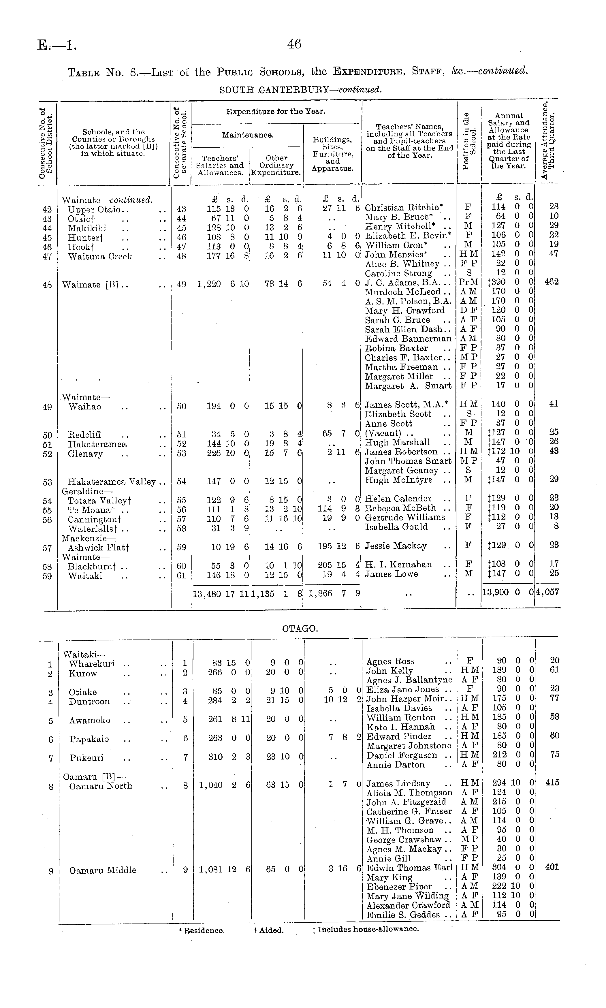 Table No. 8. —List of the Public Schools, the Expenditure, Staff, &c. — continued. SOUTH CANTERBURY—continued.