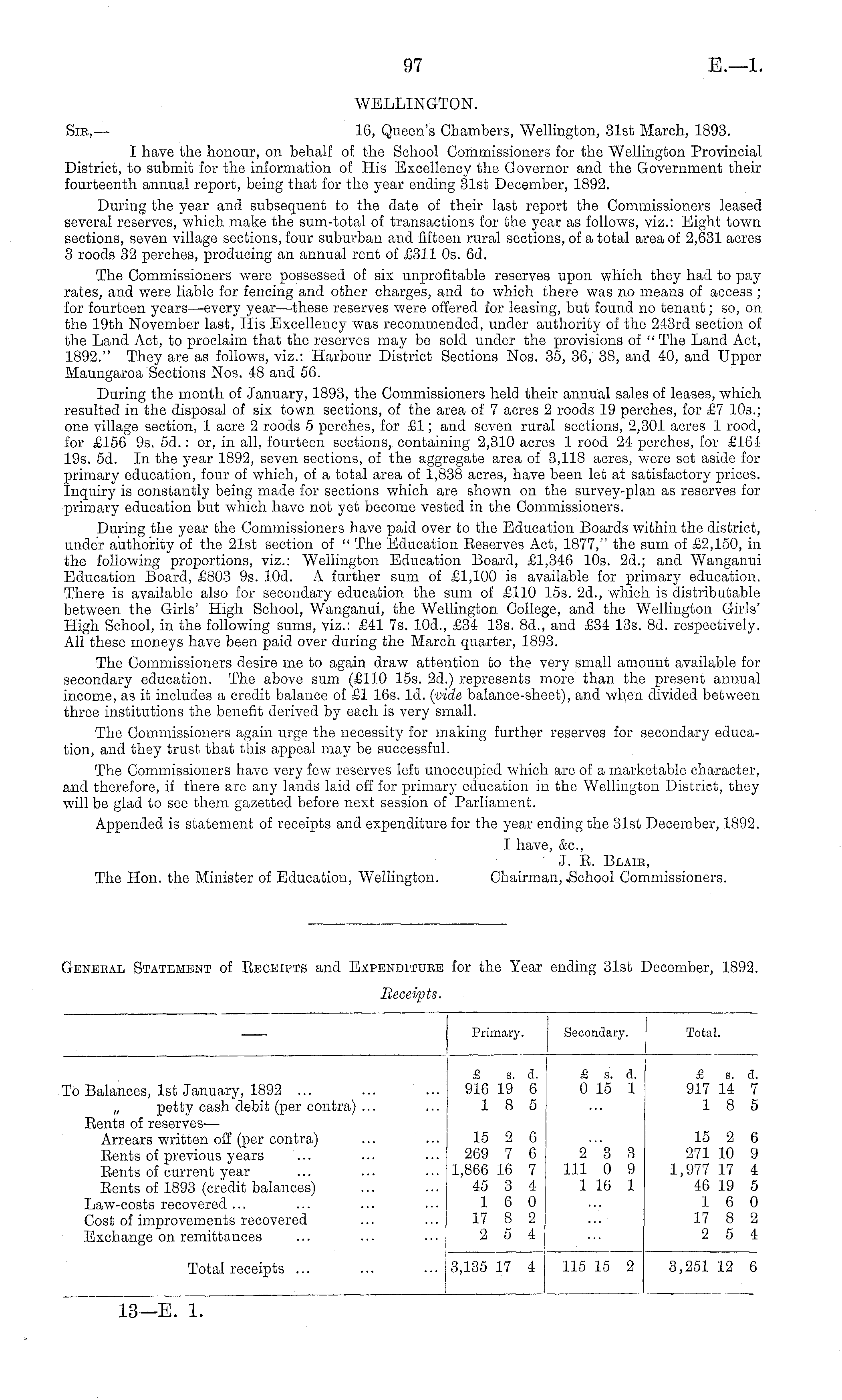 WELLINGTON. Sir, — 16, Queen's Chambers, Wellington, 31st March, 1893. I have the honour, on behalf of the School Commissioners for the Wellington Provincial District, to submit for the information of His Excellency the Governor and the Government their fourteenth annual report, being that for the year ending 31st December, 1892. During the year and subsequent to the date of their last report the Commissioners leased several reserves, which make the sum-total of transactions for the year as follows, viz.: Eight town sections, seven village sections, four suburban and fifteen rural sections, of a total area of 2,631 acres 3 roods 32 perches, producing an annual rent of £311 Os. 6d. The Commissioners were possessed of six unprofitable reserves upon which they had to pay rates, and were liable for fencing and other charges, and to which there was no means of access ; for fourteen years—every year —these reserves were offered for leasing, but found no tenant; so, on. the 19th November last, His Excellency was recommended, under authority of the 243 rd section of the Land Act, to proclaim that the reserves may be sold under the provisions of "The Land Act, 1892." They are as follows, viz.: Harbour District Sections Nos. 35, 36, 38, and 40, and Upper Maungaroa'Sections Nos. 48 and 56. During the month of January, 1893, the Commissioners held their annual sales of leases, which resulted in the disposal of six town sections, of the area of 7 acres 2 roods 19 perches, for £7 10s.; one village section, 1 acre 2 roods 5 perches, for £1; and seven rural sections, 2,301 acres 1 rood, for £156 9s. 5d.: or, in all, fourteen sections, containing 2,310 acres 1 rood 24 perches, for £164 19s. sd. In the year 1892, seven sections, of the aggregate area of 3,118 acres, were set aside for primary education, four of which, of a total area of 1,838 acres, have been let at satisfactory prices. Inquiry is constantly being made for sections which are shown on the survey-plan as reserves for primary education but which have not yet become vested in the Commissioners. During the year the Commissioners have paid over to the Education Boards within the district, under authority of the 21st section of " The Education Eeserves Act, 1877," the sum of £2,150, in the following proportions, viz.: Wellington Education Board, £1,346 10s. 2d.; and Wanganui Education Board, £803 9s. lOd. A further sum of £1,100 is available for primary education. There is available also for secondary education the sum of £110 15s. 2d., which is distributable between the Girls' High School, Wanganui, the Wellington College, and the Wellington Girls' High School, in the following sums, viz.: £41 7s. 10d., £34 13s. Bd., and £34 13s. Bd. respectively. All these moneys have been paid over during the March quarter, 1893. The Commissioners desire me to again draw attention to the very small amount available for secondary education. The above sum (£llO 15s. 2d.) represents more than the present annual income, as it includes a credit balance of £1 16s. Id. (vide balance-sheet), and when divided between three institutions the benefit derived by each is very small. The Commissioners again urge the necessity for making further reserves for secondary education, and they trust that this appeal may be successful. The Commissioners have very few reserves left unoccupied which are of a marketable character, and therefore, if there are any lands laid off for primary education in the Wellington District, they will be glad to see them gazetted before next session of Parliament. Appended is statement of receipts and expenditure for the year ending the 31st December, 1892. I have, &c, J. B. Blair, The Hon. the Minister of Education, Wellington. Chairman, .School Commissioners.