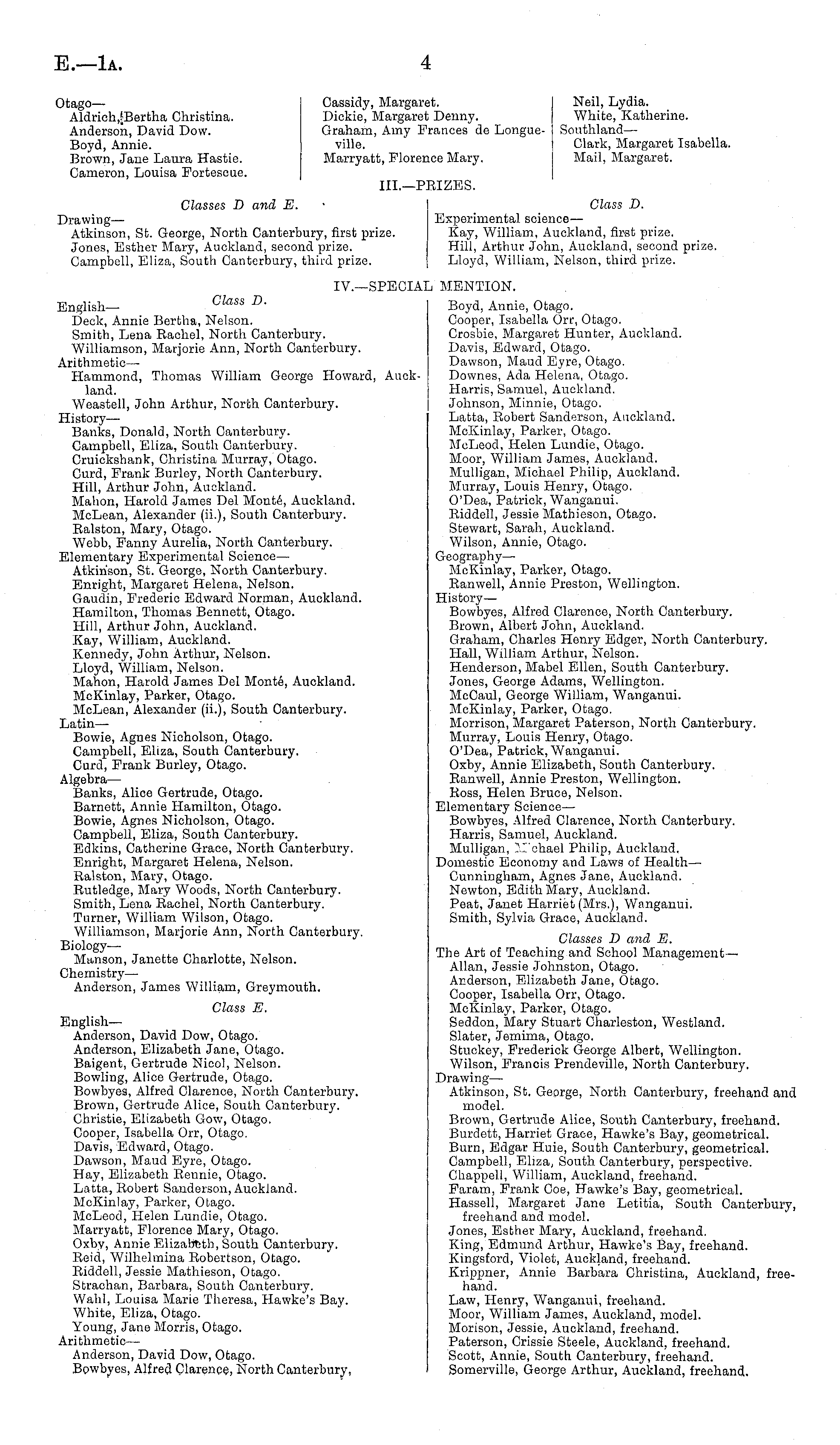 lII.—PEIZES. Classes D and E. ■ Class D. Drawing— Experimental science— Atkinson, St. George, North Canterbury, first prize. Kay, William, Auckland, first prize. Jones, Esther Mary, Auckland, second prize. Hill, Arthur John, Auckland, second prize. Campbell, Eliza, South Canterbury, third prize. Lloyd, William, Nelson, third prize. IV.—SPECIAL MENTION.