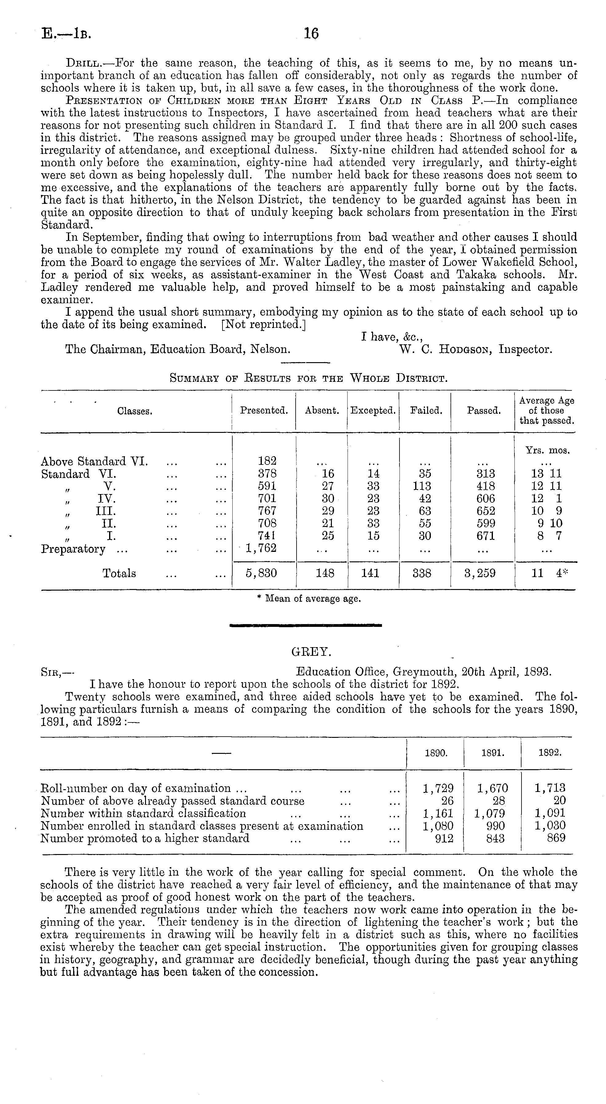 GEEY. Sik,— Education Office, Greymouth, 20th April, 1893. I have the honour to report upon the schools of the district for 1892. Twenty schools were examined, and three aided schools have yet to be examined. The following particulars furnish a means of comparing the condition of the schools for the years 1890, 1891, and 1892 :—