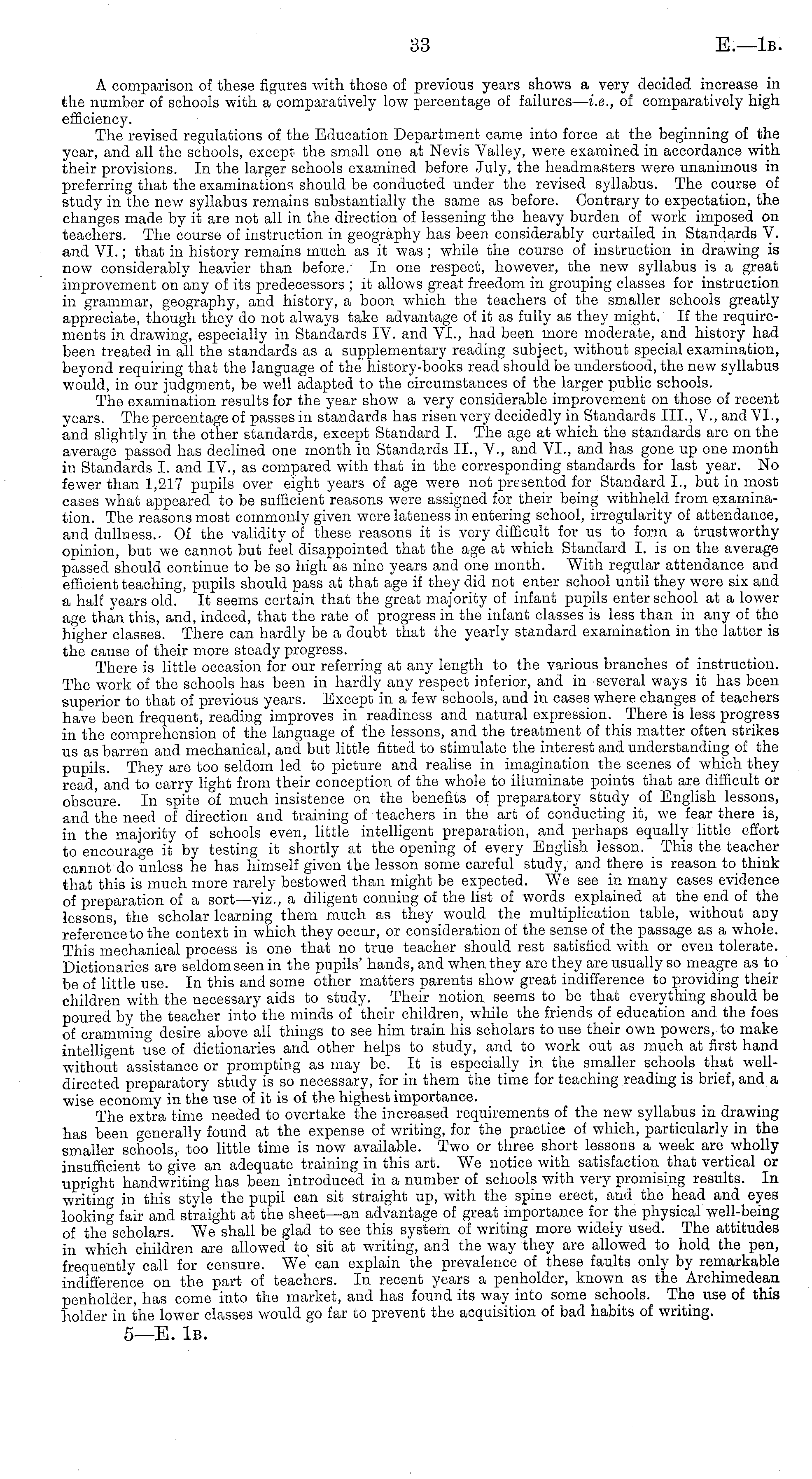 A comparison of these figures with those of previous years shows a very decided increase in the number of schools with a comparatively low percentage of failures— i.e., of comparatively high efficiency. The revised regulations of the Education Department came into force at the beginning of the year, and all the schools, except the small one at Nevis Valley, were examined in accordance with their provisions. In the larger schools examined before July, the headmasters were unanimous in preferring that the examinations should be conducted under the revised syllabus. The course of study in the new syllabus remains substantially the same as before. Contrary to expectation, the changes made by it are not all in the direction of lessening the heavy burden of work imposed on teachers. The course of instruction in geography has been considerably curtailed in Standards V. and VI.; that in history remains much as it was ; while the course of instruction in drawing is now considerably heavier than before. In one respect, however, the new syllabus is a great improvement on any of its predecessors ; it allows great freedom in grouping classes for instruction in grammar, geography, and history, a boon which the teachers of the smaller schools greatly appreciate, though they do not always take advantage of it as fully as they might. If the requirements in drawing, especially in Standards IV. and VI., had been more moderate, and history had been treated in all the standards as a supplementary reading subject, without special examination, beyond requiring that the language of the history-books read should be understood, the new syllabus would, in our judgment, be well adapted to the circumstances of the larger public schools. The examination results for the year show a very considerable improvement on those of recent years. The percentage of passes in standards has risen very decidedly in Standards 111., V., and VI., and slightly in the other standards, except Standard I. The age at which the standards are on the average passed has declined one month in Standards 11., V., and VI., and has gone up one month in Standards I. and IV., as compared with that in the corresponding standards for last year. No fewer than 1,217 pupils over eight years of age were not presented for Standard 1., but in most cases what appeared to be sufficient reasons were assigned for their being withheld from examination. The reasons most commonly given were lateness in entering school, irregularity of attendance, and dullness.- Of the validity of these reasons it is very difficult for us to form a trustworthy opinion, but we cannot but feel disappointed that the age at which Standard I. is on the average passed should continue to be so high as nine years and one month. With regular attendance and efficient teaching, pupils should pass at that age if they did not enter school until they were six and a half years old. It seems certain that the great majority of infant pupils enter school at a lower age than this, and, indeed, that the rate of progress in the infant classes is less than in any of the higher classes. There can hardly be a doubt that the yearly standard examination in the latter is the cause of their more steady progress. There is little occasion for our referring at any length to the various branches of instruction. The work of the schools has been in hardly any respect inferior, and in several ways it has been superior to that of previous years. Except in a few schools, and in cases where changes of teachers have been frequent, reading improves in readiness and natural expression. There is less progress in the comprehension of the language of the lessons, and the treatment of this matter often strikes us as barren and mechanical, and but little fitted to stimulate the interest and understanding of the pupils. They are too seldom led to picture and realise in imagination the scenes of which they read, and to carry light from their conception of the whole to illuminate points that are difficult or obscure. In spite of much insistence on the benefits of preparatory study of English lessons, and the need of direction and training of teachers in the art of conducting it, we fear there is, in the majority of schools even, little intelligent preparation, and perhaps equally little effort to encourage it by testing it shortly at the opening of every English lesson. This the teacher cannot do unless he has himself given the lesson some careful study, and there is reason to_ think that this is much more rarely bestowed than might be expected. We see in many cases evidence of preparation of a sort —viz., a diligent conning of the list of words explained at the end of the lessons, the scholar learning them much as they would the multiplication table, without any reference to the context in which they occur, or consideration of the sense of the passage as a whole. This mechanical process is one that no true teacher should rest satisfied with or even tolerate. Dictionaries are seldom seen in the pupils' hands, and when they are they are usually so meagre as to be of little use. In this and some other matters parents show great indifference to providing their children with the necessary aids to study. Their notion seems to be that everything should be poured by the teacher into the minds of their children, while the friends of education and the foes of cramming desire above all things to see him train his scholars to use their own powers, to make intelligent use of dictionaries and other helps to study, and to work out as much at first hand without assistance or prompting as may be. It is especially in the smaller schools that welldirected preparatory study is so necessary, for in them the time for teaching reading is brief, and a wise economy in the use of it is of the highest importance. The extra time needed to overtake the increased requirements of the new syllabus in drawing has been generally found at the expense of writin