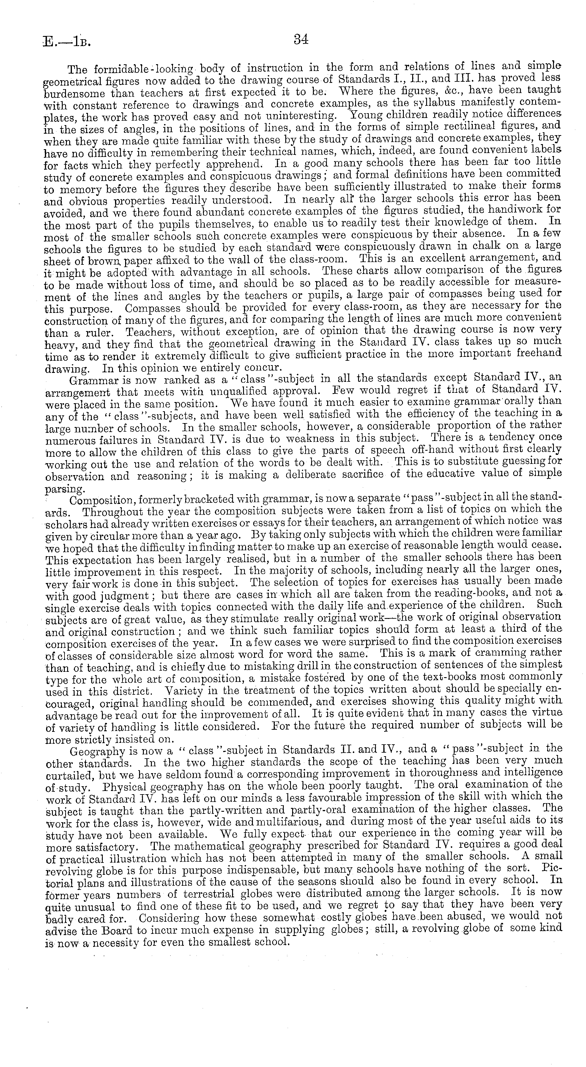 The formidable-looking body of instruction in the form and relations of lines and simple geometrical figures now added to the drawing course of Standards 1., 11., and 111. has proved less burdensome than teachers at first expected it to be. Where the figures, &c, have been taught with constant reference to drawings and concrete examples, as the syllabus manifestly contemplates, the work has proved easy and not uninteresting. Young children readily notice differences in the sizes of angles, in the positions of lines, and in the forms of simple rectilineal figures, and when they are made quite familiar with these by the study of drawings and concrete examples, they have no difficulty in remembering their technical names, which, indeed, are found convenient labels for facts which they perfectly apprehend. In a good many schools there has been far too little study of concrete examples and conspicuous drawings; and formal definitions have been committed to memory before the figures they describe have been sufficiently illustrated to make their forms and obvious properties readily understood. In nearly all" the larger schools this error has been avoided, and we there found abundant concrete examples of the figures studied, the handiwork for the most part of the pupils themselves, to enable us to readily test their knowledge of them. In most of the smaller schools such concrete examples were conspicuous by their absence. In a few schools the figures to be studied by each standard were conspicuously drawn in chalk on a large sheet of brown paper affixed to the wall of the class-room. This is an excellent arrangement, and it might be adopted with advantage in all schools. These charts allow comparison of the figures to be made without loss of time, and should be so placed as to be readily accessible for measurement of the lines and angles by the teachers or pupils, a large pair of compasses being used for this purpose. Compasses should be provided for every class-room, as they are necessary for the construction of many of the figures, and for comparing the length of lines are much more convenient than a ruler. Teachers, without exception, are of opinion that the drawing course is now very heavy, and they find that the geometrical drawing in the Standard IV. class takes up so much time as to render it extremely difficult to give sufficient practice in the more important freehand drawing. In this opinion we entirely concur. Grammar is now ranked as a " class "-subject in all the standards except Standard IV., an arrangement that meets with unqualified approval. Few would regret if that of Standard IV. were placed in the same position. We have found it much easier to examine grammar orally than any of the " class "-subjects, and have been well satisfied with the efficiency of the teaching in a large number of schools. In the smaller schools, however, a considerable proportion of the rather numerous failures in Standard IV. is due to weakness in this subject. There is a tendency once more to allow the children of this class to give the parts of speech off-hand without first clearly working out the use and relation of the words to be dealt with. This is to substitute guessing for observation and reasoning ; it is making a deliberate sacrifice of the educative value of simple Composition, formerly bracketed with grammar, is now a separate "pass "-subject in all the standards. Throughout the year the composition subjects were taken from a list of topics on which the scholars had already written exercises or essays for their teachers, an arrangement of which notice was given by circular more than a year ago. By taking only subjects with which the children were familiar we hoped that the difficulty in finding matter to make up an exercise of reasonable length would cease. This expectation has been largely realised, but in a number of the smaller schools there has been little improvement in this respect. In the majority of schools, including nearly all the larger ones, very fair work is done in this subject. The selection of topics for exercises has usually been made with good judgment; but there are cases in which all are taken from the reading-books, and not a> single exercise deals with topics connected with the daily life and,experience of the children. Such subjects are of great value, as they stimulate really original work—the work of original observation and original construction ; and we think such familiar topics should form at least a third of the composition exercises of the year. In a few cases we were surprised to find the composition exercises of classes of considerable size almost word for word the same. This is a mark of cramming rather than of teaching, and is chiefly due to mistaking drill in the construction of sentences of the simplest type for the whole art of composition, a mistake fostered by one of the text-books most commonly used in this district. Variety in the treatment of the topics written about should be specially encouraged, original handling should be commended, and exercises showing this quality might with advantage be read out for the improvement of all. It is quite evidenc that in many cases the virtue of variety of handling is little considered. For the future the required number of subjects will be more strictly insisted, on. ~..., Geography is now a " class "-subject in Standards 11. and IV., and a " pass -subject in the other standards. In the two higher standards the scope of the teaching has been very much curtailed, but we have seldom found a corresponding improvement in thoroughness and intelligence of study. Physical geography has on the whole been poorly taught. The oral examination of the work of Standard IV. has left on our minds a less favourable impression of the skill with which the subject is taught than the partly-written and partly-oral examination of the higher classes. The work for the class is, however, wide and multifarious, and during most of the