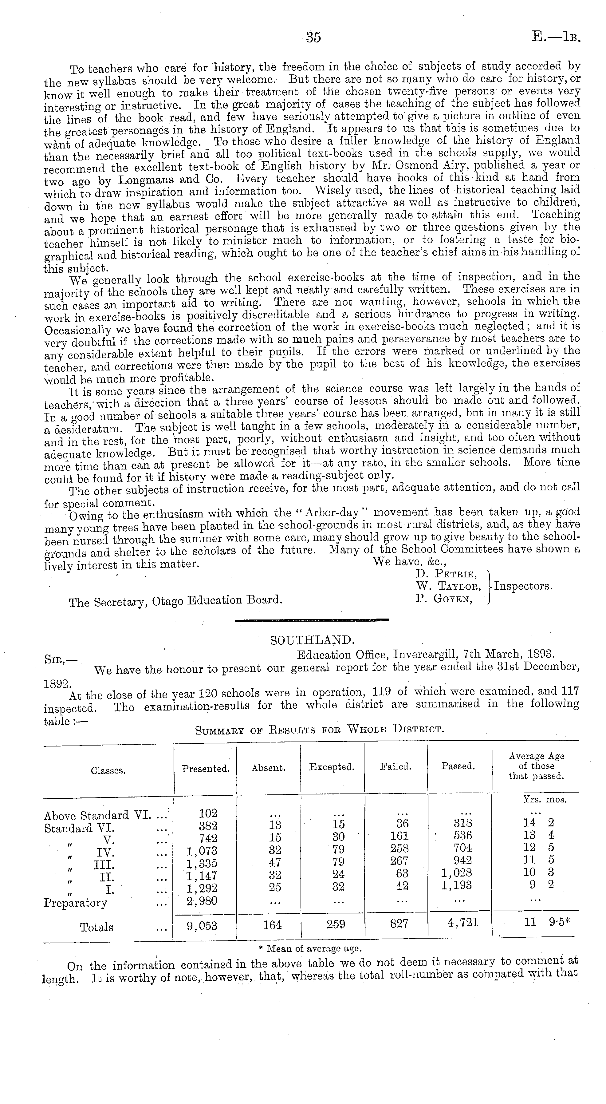 SOUTHLAND. g lr Education Office, Invercargill, 7th March, 1893. We have the honour to present our general report for the year ended the 31st December, 1892 At the close of the year 120 schools were in operation, 119 of which were examined, and 117 inspected. The examination-results for the whole district are summarised in the following