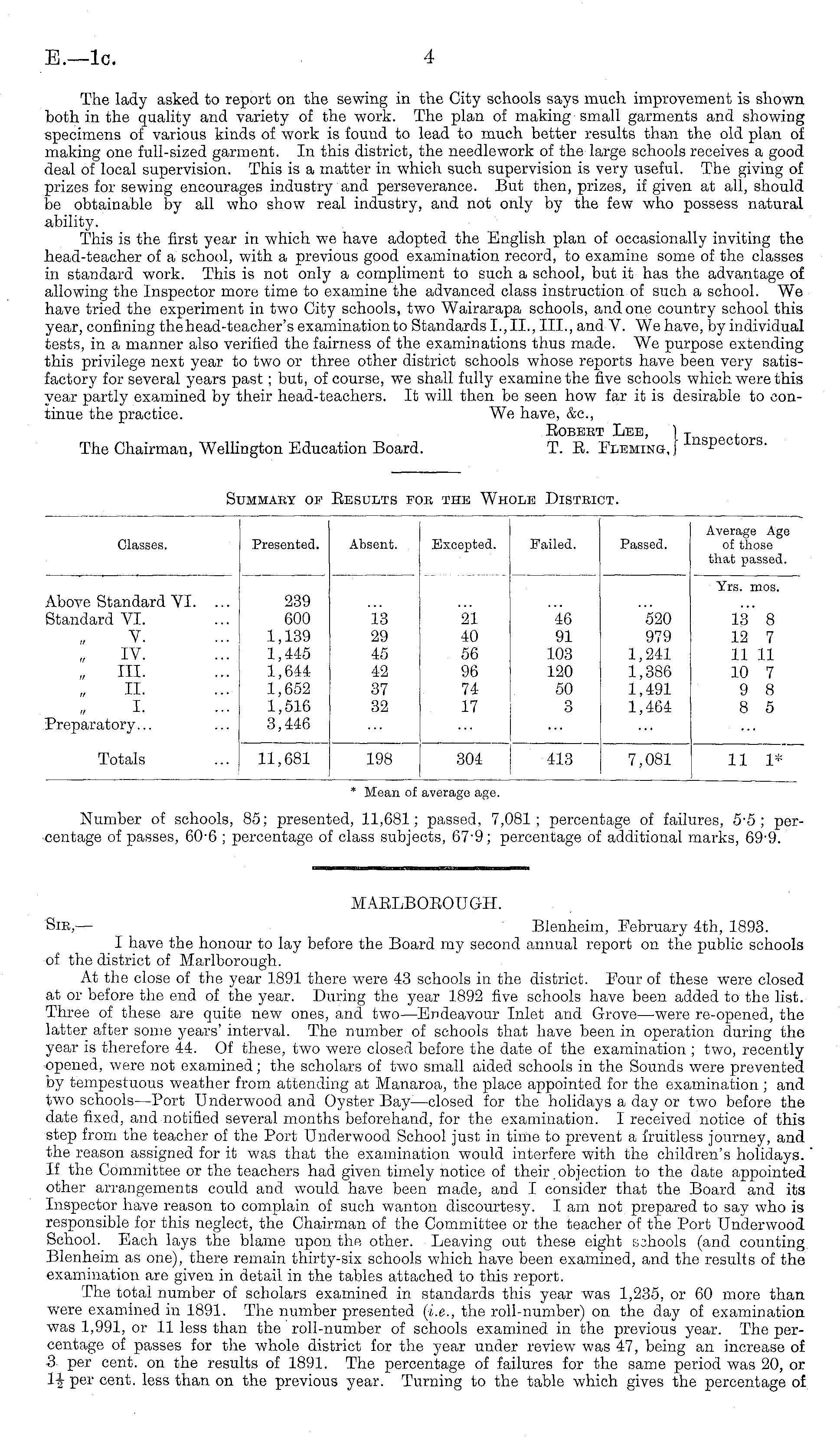 MABLBOBOUGH. Sib,— Blenheim, February 4th, 1893. I have the honour to lay before the Board my second annual report on the public schools of the district of Marlborough. At the close of the year 1891 there were 43 schools in the district. Four of these were closed at or before the end of the year. During the year 1892 five schools have been added to the list. Three of these are quite new ones, and two—Endeavour Inlet and Grove—were re-opened, the latter after some years' interval. The number of schools that have been in operation during the year is therefore 44. Of these, two were closed before the date of the examination ; two, recently opened, were not examined; the scholars of two small aided schools in the Sounds were prevented by tempestuous weather from attending at Manaroa, the place appointed for the examination ; and two schools—Port Underwood and Oyster Bay—closed for the holidays a clay or two before the date fixed, and notified several months beforehand, for the examination. I received notice of this step from the teacher of the Port Underwood School just in time to prevent a fruitless journey, and the reason assigned for it was that the examination would interfere with the children's holidays. If the Committee or the teachers had given timely notice of their objection to the date appointed other arrangements could and would have been made, and I consider that the Board and its Inspector have reason to complain of such wanton discourtesy. lam not prepared to say who is responsible for this neglect, the Chairman of the Committee or the teacher of the Port Underwood School. Each lays the blame upon the other. Leaving out these eight sahools (and counting Blenheim as one), there remain thirty-six schools which have been examined, and the results of the examination are given in detail in the tables attached to this report. The total number of scholars examined in standards this year was 1,235, or 60 more than were examined in 1891. The number presented (i.e., the roll-number) on the day of examination was 1,991, or 11 less than the roll-number of schools examined in the previous year. The percentage of passes for the whole district for the year under review was 47, being an increase of 3 per cent, on the results of 1891. The percentage of failures for the same period was 20, or 1J per cent, less than on the previous year. Turning to the table which gives the percentage of