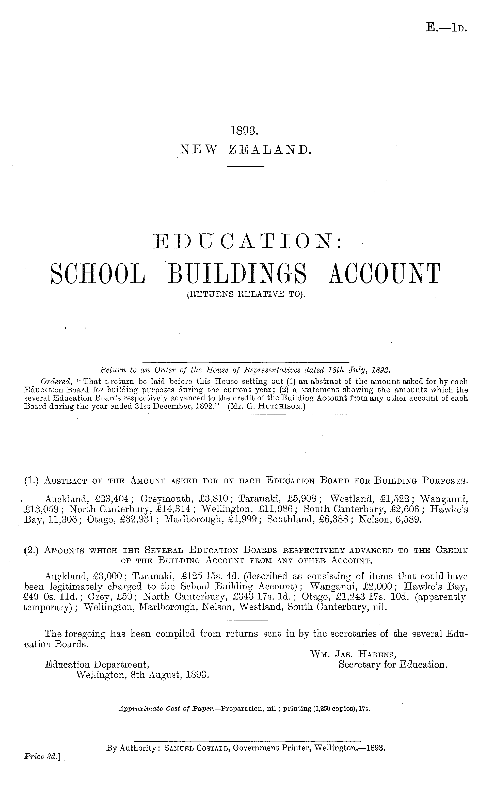 (1.) Absteact op the Amount asked foe by each Education Boaed foe Building Pueposes. Auckland, £23,404; Greymouth, £3,810; Taranaki, £5,908; Westland, £1,522; Wanganui, £13,059; North Canterbury, £14,314 ; Wellington, £11,986; South Canterbury, £2,606 ; Hawke's Bay, 11,306; Otago, £32,931; Marlborough, £1,999; Southland, £6,388; Nelson, 6,589. (2.) Amounts which the Sevebal Education Boaeds eespectively advanced to the Ceedit of the Building Account feom any othee Account. Auckland, £3,000; Taranaki, £125 15s. 4d. (described as consisting of items that could have been legitimately charged to the School Building Account); Wanganui, £2,000; Hawke's Bay, £49 os. lid.; Grey, £50; North Canterbury, £343 17s. Id.; Otago, £1,243 17s. 10d. (apparently temporary) ; Wellington, Marlborough, Nelson, Westland, South Canterbury, nil. The foregoing has been compiled from returns sent in by the secretaries of the several Education Boards. Wμ. Jas. Habens, Education Department, Secretary for Education. Wellington, Bth August, 1893. Approximate Cost of Paper.— Preparation, nil; printing (1,250 copies), 17s.