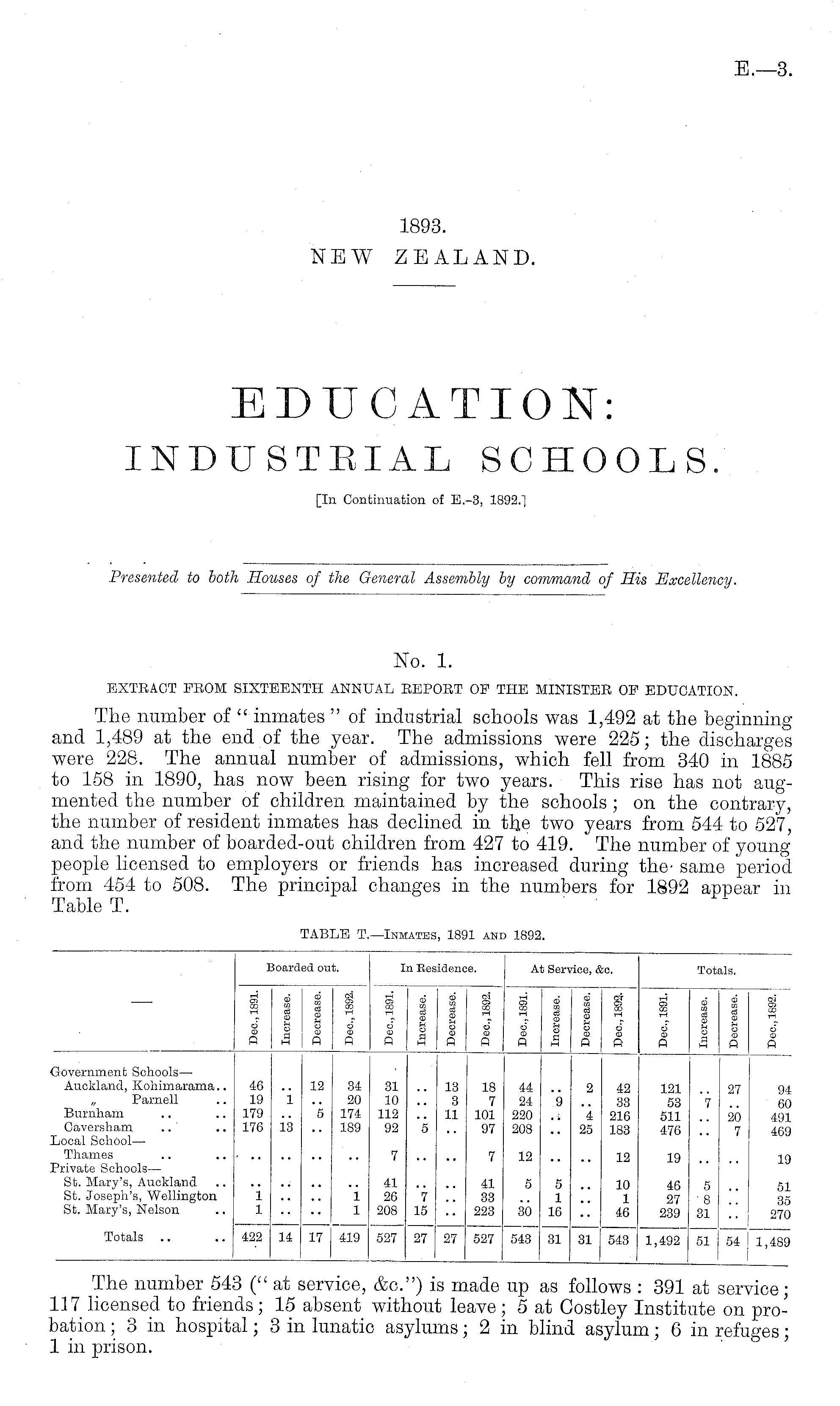 No. 1. EXTRACT FROM SIXTEENTH ANNUAL REPORT OP THE MINISTER OF EDUCATION. The number of " inmates " of industrial schools was 1,492 at the beginning and 1,489 at the end of the year. The admissions were 225; the discharges were 228. The annual number of admissions, which fell from 340 in 1885 to 158 in 1890, has now been rising for two years. This rise has not augmented the number of children maintained by the schools ; on the contrary, the number of resident inmates has declined in the two years from 544 to 527, and the number of boarded-out children from 427 to 419. The number of young people licensed to employers or friends has increased during the- same period from 454 to 508. The principal changes in the numbers for 1892 appear in Table T.