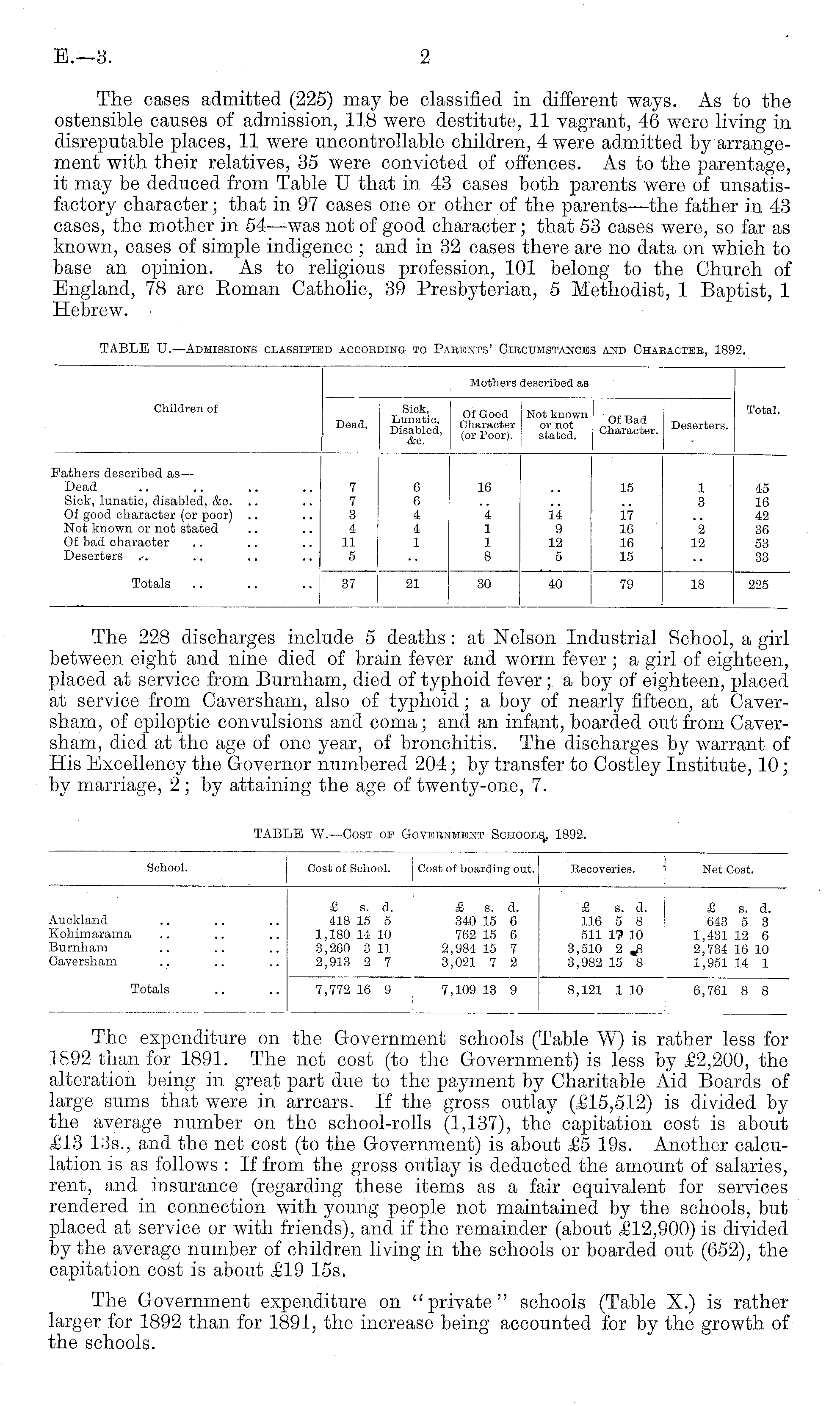 The expenditure on the Government schools (Tahle W) is rather less for 1692 than for 1891. The net cost (to the Government) is less by £2,200, the alteration being in great part due to the payment by Charitable Aid Boards of large sums that were in arrears. If the gross outlay (£15,512) is divided by the average number on the school-rolls (1,137), the capitation cost is about £13 135., and the net cost (to the Government) is about £5 19s. Another calculation is as follows : If from the gross outlay is deducted the amount of salaries, rent, and insurance (regarding these items as a fair equivalent for services rendered in connection with young people not maintained by the schools, but placed at service or with friends), and if the remainder (about £12,900) is divided by the average number of children living in the schools or boarded out (652), the capitation cost is about £19 15s. The Government expenditure on "private" schools (Table X.) is rather larger for 1892 than for 1891, the increase being accounted for by the growth of the schools.