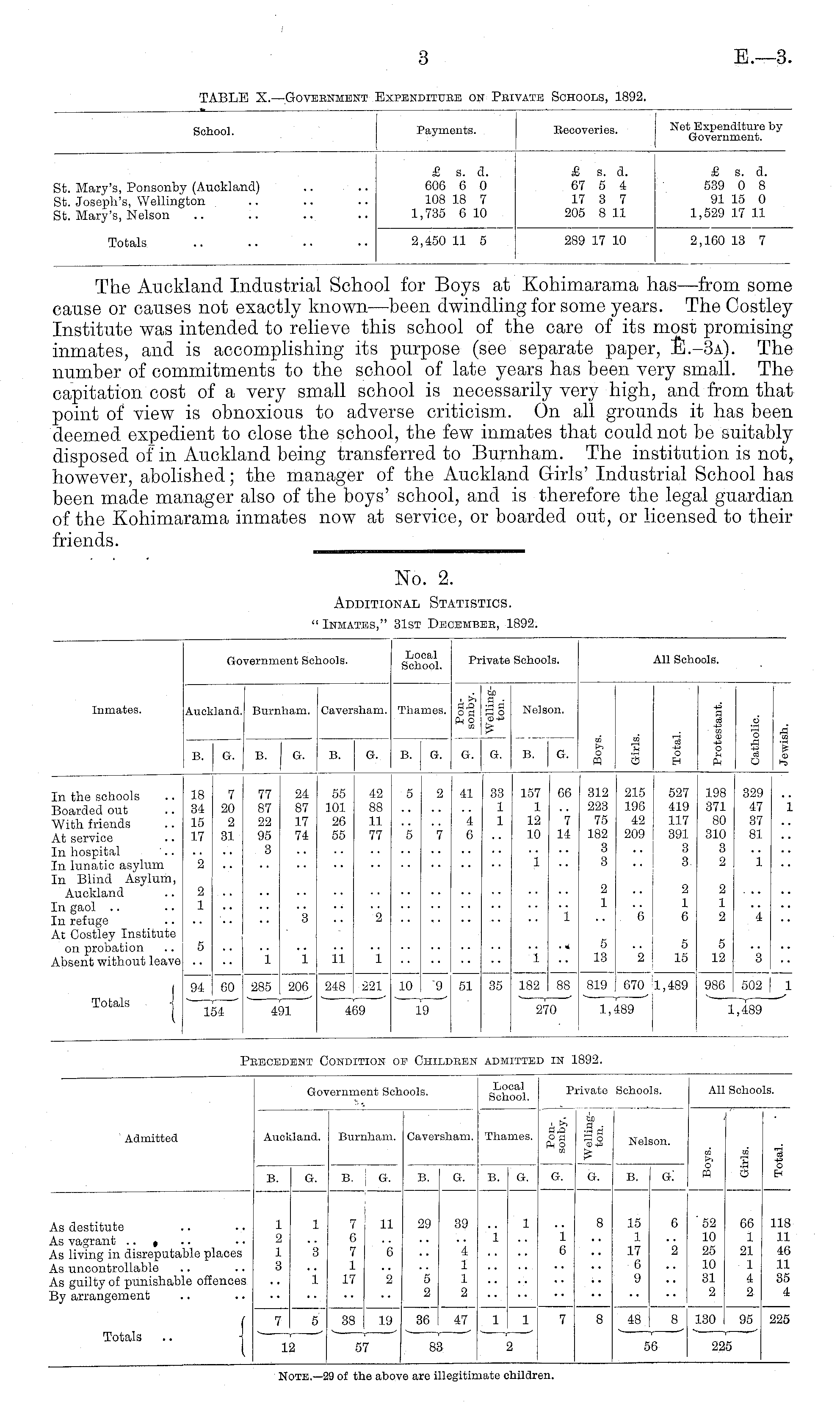 The Auckland Industrial School for Boys at Kohimarama has—from some cause or causes not exactly known —been dwindling for some years. The Costley Institute was intended to relieve this school of the care of its most promising inmates, and is accomplishing its purpose (see separate paper, E.-3a). The number of commitments to the school of late years has been very small. The capitation cost of a very small school is necessarily very high, and from that point of view is obnoxious to adverse criticism. On all grounds it has been deemed expedient to close the school, the few inmates that could not be suitably disposed of in Auckland being transferred to Burnham. The institution is not,, however, abolished; the manager of the Auckland Girls' Industrial School has been made manager also of the boys' school, and is therefore the legal guardian of the Kohimarama inmates now at service, or boarded out, or licensed to their friends.