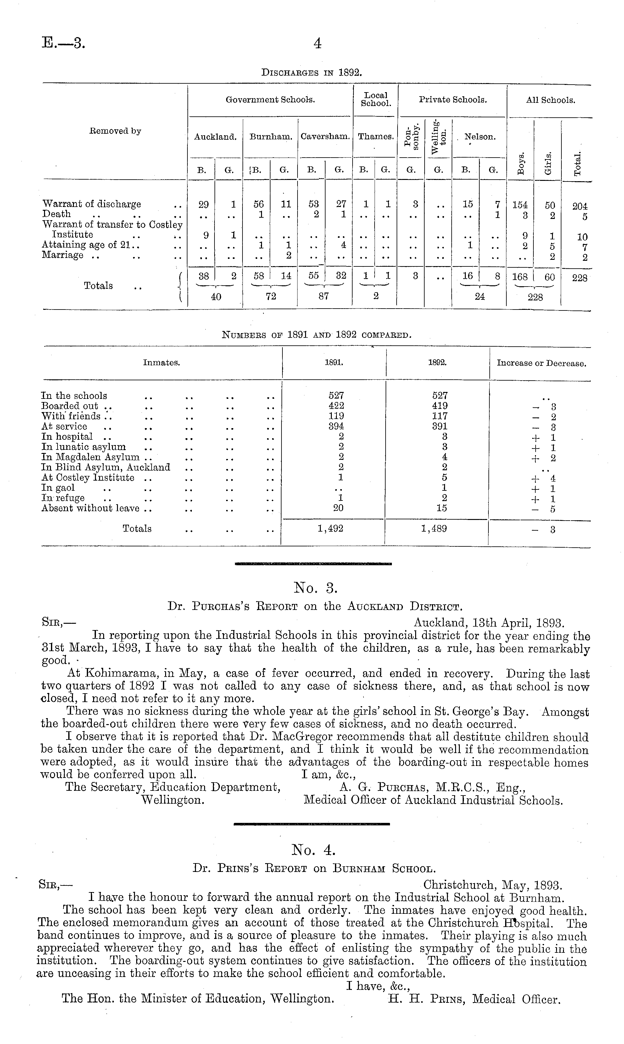No. 3. Dr. Pueohas's Eepoet on the Auckland Distbict. Sir, — Auckland, 13th April, 1893. In reporting upon the Industrial Schools in this provincial district for the year ending the 31st March, 1893, I have to say that the health of the children, as a rule, has been remarkably good. ■ At Kohimarama, in May, a case of fever occurred, and ended in recovery. During the last two quarters of 1892 I was not called to any case of sickness there, and, as that school is now closed, I need not refer to it any more. There was no sickness during the whole year at the girls' school in St. George's Bay. Amongst the boarded-out children there were very few cases of sickness, and no death occurred. I observe that it is reported that Dr. MacGregor recommends that all destitute children should be taken under the care of the department, and I think it would be well if the recommendation were adopted, as it would insure that the advantages of the boarding-out in respectable homes would be conferred upon all. I am, &c, The Secretary, Education Department, A. G. Pdechas, M.R.C.S., Eng., "Wellington. Medical Officer of Auckland Industrial Schools.