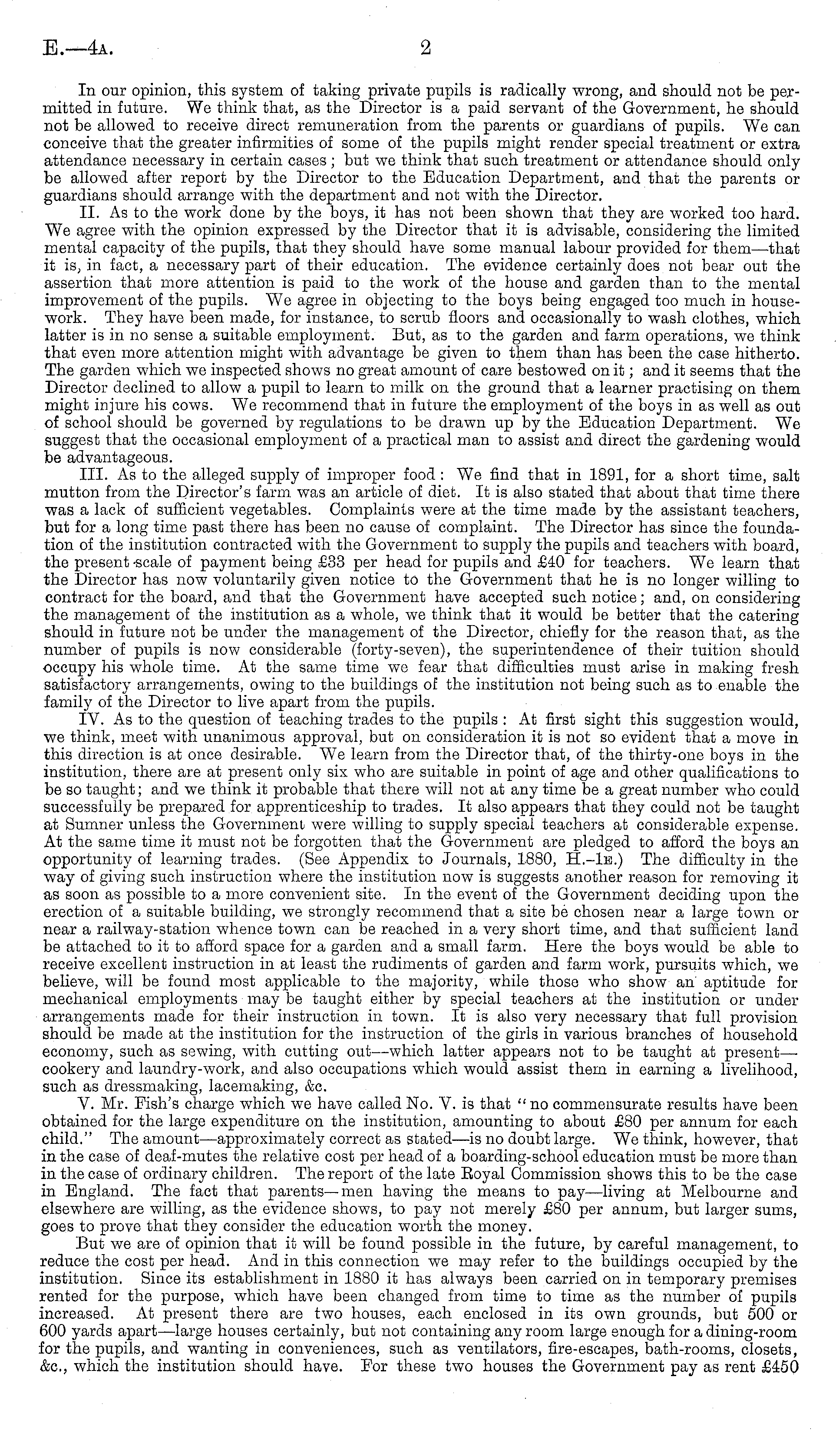 In our opinion, this system of taking private pupils is radically wrong, and should not be permitted in future. We think that, as the Director is a paid servant of the Government, he should not be allowed to receive direct remuneration from the parents or guardians of pupils. We can conceive that the greater infirmities of some of the pupils might render special treatment or extra attendance necessary in certain cases; but we think that such treatment or attendance should only be allowed after report by the Director to the Education Department, and that the parents or guardians should arrange with the department and not with the Director. 11. As to the work done by the boys, it has not been shown that they are worked too hard. We agree with the opinion expressed by the Director that it is advisable, considering the limited mental capacity of the pupils, that they should have some manual labour provided for them—that it is, in fact, a necessary part of their education. The evidence certainly does not bear out the assertion that more attention is paid to the work of the house and garden than to the mental improvement of the pupils. We agree in objecting to the boys being engaged too much in housework. They have been made, for instance, to scrub floors and occasionally to wash clothes, which latter is in no sense a suitable employment. But, as to the garden and farm operations, we think that even more attention might with advantage be given to them than has been the case hitherto. The garden which we inspected shows no great amount of care bestowed on it; and it seems that the Director declined to allow a pupil to learn to milk on the ground that a learner practising on them might injure his cows. We recommend that in future the employment of the boys in as well as out of school should be governed by regulations to be drawn up by the Education Department. We suggest that the occasional employment of a practical man to assist and direct the gardening would be advantageous. 111. As to the alleged supply of improper food : We find that in 1891, for a short time, salt mutton from the Director's farm was an article of diet. It is also stated that about that time there was a lack of sufficient vegetables. Complaints were at the time made by the assistant teachers, but for a long time past there has been no cause of complaint. The Director has since the foundation of the institution contracted with the Government to supply the pupils and teachers with board, the present -scale of payment being £33 per head for pupils and £40 for teachers. We learn that the Director has now voluntarily given notice to the Government that he is no longer willing to contract for the board, and that the Government have accepted such notice; and, on considering the management of the institution as a whole, we think that it would be better that the catering should in future not be under the management of the Director, chiefly for the reason that, as the number of pupils is now considerable (forty-seven), the superintendence of their tuition should occupy his whole time. At the same time we fear that difficulties must arise in making fresh satisfactory arrangements, owing to the buildings of the institution not being such as to enable the family of the Director to live apart from the pupils. IV. As to the question of teaching trades to the pupils : At first sight this suggestion would, we think, meet with unanimous approval, but on consideration it is not so evident that a move in this direction is at once desirable. We learn from the Director that, of the thirty-one boys in the institution, there are at present only six who are suitable in point of age and other qualifications to be so taught; and we think it probable that there will not at any time be a great number who could successfully be prepared for apprenticeship to trades. It also appears that they could not be taught at Sumner unless the Government were willing to supply special teachers at considerable expense. At the same time it must not be forgotten that the Government are pledged to afford the boys an opportunity of learning trades. (See Appendix to Journals, 1880, H.-le.) The difficulty in the way of giving such instruction where the institution now is suggests another reason for removing it as soon as possible to a more convenient site. In the event of the Government deciding upon the erection of a suitable building, we strongly recommend that a site be chosen near a large town or near a railway-station whence town can be reached in a very short time, and that sufficient land be attached to it to afford space for a garden and a small farm. Here the boys would be able to receive excellent instruction in at least the rudiments of garden and farm work, pursuits which, we believe, will be found most applicable to the majority, while those who show an' aptitude for niechanical employments may be taught either by special teachers at the institution or under arrangements made for their instruction in town. It is also very necessary that full provision should be made at the institution for the instruction of the girls in various branches of household economy, such as sewing, with cutting out—which latter appears not to be taught at present—■ cookery and laundry-work, and also occupations which would assist them in earning a livelihood, such as dressmaking, lacemaking, &c. V. Mr. Fish's charge which we have called No. V. is that " no commensurate results have been obtained for the large expenditure on the institution, amounting to about £80 per annum for each child." The amount —approximately correct as stated—is no doubt large. We think, however, that in the case of deaf-mutes the relative cost per head of a boarding-school education must be more than in the case of ordinary children. The report of the late Boyal Commission shows this to be the case in England. The fact that parents—men having the means to pay —living at Melbourne and elsewher