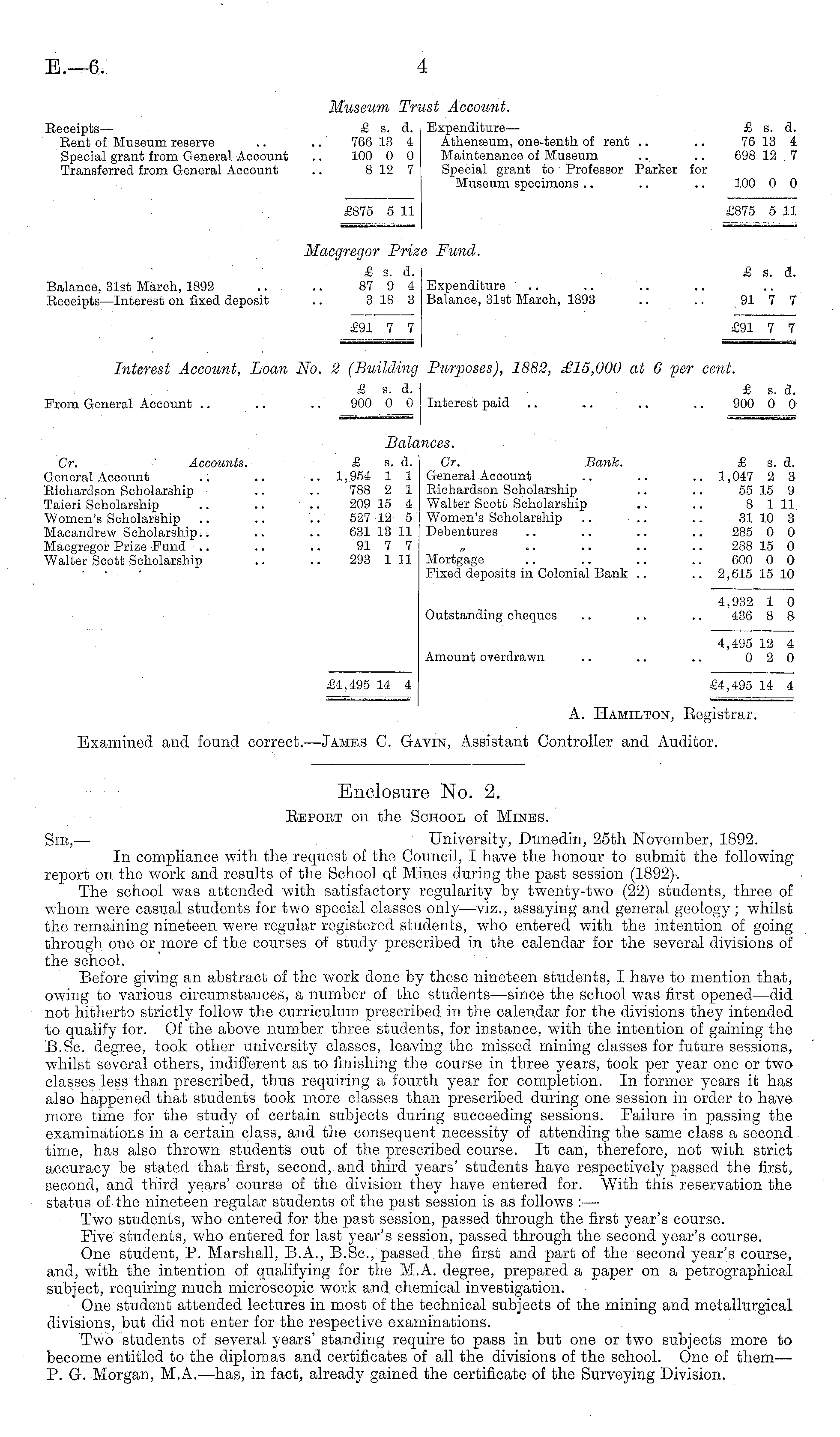 Museum Trust Account. Receipts— £ s. d. Expenditure— £ s. d. Kent of Museum reserve .. .. 766 13 4 Athenaeum, one-tenth of rent .. .. 76 13 4 Special grant from General Account .. 100 0 0 Maintenance of Museum .. .. 698 12 7 Transferred from General Account .. 8 12 7 Special grant to Professor Parker for Museum specimens .. .. .. 100 0 0 ,-£875 5 11 £875 5 11 Macgregor Prize Fund. £ s. a. £ s. d. Balance, 31st March, 1892 .. .. 87 9 4 Expenditure Eeceipts —Interest on fixed deposit .. 318 3 Balance, 31st March, 1893 .. .. 91 7 7 £91 7 7 £91 7 7 Interest Account, Loan No. 2 (Building Purposes), 1882, £15,000 at 6 per cent. £ s. d. £ s. d. From General Account .. .. .. 900 0 0 Interest paid .. .. .. .. 900 0 0 Balances. Or. Accounts. £ s. d. Or. Bank. £ s. d. General Account .. .. .. 1,954 1 1 General Account .. .. .. 1,047 2 3 Bichardson Scholarship .. .. 788 2 1 Richardson Scholarship .. .. 55 15 9 Taieri Scholarship .. .. .. 209 15 4 Walter Scott Scholarship .. .. 8 111. Women's Scholarship .. .. .. 527 12 5 Women's Scholarship .. .. .. 31 10 3 Macandrew Scholarship.. .. .. 63113 11 Debentures .. .. .. .. 285 0 0 Macgregor Prize Fund .. .. .. 91 7 7 „ .. .. .. .. 288 15 0 Walter Scott Scholarship .. .. 293 1 31 Mortgage .. .. .. .. 600 0 0 • ■ ' Fixed deposits in Colonial Bank .. .. 2,615 15 10 4,932 1 0 Outstanding cheques .. .. .. 436 8 8 4,495 12 4 Amount overdrawn .. .. .. 0 2 0 £4,495 14 4 £4,495 14 4 A. Hamilton, Registrar. Examined and found correct. —James C. Gavin, Assistant Controller and Auditor. Enclosure No. 2. Bepobt on the School of Mines. Sic, — University, Dunedin, 25th November, 1892. In compliance with the request of the Council, I have the honour to submit the following report on the work and results of the School oi Mines during the past session (1892). The school was attended with satisfactory regularity by twenty-two (22) students, three of whom were casual students for two special classes only—viz., assaying and general geology; whilst the remaining nineteen were regular registered students, who entered with the intention of going through one or more of the courses of study prescribed in the calendar for the several divisions of the school. Before giving an abstract of the work done by these nineteen students, I have to mention that, owing to various circumstances, a number of the students—since the school was first opened—did not hitherto strictly follow the curriculum prescribed in the calendar for the divisions they intended to qualify for. Of the above number three students, for instance, with the intention of gaining the B.Sc. degree, took other university classes, leaving the missed mining classes for future sessions, whilst several others, indifferent as to finishing the course in three years, took per year one or two classes less than prescribed, thus requiring a fourth year for completion. In former years it has also happened that students took more classes than prescribed during one session in order to have more time for the study of certain subjects during succeeding sessions. Failure in passing the examinations in a certain class, and the consequent necessity of attending the same class a second time, has also thrown students out of the prescribed course. It can, therefore, not with strict accuracy be stated that first, second, and third years' students have respectively passed the first, second, and third years' course of the division they have entered for. With this reservation the status of the nineteen regular students of the past session is as follows : — Two students, who entered for the past session, passed through the first year's course. Five students, who entered for last year's session, passed through the second year's course. One student, P. Marshall, 8.A., B.Sc, passed the first and part of the second year's course, and, with the intention of qualifying for the M.A. degree, prepared a paper on a petrographical subject, requiring much microscopic work and chemical investigation. One student attended lectures in most of the technical subjects of the mining and metallurgical divisions, but did not enter for the respective examinations. Two students of several years' standing require to pass in but one or two subjects more to become entitled to the diplomas and certificates of all the divisions of the school. One of them— P. G. Morgan, M.A.—has, in fact, already gained the certificate of the Surveying Division.
