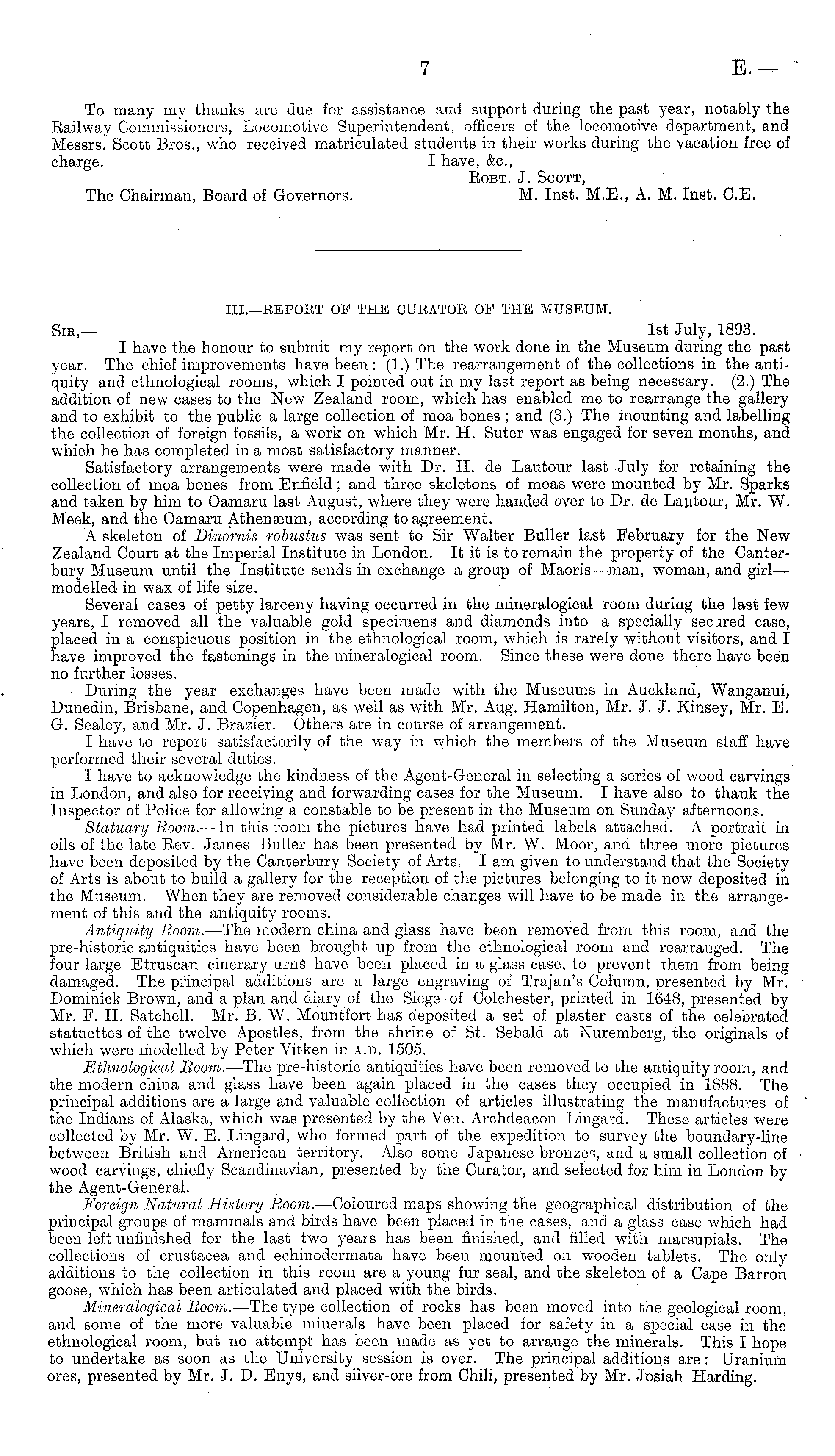 To many my thanks are due for assistance aud support during the past year, notably the Bailway Commissioners, Locomotive Superintendent, officers of the locomotive department, and Messrs. Scott Bros., who received matriculated students in their works during the vacation free of charge. I have, &c, Bobt. J. Scott, The Chairman, Board of Governors. M. Inst. M.E., A. M. Inst. CE. lII.—REPORT OP THE CURATOR OP THE MUSEUM. Sic,— Ist July, 1893. I have the honour to submit my report on the work done in the Museum during the past year. The chief improvements have been: (1.) The rearrangement of the collections in the antiquity and ethnological rooms, which I pointed out in my last report as being necessary. (2.) The addition of new cases to the New Zealand room, which has enabled me to rearrange the gallery and to exhibit to the public a large collection of moa bones ; and (3.) The mounting and labelling the collection of foreign fossils, a work on which Mr. H. Suter was engaged for seven months, and which he has completed in a most satisfactory manner. Satisfactory arrangements were made with Dr. H. de Lautour last July for retaining the collection of moa bones from Enfield; and three skeletons of moas were mounted by Mr. Sparks and taken by him to Oamaru last August, where they were handed over to Dr. de Lautour, Mr. W. Meek, and the Oamaru Athenaeum, according to agreement. A skeleton of Dinornis robustus was sent to Sir Walter Buller last February for the New Zealand Court at the Imperial Institute in London. It it is to remain the property of the Canterbury Museum until the Institute sends in exchange a group of Maoris —man, woman, and girl— modelled- in wax of life size. Several cases of petty larceny having occurred in the mineralogical room during the last few years, I removed all the valuable gold specimens and diamonds into a specially secired case, placed, in a conspicuous position in the ethnological room, which is rarely without visitors, and I have improved the fastenings in the mineralogical room. Since these were done there have been no further losses. During the year exchanges have been made with the Museums in Auckland, Wanganui, Dunedin, Brisbane, and Copenhagen, as well as with Mr. Aug. Hamilton, Mr. J. J. Kinsey, Mr. E. G. Sealey, and Mr. J. Brazier. Others are in course of arrangement. I have to report satisfactorily of the way in which the members of the Museum staff have performed their several duties. I have to acknowdedge the kindness of the Agent-General in selecting a series of wood carvings in London, and also for receiving and forwarding cases for the Museum. I have also to thank the Inspector of Police for allowing a constable to be present in the Museum on Sunday afternoons. Statuary Boom. —In this room the pictures have had printed labels attached. A portrait in oils of the late Bey. James Buller has been presented by Mr. W. Moor, and three more pictures have been deposited by the Canterbury Society of Arts. lam given to understand that the Society of Arts is about to build a gallery for the reception of the pictures belonging to it now deposited in the Museum. When they are removed considerable changes will have to be made in the arrangement of this and the antiquity rooms. Antiquity Boom. —The modern china and glass have been removed from this room, and the pre-historic antiquities have been brought up from the ethnological room and rearranged. The four large Etruscan cinerary urnS have been placed in a glass case, to prevent them from being damaged. The principal additions are a large engraving of Trajan's Column, presented by Mr. Dominick Brown, and a plan and diary of the Siege of Colchester, printed in 1648, presented by Mr. F. H. Satchell. Mr. B. W. Mountfort has deposited a set of plaster casts of the celebrated statuettes of the twelve Apostles, from the shrine of St. Sebald at Nuremberg, the originals of which were modelled by Beter Vitken in a.d. 1505. Ethnological Boom. —The pre-historic antiquities have been removed to the antiquity room, and the modern china and glass have been again placed in the cases they occupied in 1888. The principal additions are a large and valuable collection of articles illustrating the manufactures of the Indians of Alaska, which was presented by the Veil. Archdeacon Lingard. These articles were collected by Mr. W. E. Lingard, who formed part of the expedition to survey the boundary-line between British and American territory. Also some Japanese bronzes, and a small collection of wood carvings, chiefly Scandinavian, presented by the Curator, and selected for him in London by the Agent-General. Foreign Natural History Boom. —Coloured maps showing the geographical distribution of the principal groups of mammals and birds have been placed in the cases, and a glass case which had been left unfinished for the last two years has been finished, and filled with marsupials. The collections of Crustacea and echinodermata have been mounted on wooden tablets. The only additions to the collection in this room are a young fur seal, and the skeleton of a Cape Barron goose, which has been articulated and placed with the birds. Mineralogical Boom. —The type collection of rocks has been moved into the geological room, and some of the more valuable minerals have been placed for safety in a special case in the ethnological room, but no attempt has been made as yet to arrange the minerals. This I hope to undertake as soon as the University session is over. The principal additions are : Uranium ores, presented by Mr. J. D. Enys, and silver-ore from Chili, presented by Mr. Josiah Harding.