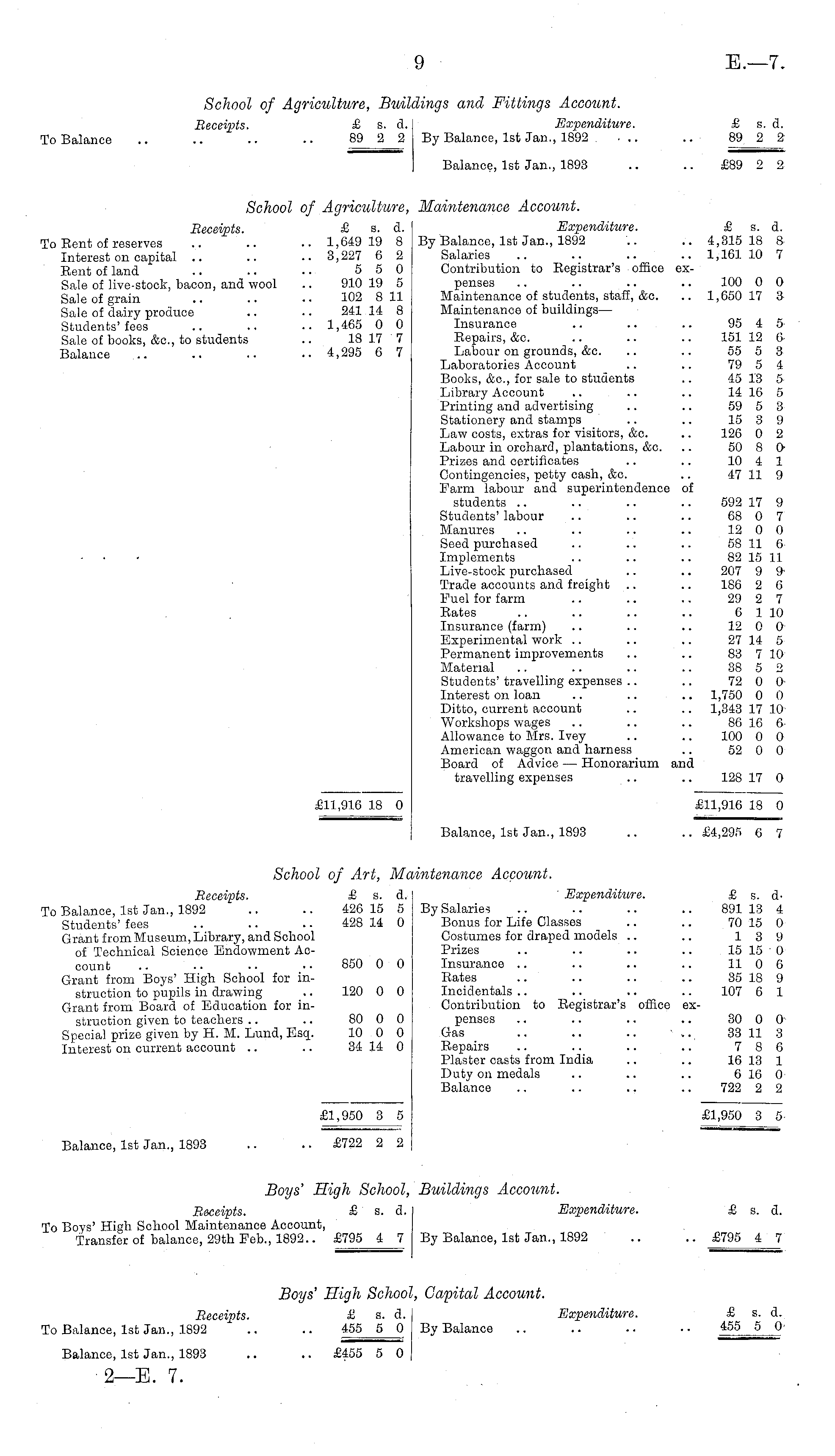 School of Agriculture, Buildings and Fittings Account. Receipts. £ s. d. Expenditure. £ s. d. To Balance .. .. .. .. 89 2 2 By Balance, Ist Jan., 1892 ... .. 89 2 2 Balance, Ist Jan., 1893 .. .. £89 2 2 School of Agriculture, Maintenance Account. Receipts. £ s. d. Expenditure. £ s. d. To Rent of reserves .. .. .. 1,649 19 8 By Balance, Ist Jan., 1892 '.. .. 4,315 18 8 Interest on capital .. .. .. 3,227 6 2 Salaries .. .. .. .. 1,16110 7 Rent of land .. .. .. 5 5 0 Contribution to Registrar's office exSale of live-stock, bacon, and wool .. 910 19 5 penses .. .. .. .. 100 0 0 Sale of grain .. .. .. 102 811 Maintenance of students, staff, &c. .. 1,650 17 3 Sale of dairy produce .. .. 241 14 8 Maintenance of buildingsStudents'fees .. .. .. 1,465 0 0 Insurance .. .. .. 95 4 5 Sale of hooks, &c, to students .. 18 17 7 Repairs, &o. .. -. .. 151 12 6 Balance .. .. .. .. 4,295 6 7 Labour on grounds, &c. .. .. 55 5 3 Laboratories Account .. .. 79 5 4 Books, &c, for sale to students .. 45 13 5 Library Account .. .. .. 14 16 5 Printing and advertising .. .. 59 5 3 Stationery and stamps .. .. 15 3 9 Law costs, extras for visitors, &o. .. 126 0 2 Labour in orchard, plantations, &c. .. 50 8 D Prizes and certificates .. .. 10 4 1 Contingencies, petty cash, &c. .. 47 11 9 Farm labour and superintendence of students .. .. .. .. 592 17 9 Students' labour .. .. .. 68 0 7 Manures .. .. .. .. 12 0 0 Seed purchased .. .. .. 58 11 6 Implements .. .. .. 82 15 11 Live-stock purchased .. .. 207 9 9 Trade accounts and freight .. .. 186 2 6 Fuel for farm .. .. .. 29 2 7 Rates .. .. .. .. 6 1 10 Insurance (farm) .. .. .. 12 0 0 Experimental work .. .. .. 27 14 5 Permanent improvements .. .. 83 710 Material .. .. .. .. 38 5 2 Students' travelling expenses .. .. 72 0 0 Interest on loan .. .. .. 1,750 0 0 Ditto, current account .. .. 1,343 17 10 Workshops wages .. .. .. 80 16 6 Allowance to Mrs. Ivoy .. .. 100 0 0 American waggon and harness .. 52 0 0 Board of Advice — Honorarium and travelling expenses .. .. 128 17 0 £11,916 18 0 £11,916 18 0 Balance, Ist Jan., 1893 .. .. £4,295 6 7 School of Art, Maintenance Account. Beceipts. £ s. d. ' Expenditure. £ g. dTo Balance, Ist Jan., 1892 .. .. 426 15 5 By Salaries .. .. .. .. 891 13 4 Students' fees .. .. .. 428 14 0 Bonus for Life Classes .. .. 70 15 0 Grant from Museum, Library, and School Costumes for draped models .. .. 13 9 of Technical Science Endowment Ac- Prizes .. .. .. .. 15 15 • 0 count .. •• •• •■ 850 0 0 Insurance .. .. .. .. 11 0 6 Grant from Boys' High School for in- Rates .. .. .. .. 35 18 9 struction to pupils in drawing .. 120 0 0 Incidentals .. .. .. .. 107 6 1 Grant from Board of Education for in- Contribution to Registrar's office exstruction given to teachers .. .. 80 0 0 penses .. .. .. .. 30 0 0 Special prize given by H. M. Lund, Esq. 10 0 0 Gas .. .. .. .. 33 11 3 Interest on current account .. .. 34 14 0 Repairs .. .. .. .. 7 8 6 Plaster casts from India .. .. 16 13 1 Duty on medals .. .. .. 6 16 0 Balance .. .. .. .. 722 2 2 £1,950 3 5 £1,950 3 5Balance, Ist Jan., 1893 .. .. £722 2 2 Boys' High School, Buildings Account. Beceipts. £ s. d. Expenditure. £ s. d. To Boys' High School Maintenance Account, Transfer of balance, 29th Feb., 1892.. £795 4 7 By Balance, Ist Jan., 1892 .. .. £795 4 7 Boys' High School, Capital Account. Beceipts. £ s. d. I Expenditure. £ s. d. To Balance, Ist Jan., 1892 .. .. 455 5 0 By Balance .. .. .. •• 455 5 0 Balance, Ist Jan., 1893 .. .. £455 5 0| •2—E. 7.