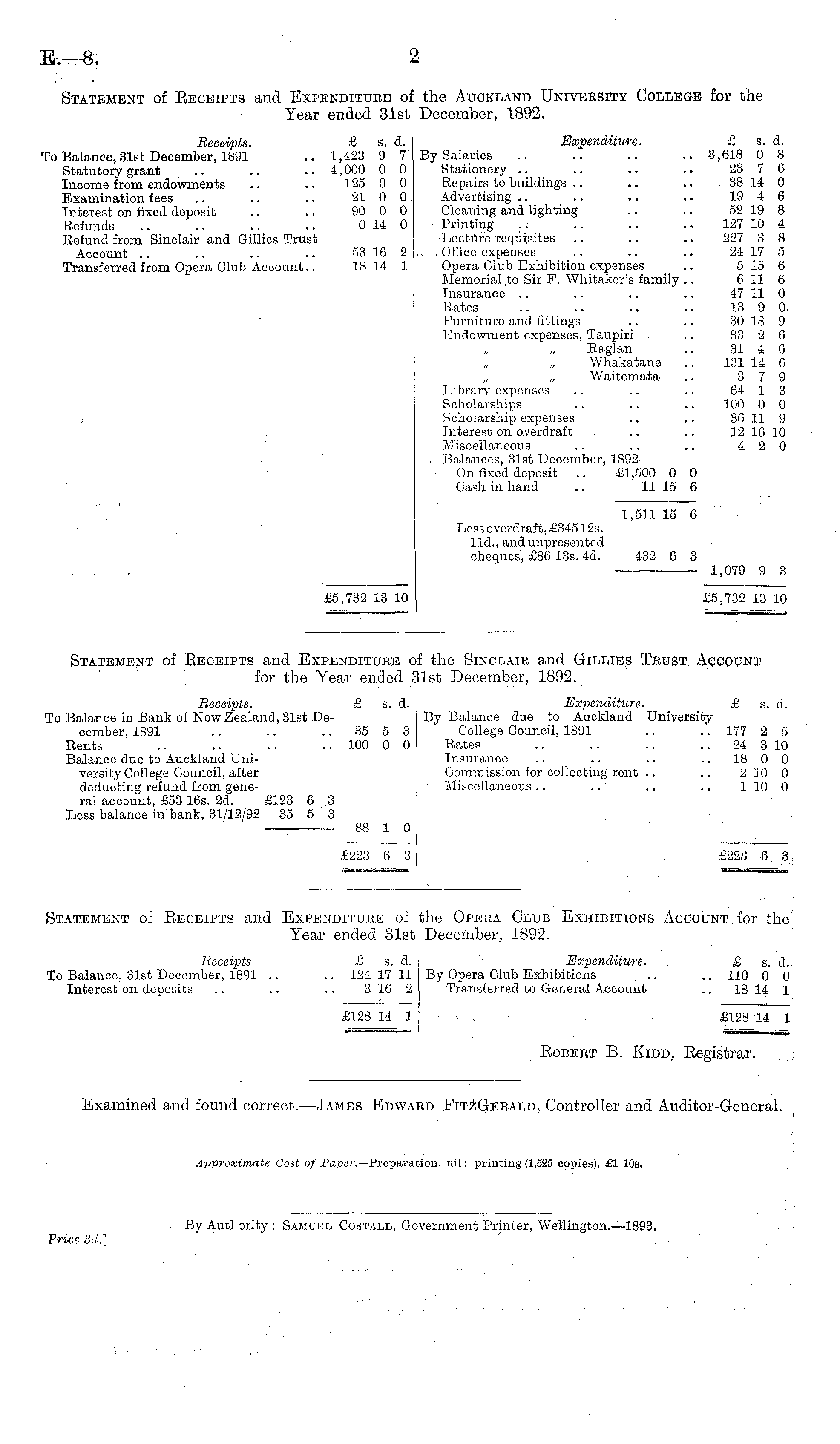 Statement of Eeceipts and Expendituee of the Auckland University College for the Year ended 31st December, 1892. Receipts. S s. d. Expenditure. £ s. d. To Balance, 31st December, 1891 .. 1,423 9 7 By Salaries .. .. .. .. 3,618 0 8 Statutory grant .. .. .. 4,000 0 0 Stationery .. .. .. .. 23 7 6 Income from endowments .. .. 125 0 0 Repairs to buildings .. .. .. 38 14 0 Examination fees .. .. .. 21 0 0 Advertising.. .. .. .. 19 4 6 Interest on fixed deposit .. .. 90 0 0 Cleaning and lighting .. .. 52 19 8 Refunds .. .. .. .. 014 0 Printing .. .. .. .. 127 10 4 Refund from Sinclair and Gillies Trust Lecture requisites .. .. .. 227 3 8 Account .. .. .. .. 53 1C 2 . Office expenses .. .. .. 24 17 5 Transferred from Opera Club Account.. 18 14 1 Opera Club Exhibition expenses .. 5 15 6 Memorial ,to Sir P. Whitaker's family .. 6 11 6 Insurance .. .. .. .. 47 11 0 Rates .. .. .. .. 13 9 0 Furniture and fittings .. .. 30 18 9 Endowment expenses, Taupiri .. 33 2 6 Raglan .. 31 4 6 Whakatane .. 131 14 6 Waitemata .. 3 7 9 Library expenses .. .. .. 64 1 3 Scholarships .. .. .. 100 0 0 Scholarship expenses .. .. 36 11 9 Interest on overdraft - .. 12 16 10 Miscellaneous .. .. .. 4 2 0 Balances, 31st December, 1892— On fixed deposit .. £1,500 0 0 Cash in hand .. 11 15 6 1,511 15 0 Less overdraft, £345125. lid., and unpresented cheques, £86 13s. 4d. 432 6 3 1 f~I7Q Q o. . x, \j i j y o . £5,732 13 10 £5,732 13 10