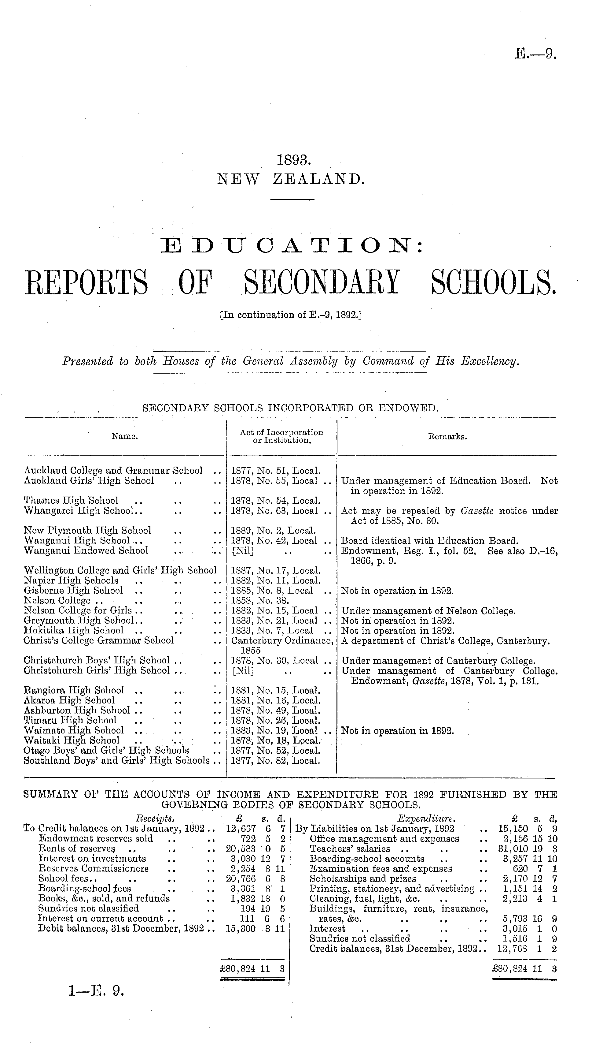 EDUCATION: REPORTS OF SECONDARY SCHOOLS. [In continuation of E.-9, 1892.]